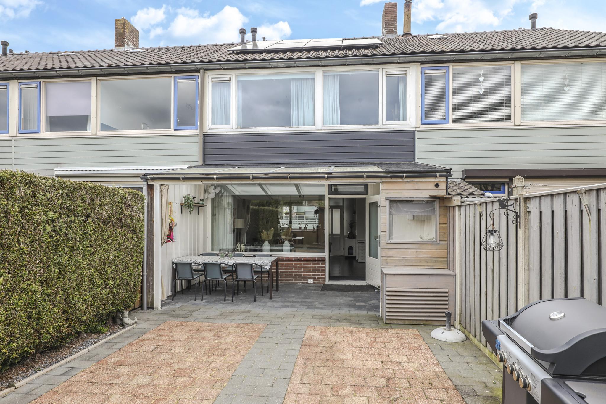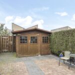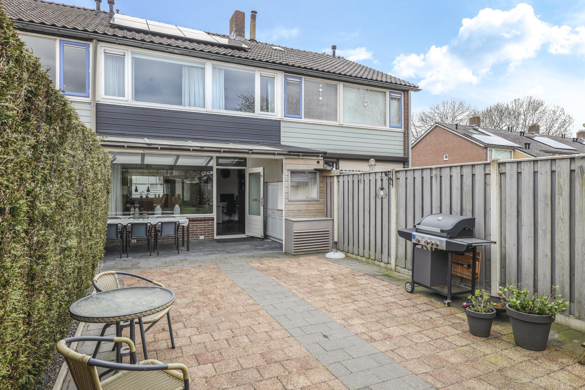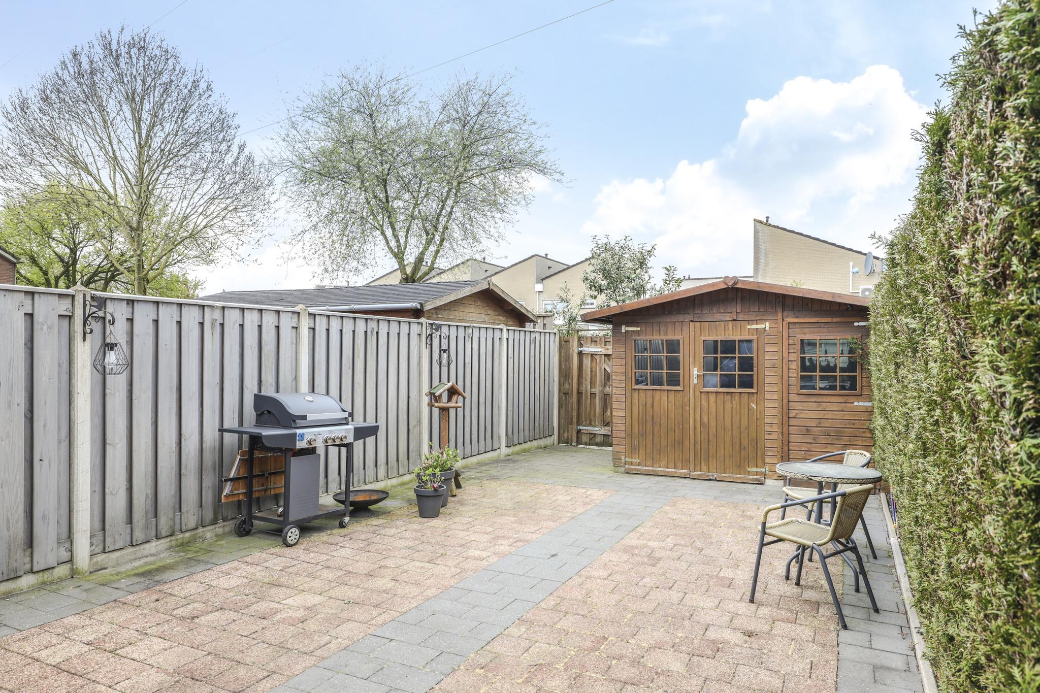 Naast een diepe voortuin, is ook de achtertuin zeker de moeite waard. De achtertuin is ingericht met een groot terras waardoor het een onderhoudsvriendelijk karakter heeft. De ligging van de tuin is op het westen waardoor je van veel zon geniet. Direct aan de woning is een veranda geplaatst. Door het gebruik van licht doorlatende dakplaten is dit een lichte ruimte. Ook zijn er inbouwspots geplaatst. Erg praktisch is dat hier keukenkastjes zijn geplaatst waardoor je hier veel opbergruimte hebt. De tuin is verder onderhoudsvriendelijk aangelegd waarbij een groene erfafscheiding met de buren voor een groene uitstraling zorgt. De schuur achter in de tuin is voorzien van dubbele deuren, naast de schuur is een achterom aanwezig.