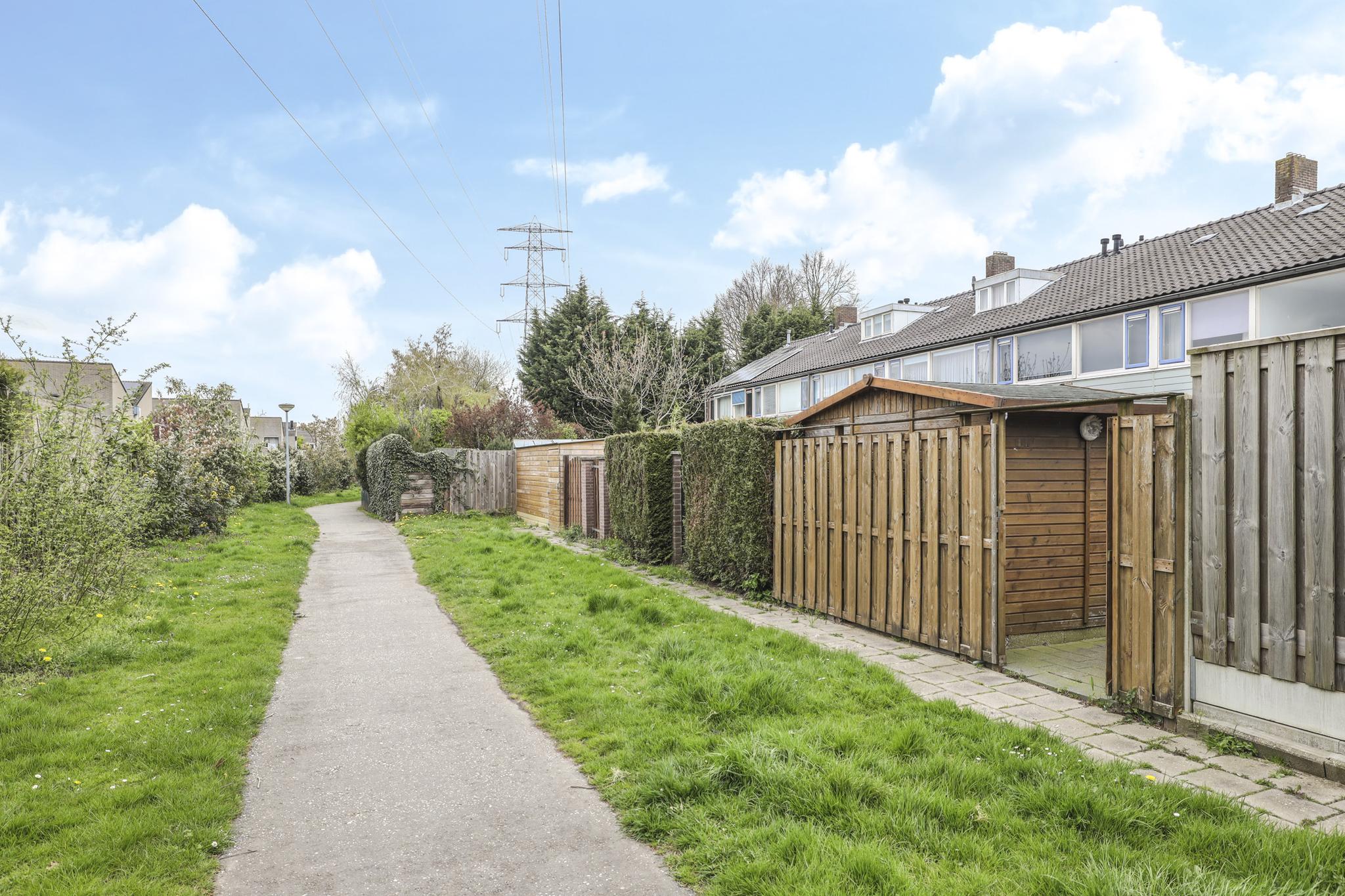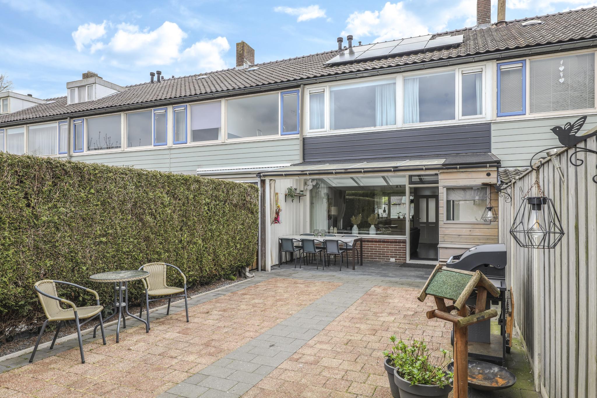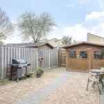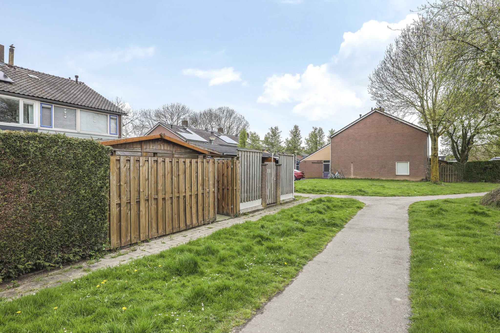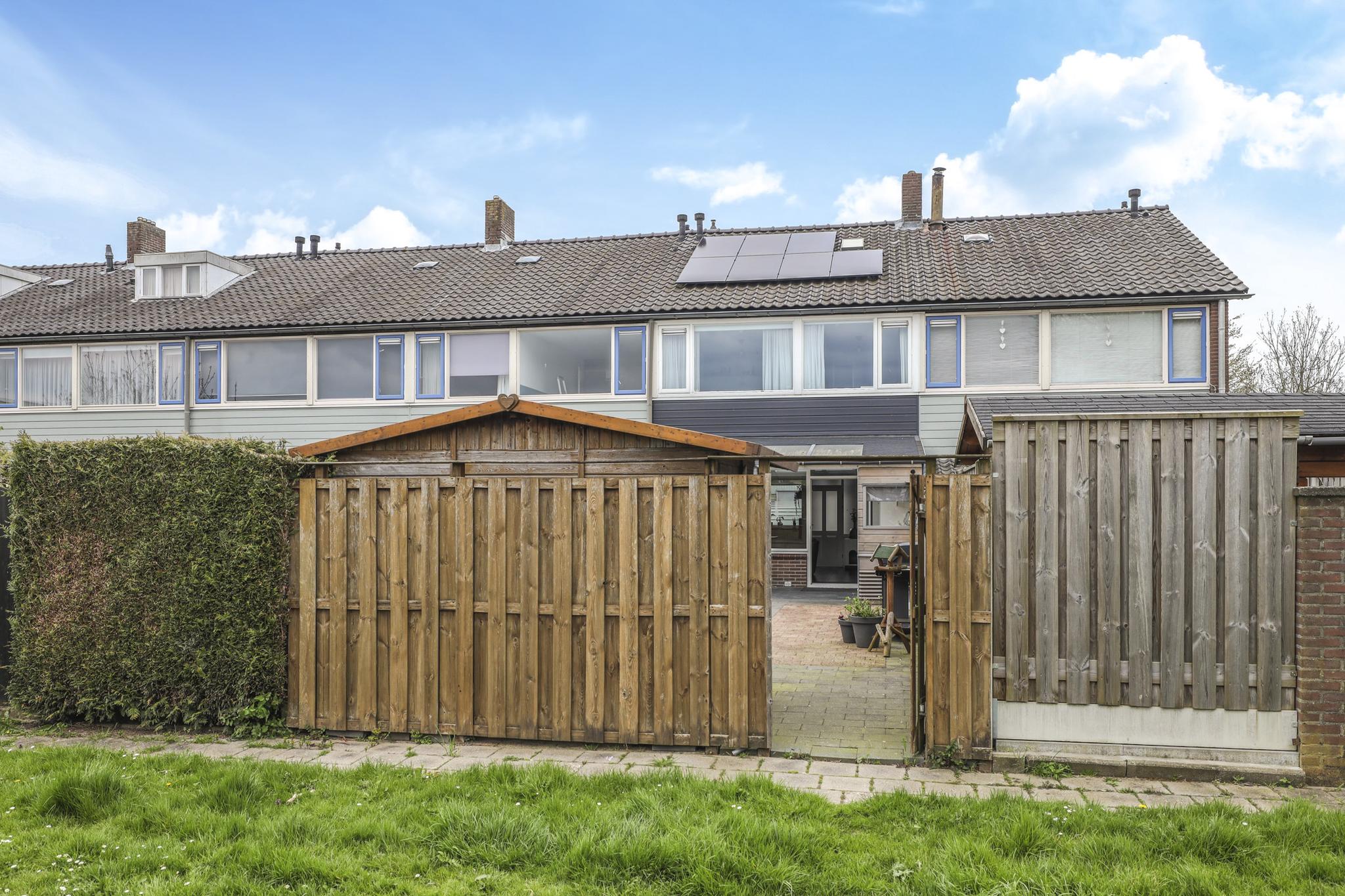 Naast een diepe voortuin, is ook de achtertuin zeker de moeite waard. De achtertuin is ingericht met een groot terras waardoor het een onderhoudsvriendelijk karakter heeft. De ligging van de tuin is op het westen waardoor je van veel zon geniet. Direct aan de woning is een veranda geplaatst. Door het gebruik van licht doorlatende dakplaten is dit een lichte ruimte. Ook zijn er inbouwspots geplaatst. Erg praktisch is dat hier keukenkastjes zijn geplaatst waardoor je hier veel opbergruimte hebt. De tuin is verder onderhoudsvriendelijk aangelegd waarbij een groene erfafscheiding met de buren voor een groene uitstraling zorgt. De schuur achter in de tuin is voorzien van dubbele deuren, naast de schuur is een achterom aanwezig.
