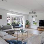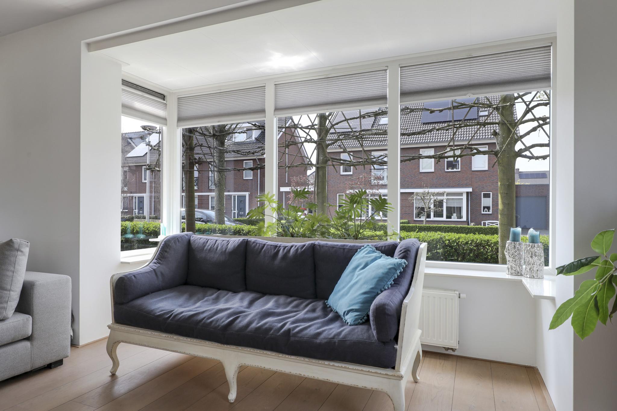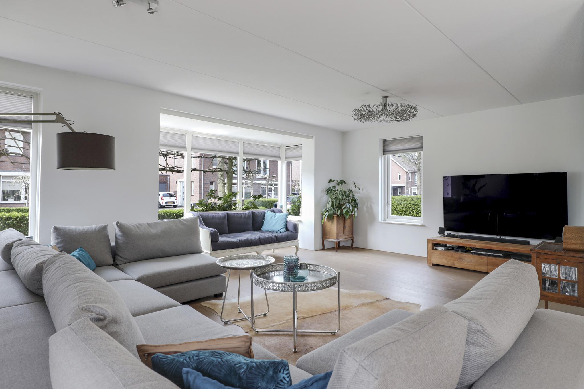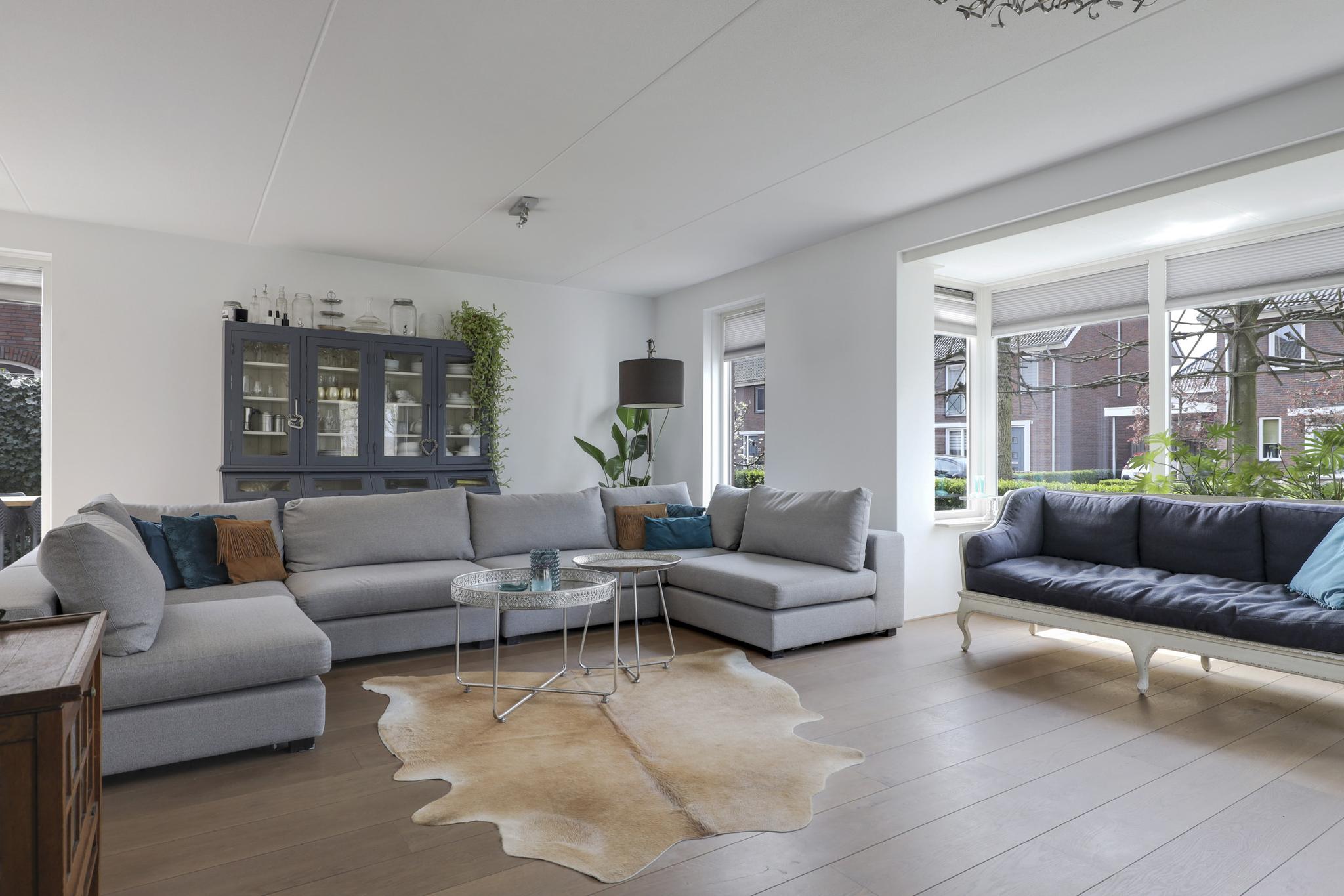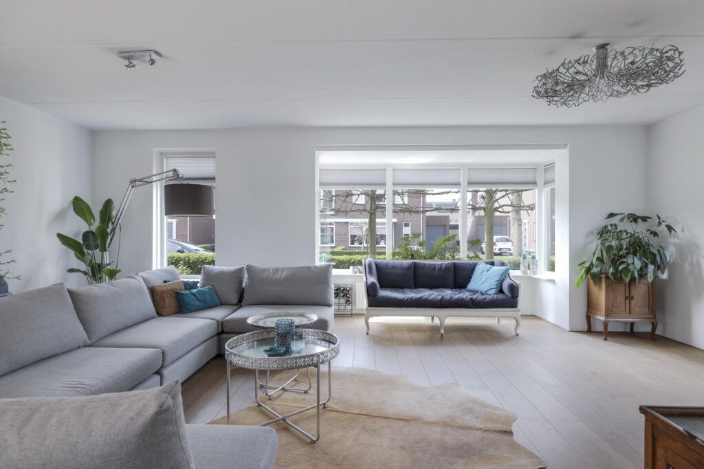 Woonkamer (L-indeling) met erker (voorzijde) en dubbele terrasdeuren (achterzijde)