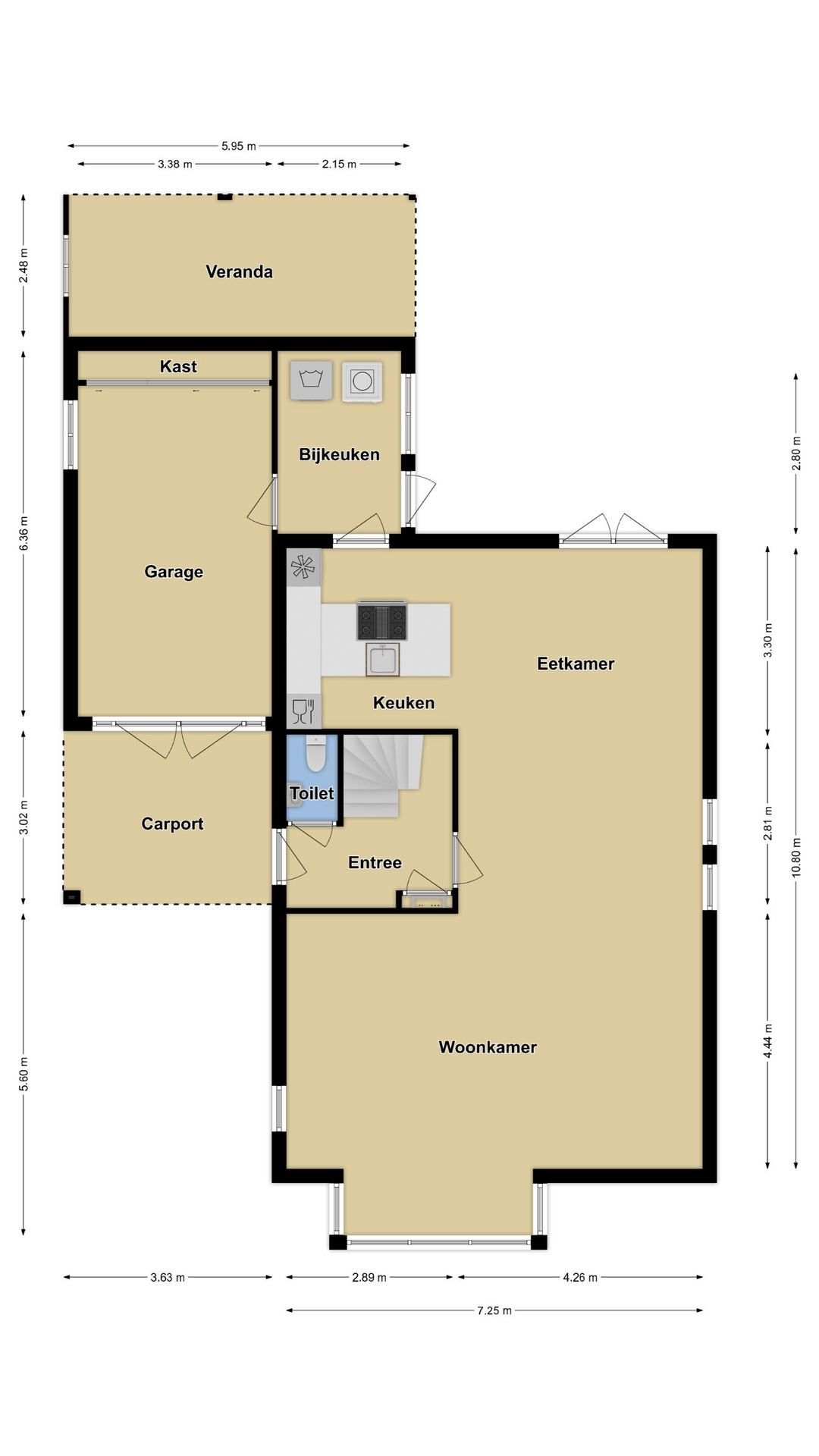 Inpandige garage met vaste schuif/kastenwand en dubbele deuren naar carport/oprit.