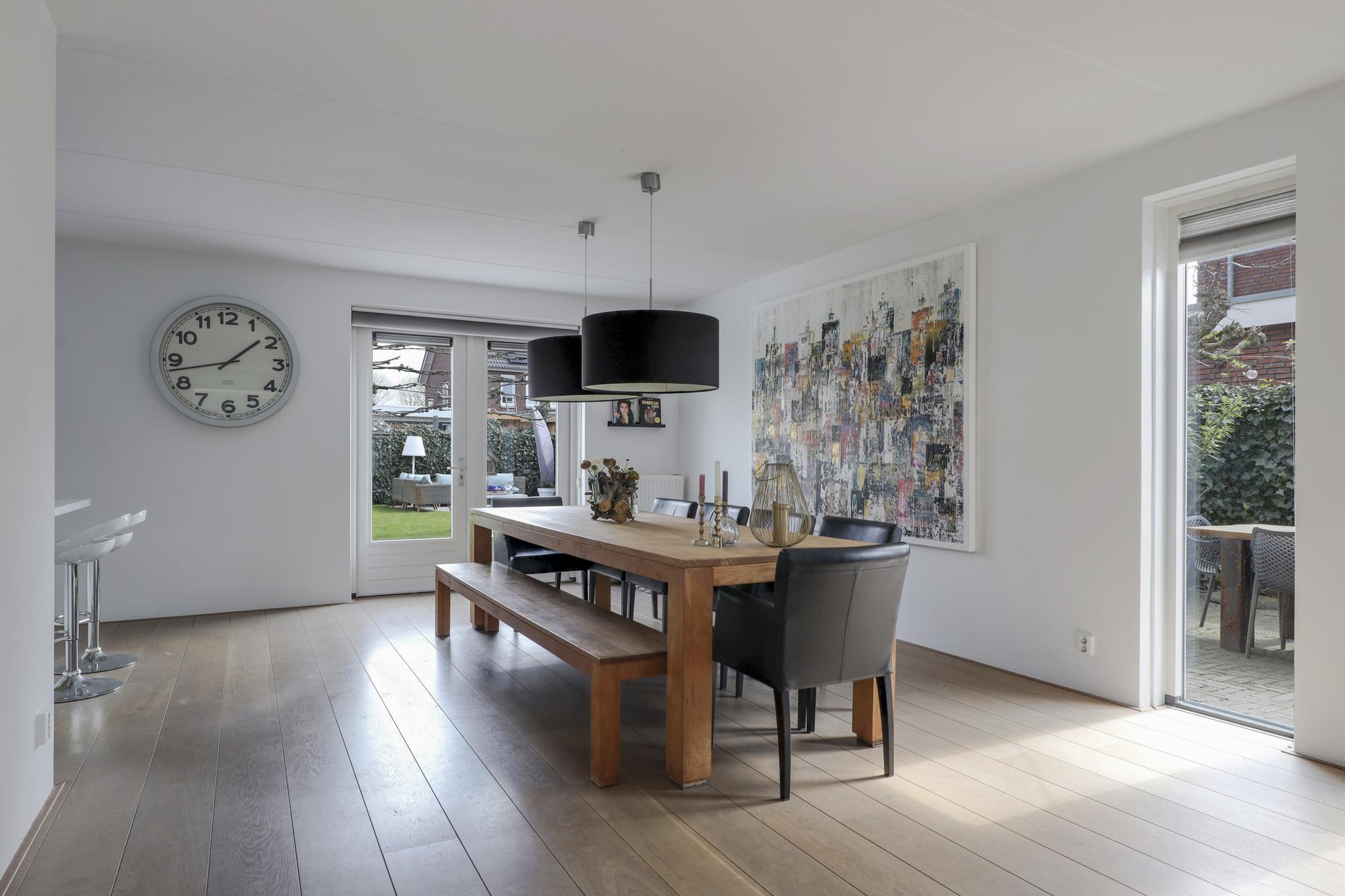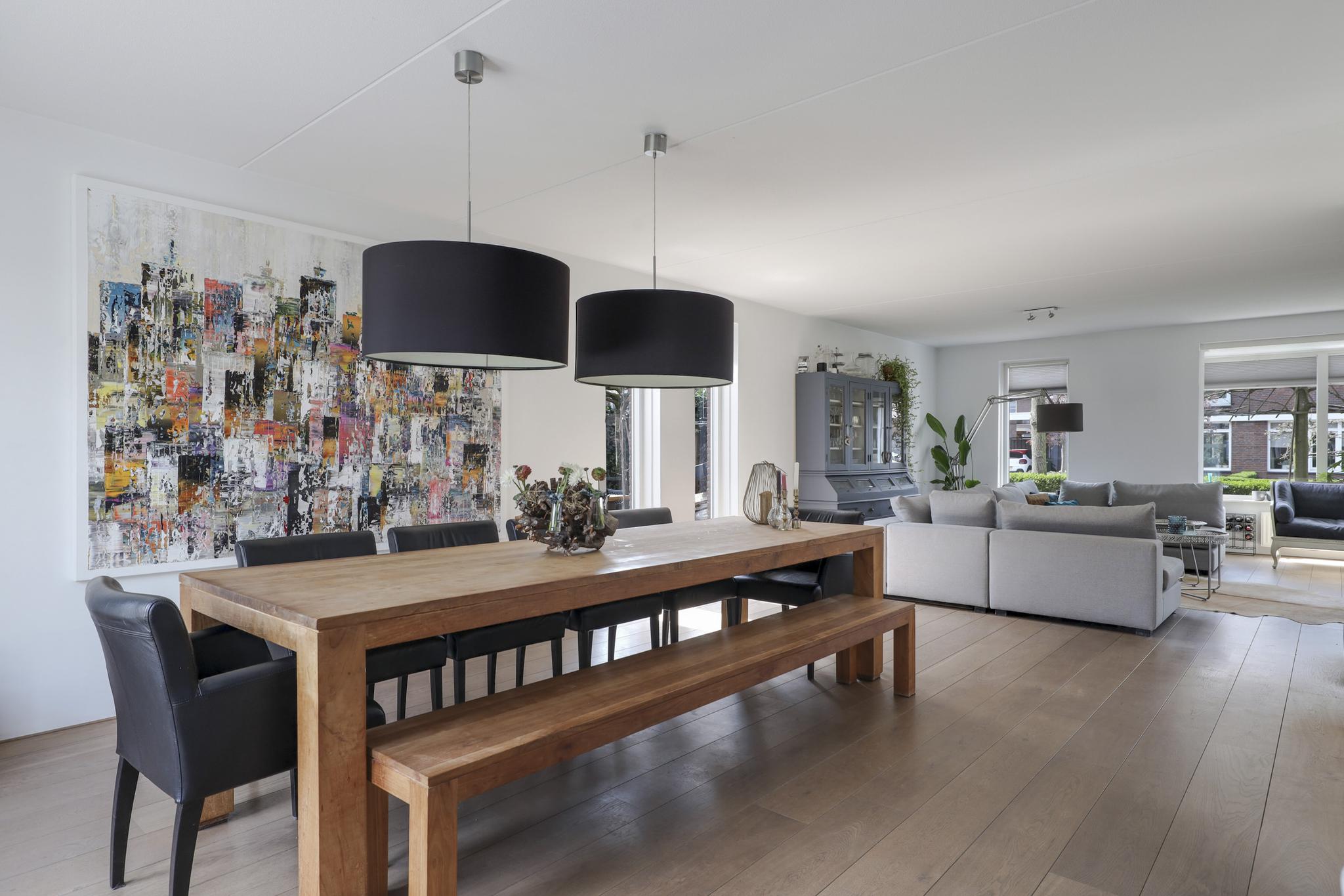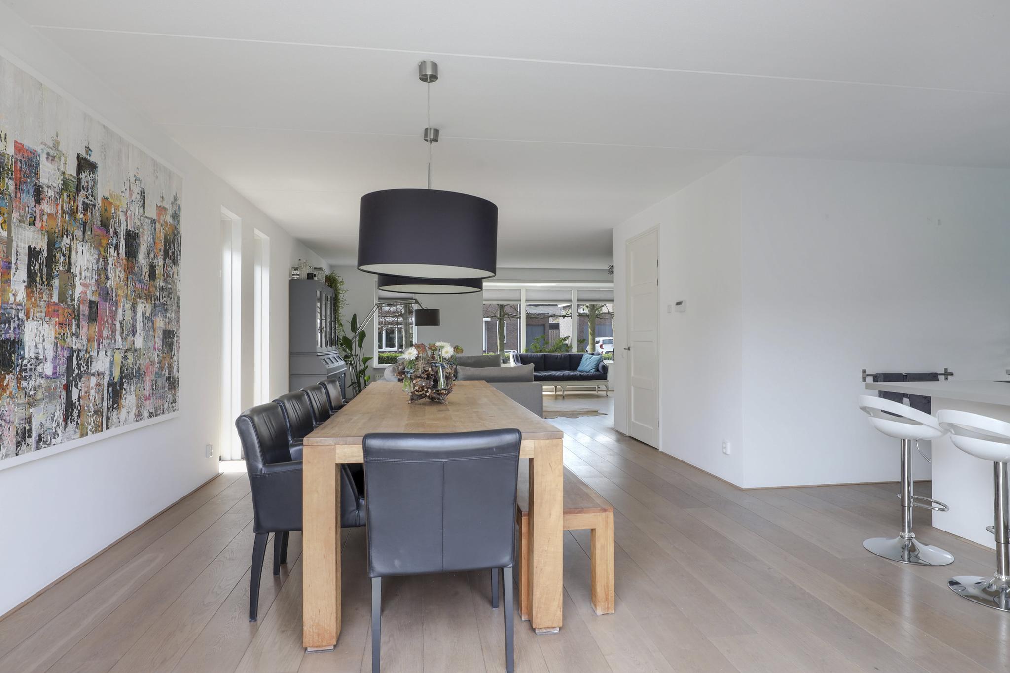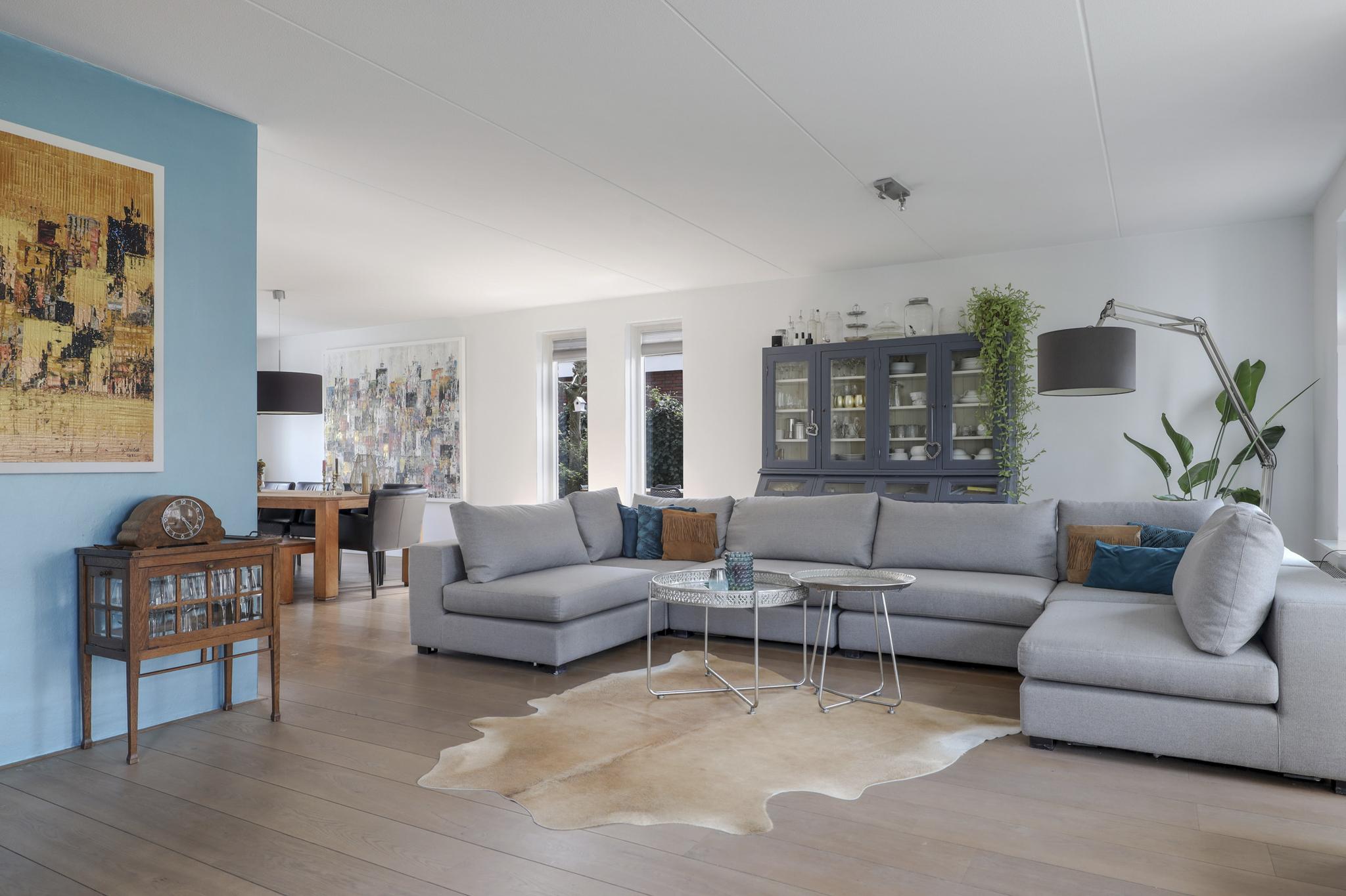 Een living doet al snel vermoeden of dat de woonkamer ruim is, maar hier is dat ook daadwerkelijk het geval. De living heeft een royale L-indeling en is ca. 63m2 (!) groot. Aan de voorzijde kun je met gemak een grote hoek/loungebank kwijt zonder dat het ten koste gaat van het ruimtelijke gevoel. Ook is er plek voor een speelhoek voor kinderen en een 10-persoons eettafel bij de keuken. Noemenswaardig is de massief eikenhouten vloer die er niet alleen strak (vernageld) in ligt, maar ook voor een warme, huiselijke woonsfeer zorgt. En hou je van het buitenleven? Dan zet je lekker de dubbele tuindeuren open waardoor je het buitenterras bij je woonkamer betrekt.