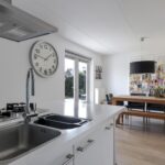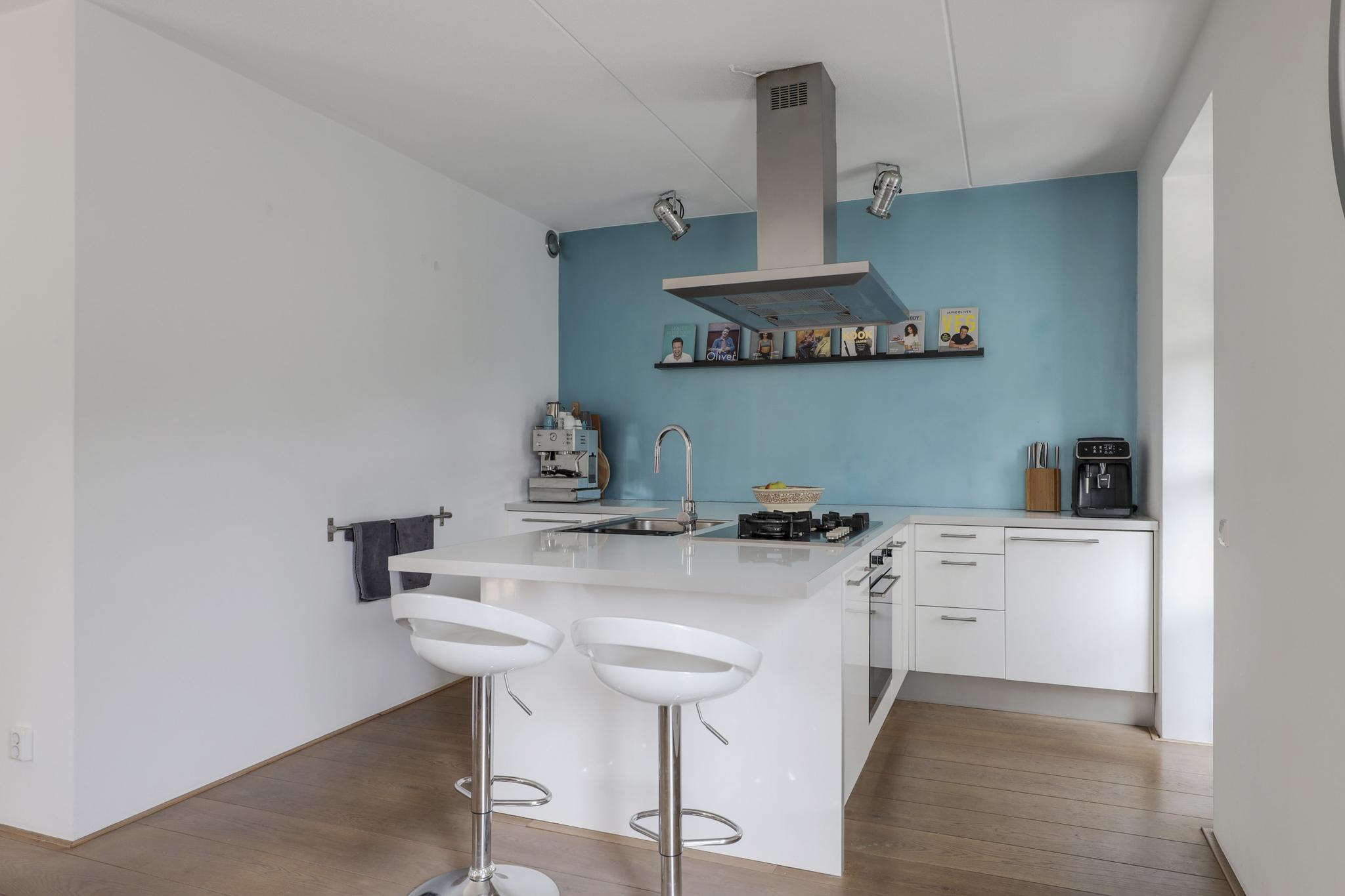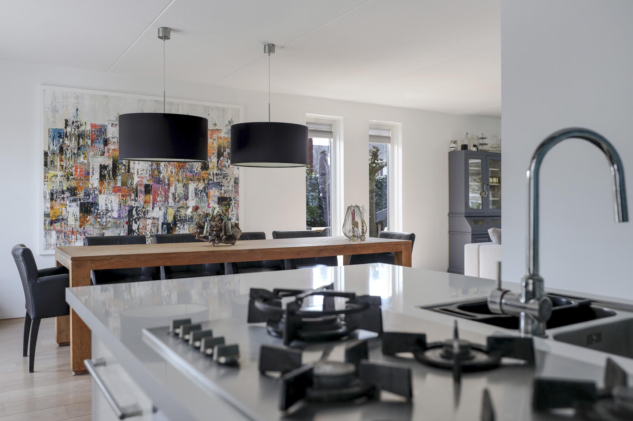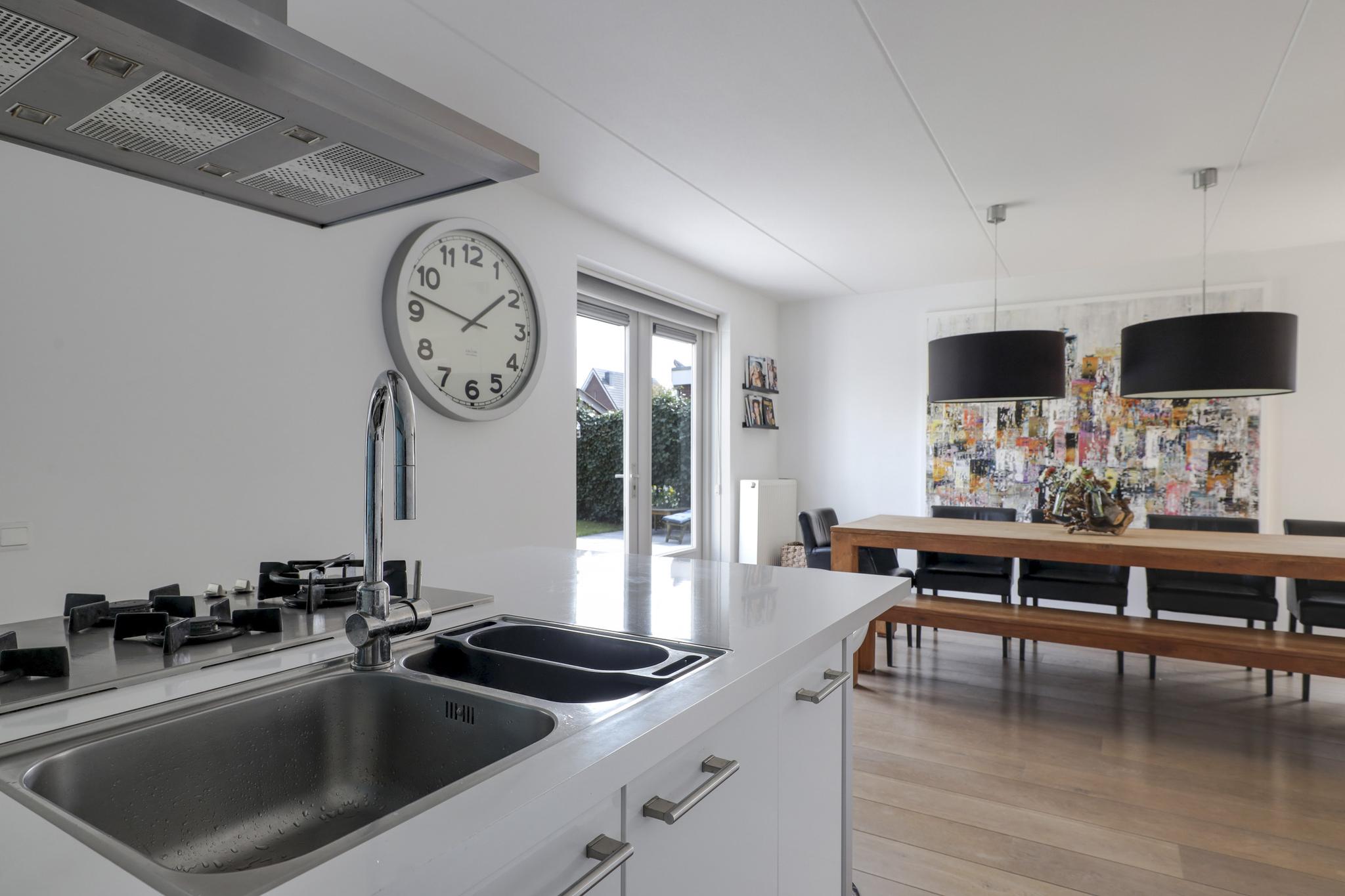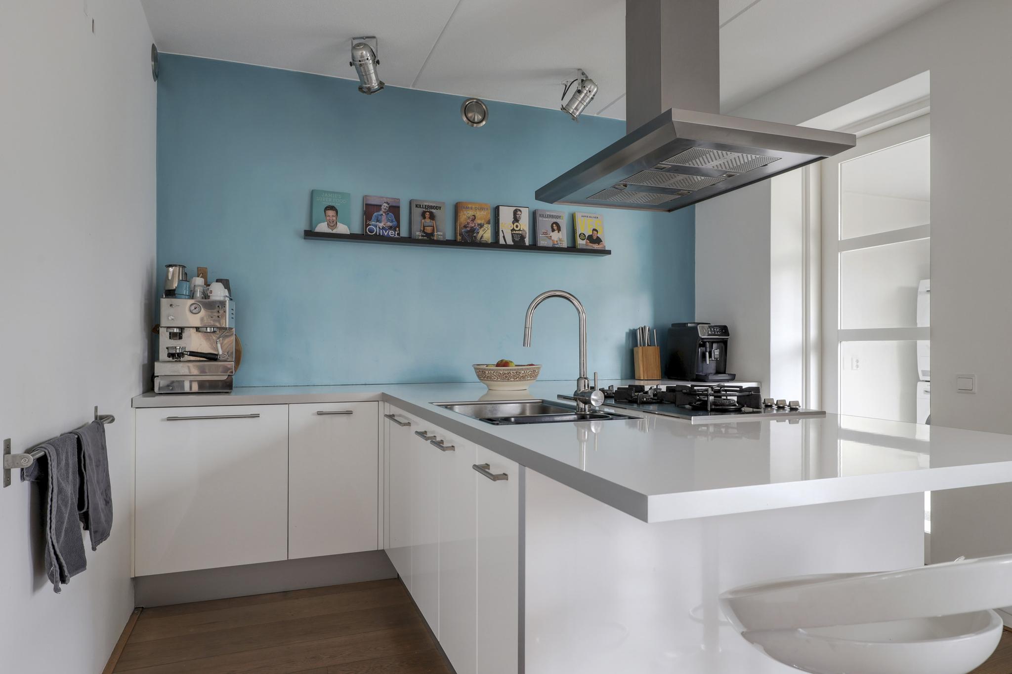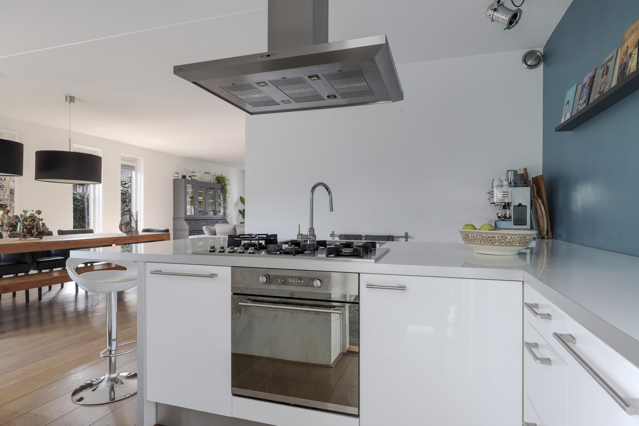 De keuken is aan de achterzijde gelegen en heeft een open karakter met de woonkamer (eethoek). De opstelling is speels ontworpen met een schiereiland waarop je kunt koken en spoelen. Aan de kopse kant kun je 2 barkrukken kwijt, gezellig wanneer kinderen thuis zijn van school zijn en je aan het koken bent. Achter de hoogglans witte fronten zitten enkele inbouwapparaten ingebouwd, zoals de vaatwasser en de koelkast. Een 5-pits gaskookplaat, een zwevende afzuigschouw en een heteluchtoven maken de keuken compleet. Géén bovenkasten en juist veel aanrecht geven de keuken het comfort en het ruimtelijke gevoel dat je door de gehele woning tegenkomt.
