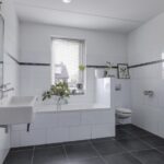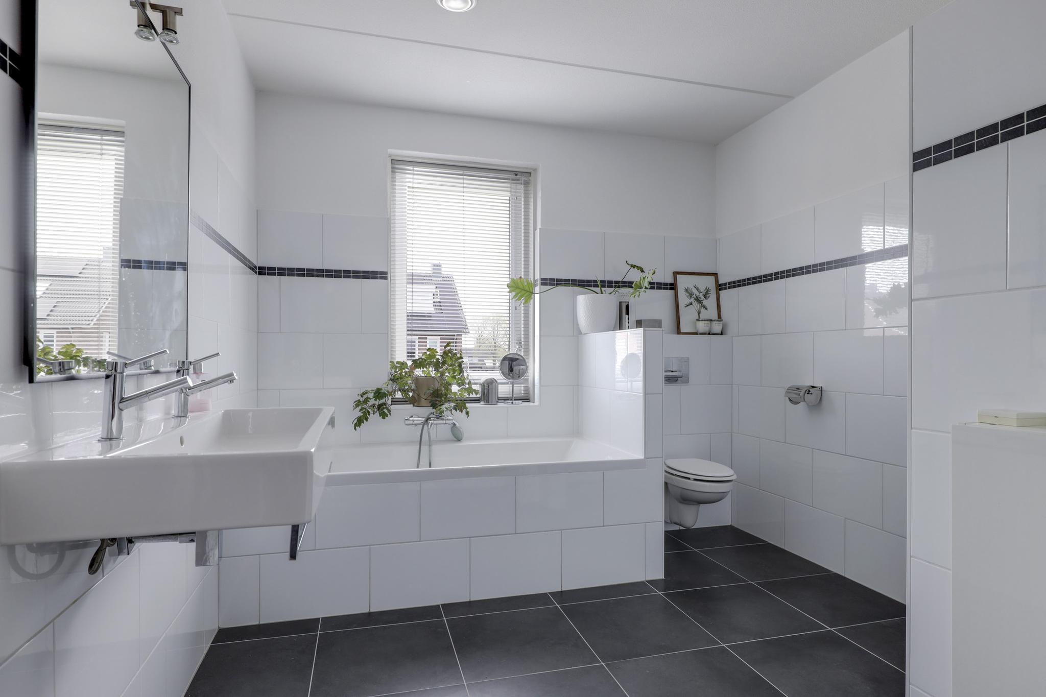 Bij de ideale gezinswoning hoort ook een complete badkamer. De ruimte is ingedeeld met een groot 2-persoons ligbad, een inloopdouche en een brede wastafel met 2 kranen en een spiegel. Uiteraard ontbreekt het 2e (zwevende) wandcloset niet. Verder heeft de badkamer een neutrale uitstraling met wit tegelwerk en een antraciet accent. Erg praktisch is het grote raam. Deze zorgt niet alleen voor een prettige lichtinval, maar ook voor de ideale ventilatiemogelijkheid. Overigens is er ook mechanische ventilatie aanwezig. Een designradiator maakt de badkamer compleet.