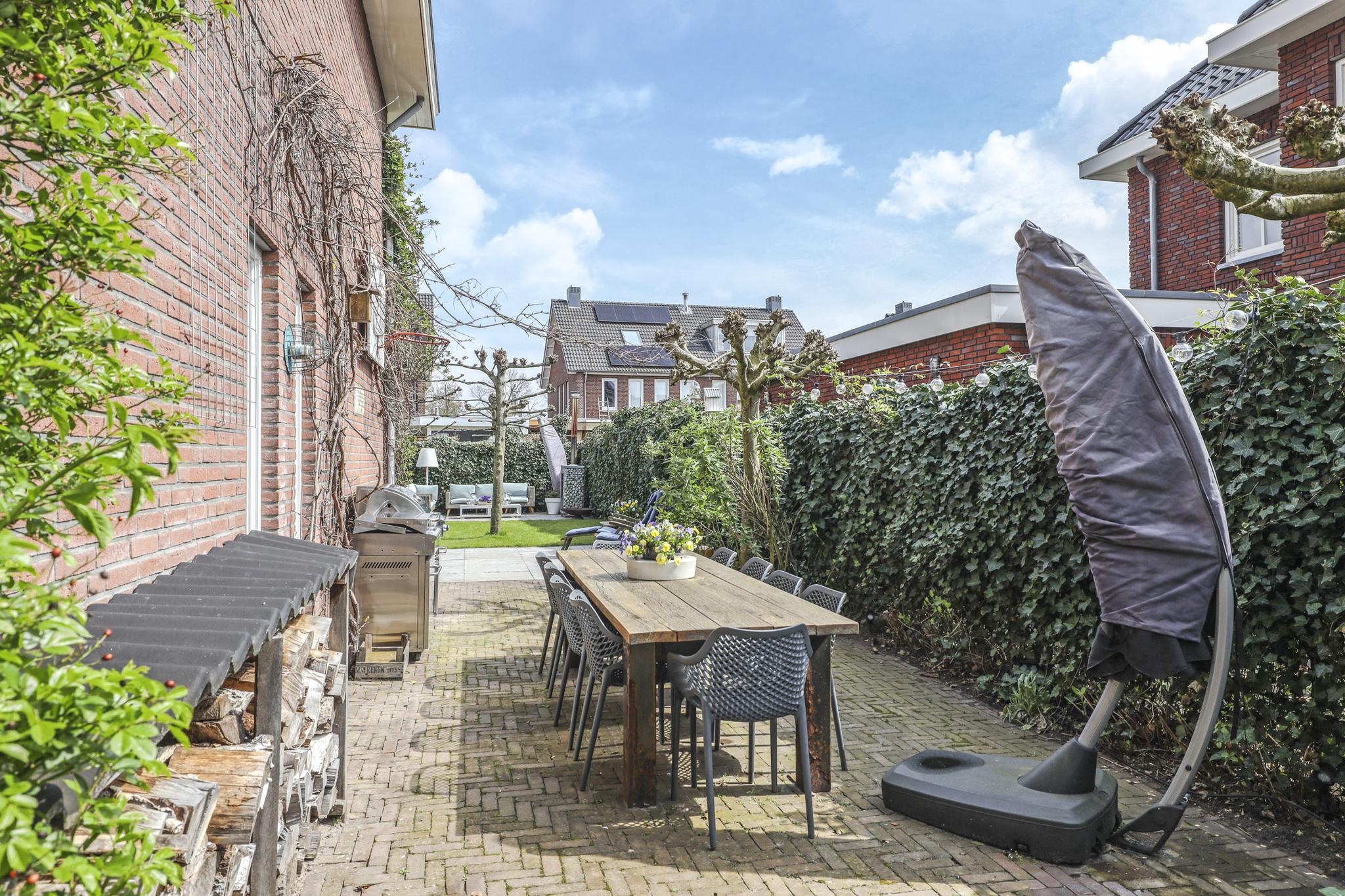 Zoals al eerder gezegd, staat de woning gunstig op het perceel waardoor er rondom de woning veel ruimte te vinden is. Dit wordt al meteen duidelijk op de oprit waar je met gemak 2 auto’s naast elkaar kunt parkeren. Er is zelfs plek voor 3 auto’s op eigen terrein. Het perceel wordt omsloten middels groene hagen. Door de jaren heen is deze tuin ‘gesetteld’ en gevormd waardoor er nu mooie, volwassen (fruit)bomen te vinden zijn. Aan beide zijden van de woning is een afgesloten achterom waardoor je niet zomaar de achtertuin inloopt.