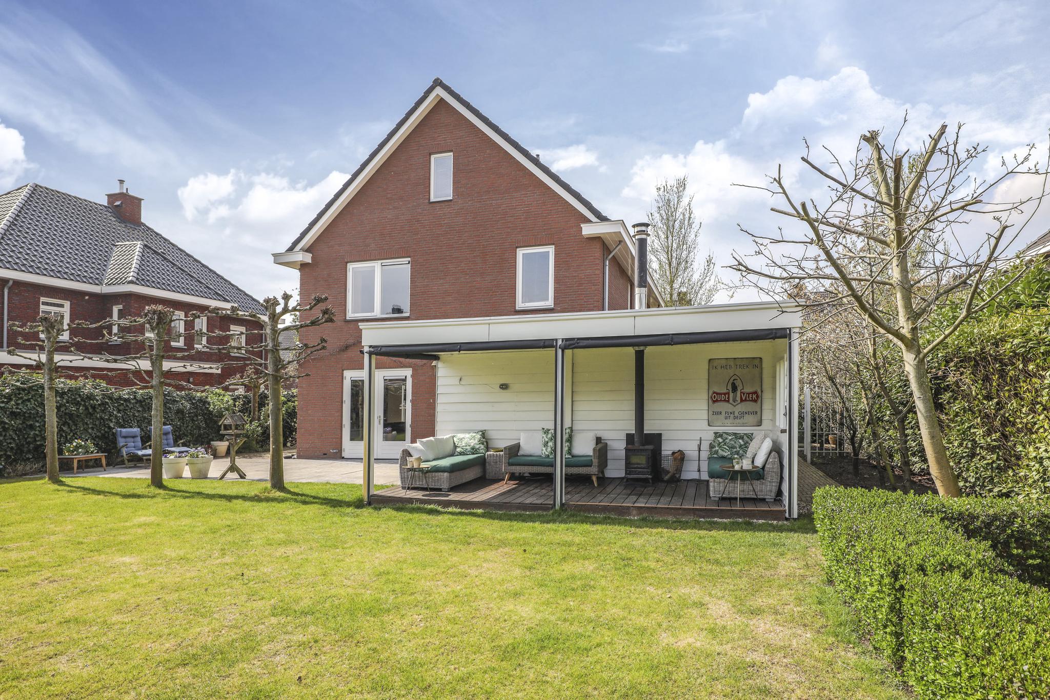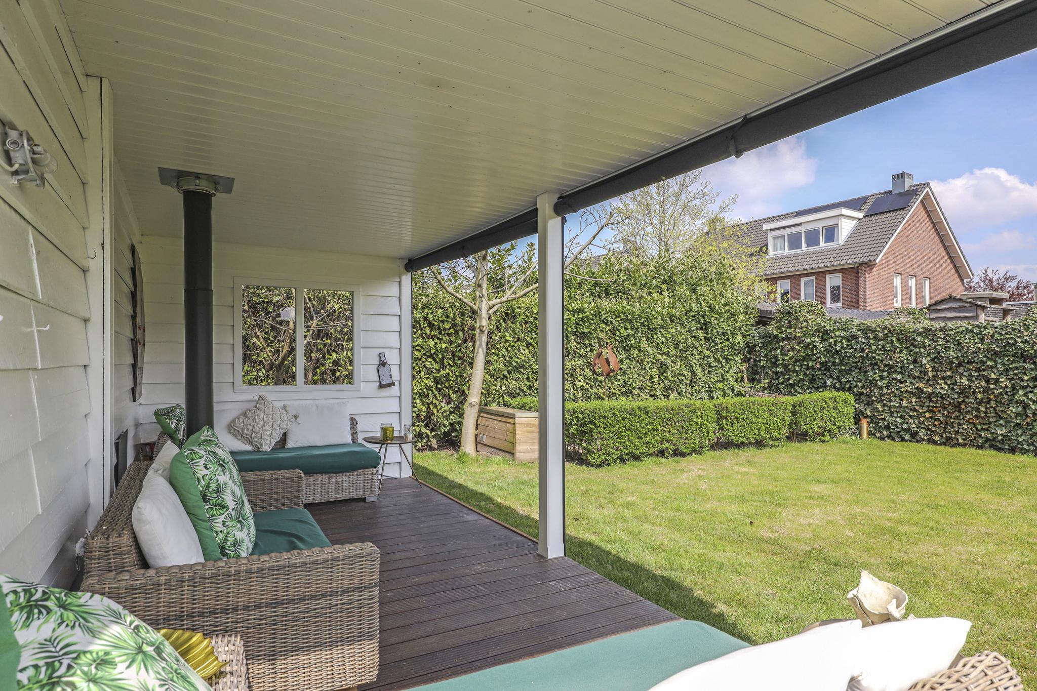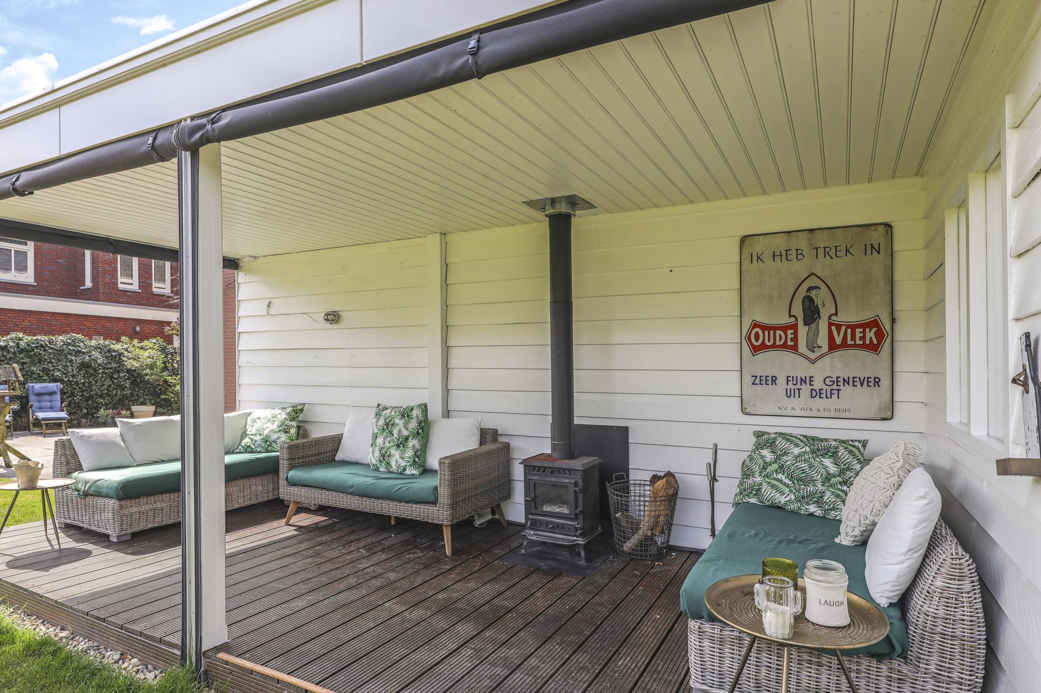 Een eyecatcher is de veranda van 15m2 groot. Deze veranda is in de stijl van de woning gebouwd waardoor het mooi één geheel is. Wanneer je een houtkachel aanschaft, dan kun je hier ’s avonds lekker beschut en warm buiten zitten. De veranda is namelijk geheel af te sluiten met ritsbare oprolschermen. Hierdoor kun je je loungeset schoon houden en je loungeset in de winter buiten laten staan.