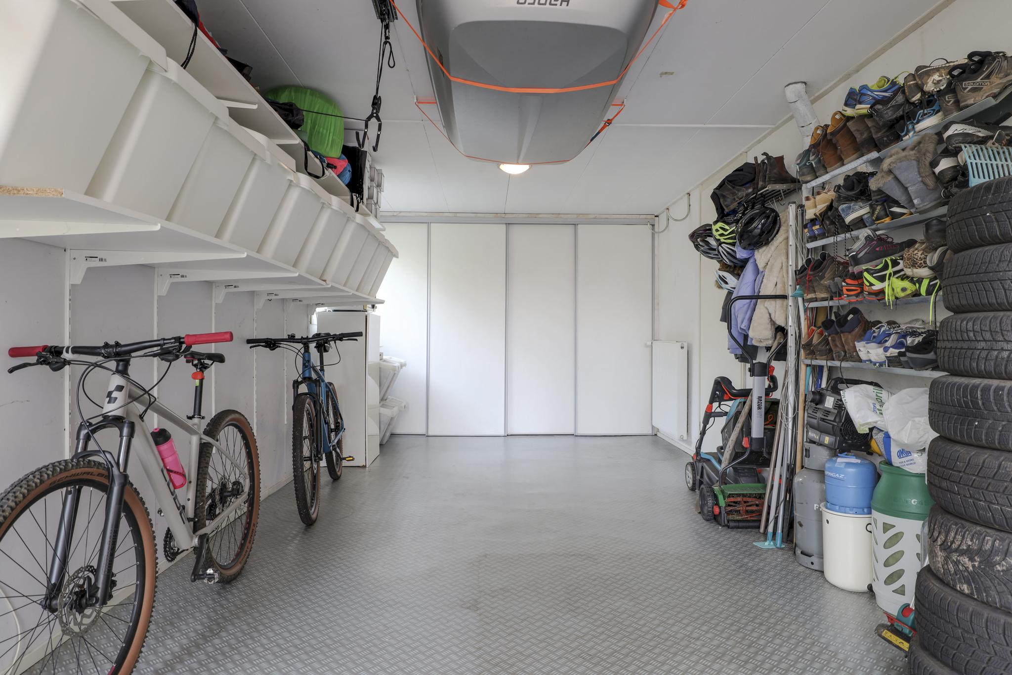 Tijdens de bouw is er naast de woning een garage met carport aangebouwd. Opvallend zijn de breedte- en lengtemaat (3,6m bij 6,4m) waardoor de garage groter is dan gemiddeld (ca. 23m2). Glaspanelen aan beide zijden van de dubbele deuren alsmede in de zijgevel zorgen voor een fijne lichtinval. En doordat de gevels zijn geïsoleerd zou je de garage ook voor andere doeleinden / hobby’s kunnen gebruiken. In de huidige situatie wordt de garage vooral gebruikt voor de stalling van fietsen. Je kunt er dan ook nogal wat kwijt zonder dat het direct vol staat. Een vaste schuif/kastenwand achterin de garage zorgt voor bijzonder veel opbergmogelijkheden.