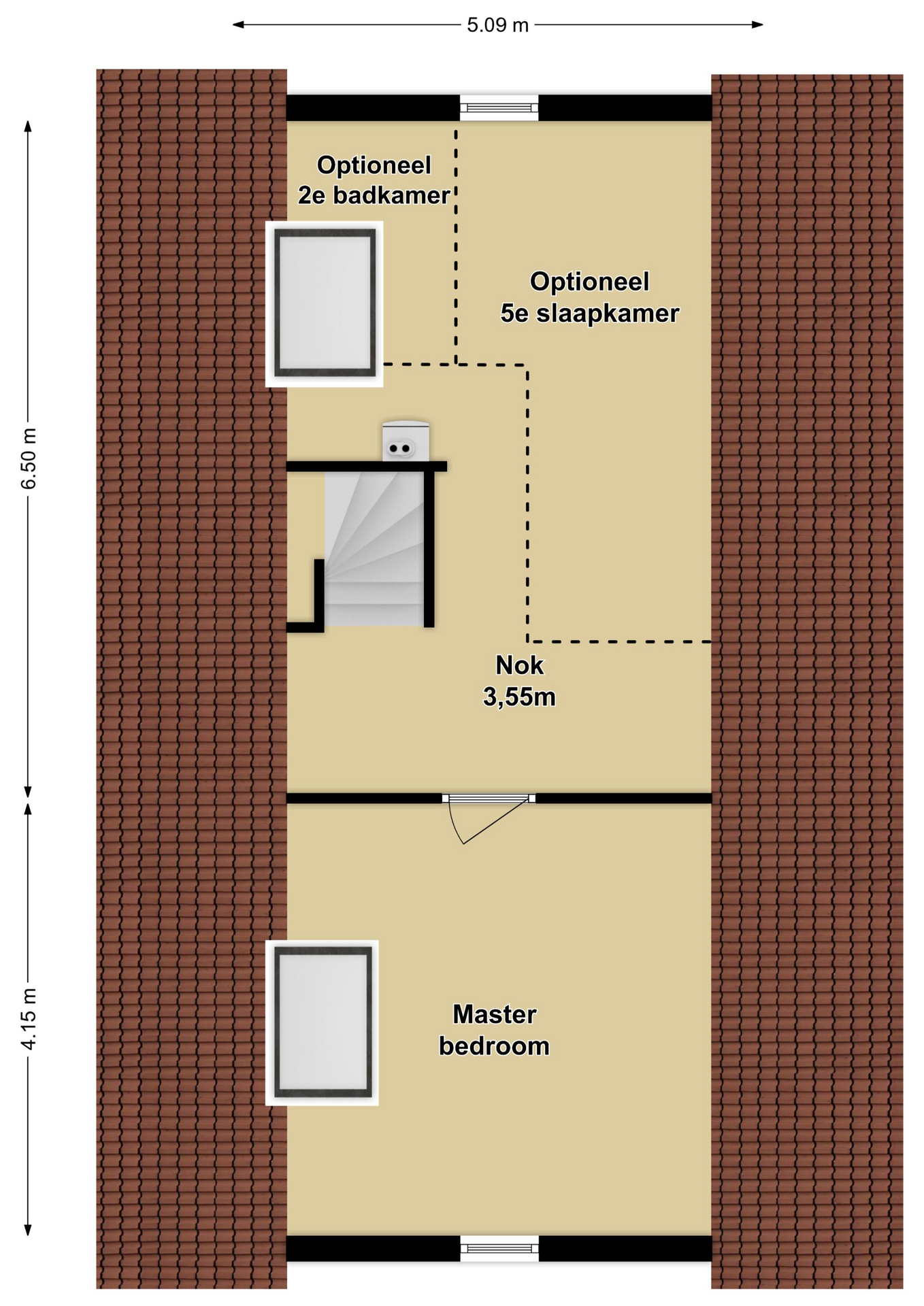 Eénmaal op de 2e verdieping zal je verrast worden door de ruimte en de hoge nok (3,5m hoog). Deze verdieping is ingedeeld in een master bedroom van 23m2 groot en een multifunctionele ‘balzaal’ met volop indelingsmogelijkheden. In de huidige setting staat er een logeerbed en is er een ‘gym aan huis’ ingericht, maar je kunt er ook een fijne werkplek creëren. In de plattegrond van de 2e verdieping hebben we optioneel een 5e slaapkamer en een 2e badkamer ingetekend. De aansluitingen voor een 2e badkamer zijn (tijdens de bouw) reeds voorbereid. Beide dakvensters zijn v.v. verduisteringsschermen en rolhorren. Door de hoge nok kun je ook prima een zoldervliering met opbergruimte maken. Onder de schuine dakvlakken zijn (deels) knieschot schuifpanelen aangebracht waar je al de nodige spullen kunt opbergen.