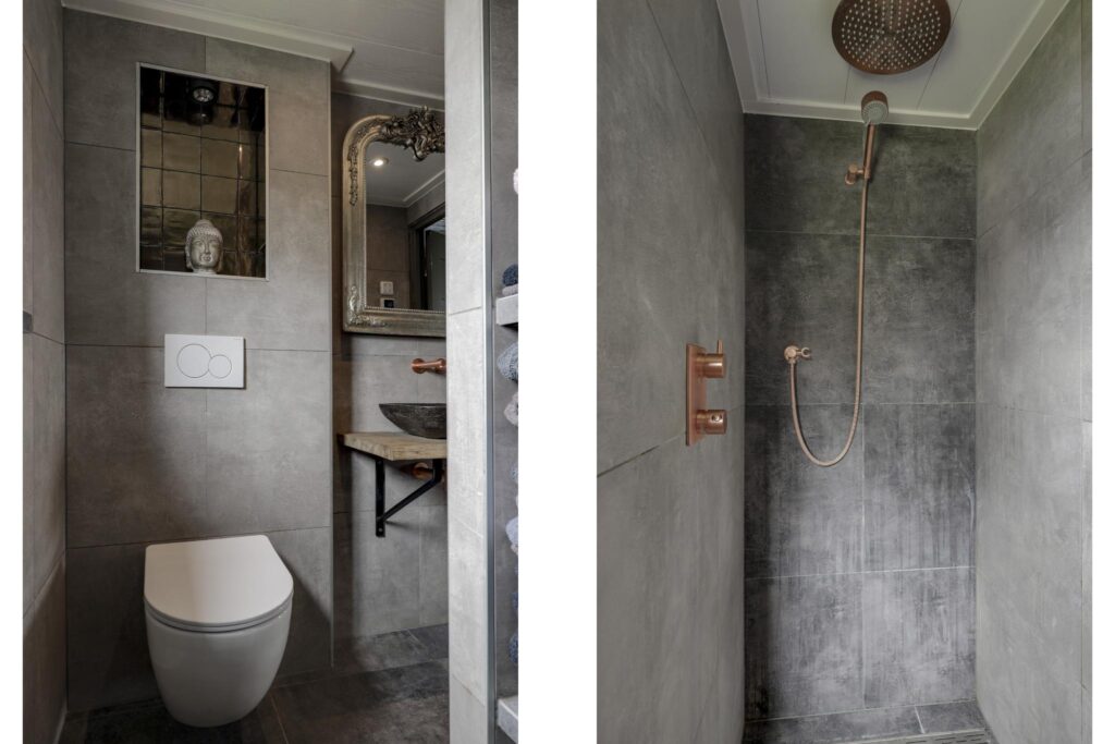 De badkamer is recent gerenoveerd en heeft een moderne uitstraling. Grote, stoere tegels passen mooi bij het koperkleurige garnituur. De wastafel betreft een natuurstenen kom waarbij de kraan in de wand is weggewerkt. De ruimte is verder ingedeeld met een inloopdouche en 2e (zwevend) toilet. Het aanwezige raam zorgt voor een aangename lichtinval en mogelijkheid om te ventileren.