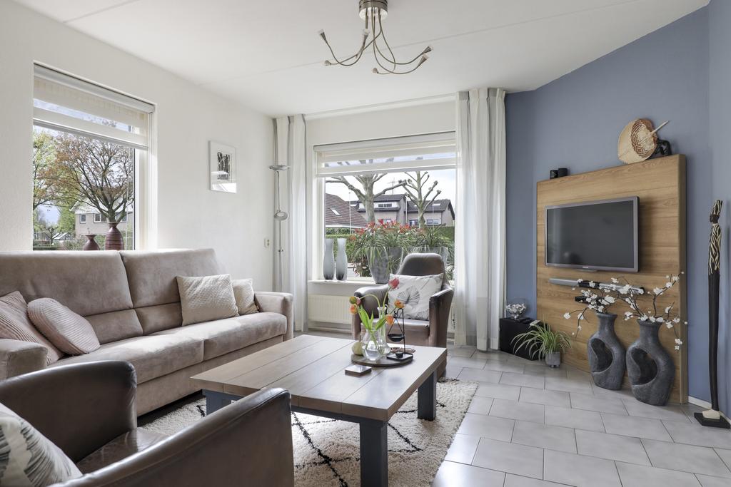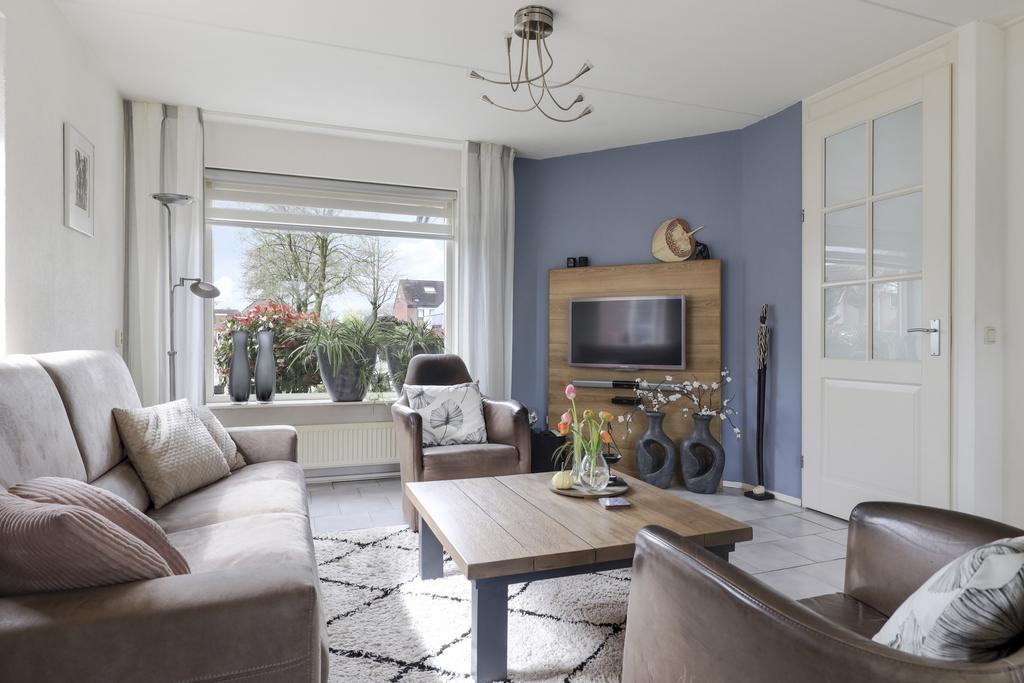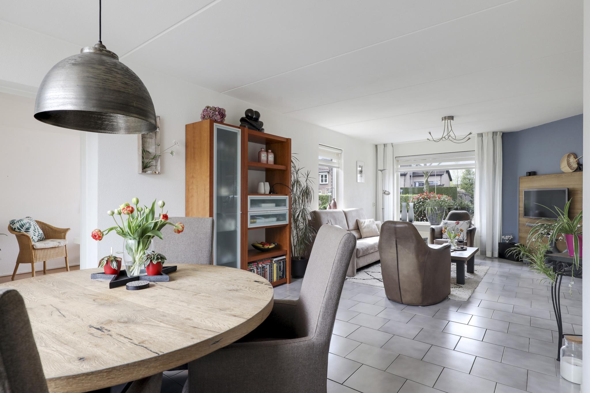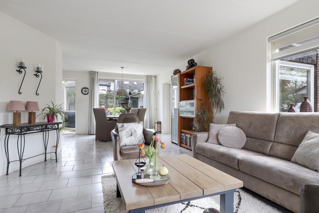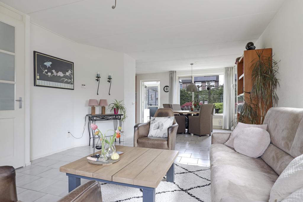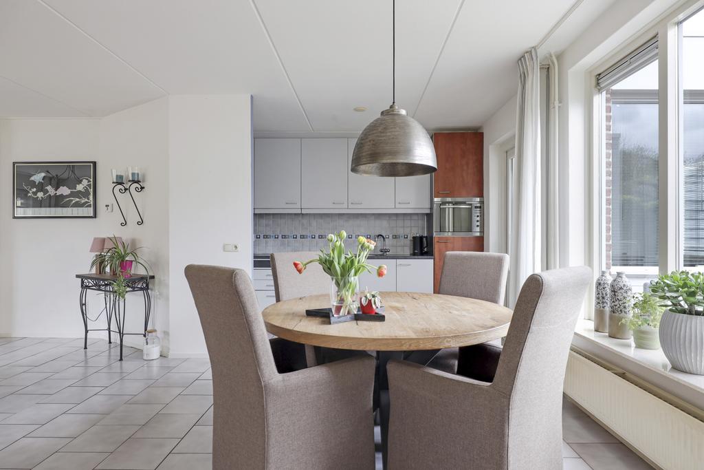 Deze woning heeft een klassieke doorzon-woonkamer met grote raampartijen waaronder in de zijgevel. Hierdoor is het altijd licht in de woonkamer wat voor een prettige woonsfeer zorgt. De kamer is goed in te richten met een grote hoekbank en een 6-persoons eettafel. Op de vloer liggen plavuizen welke aangenaam aanvoelen door de aanwezige vloerverwarming.