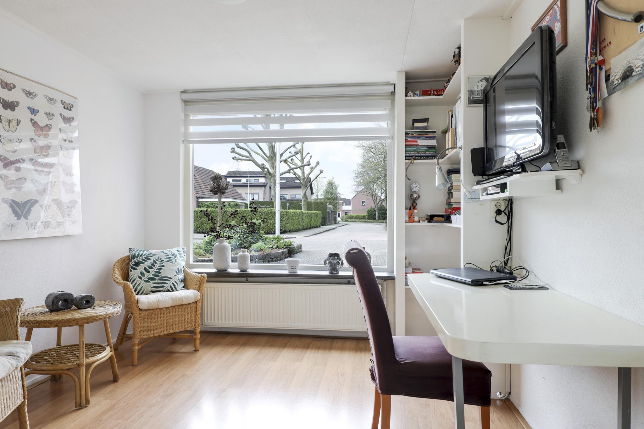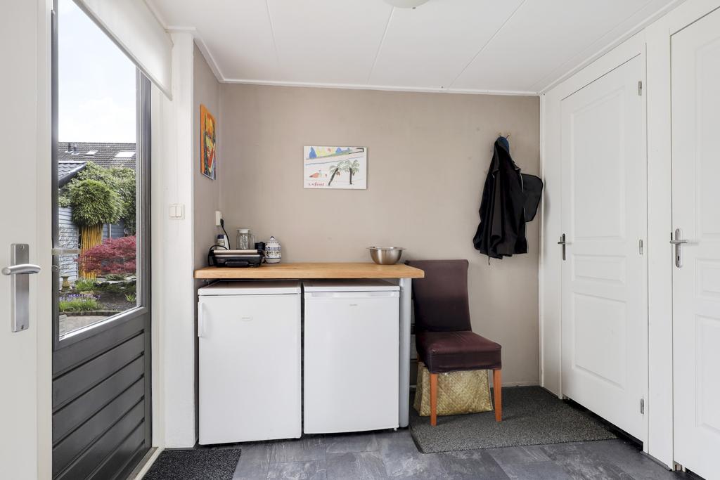 Doordat vanaf de bouw af de garage bij de woning is betrokken, zijn er flink wat extra vierkante meters leefruimte aan de woning toegevoegd. Deze ‘zijvleugel’ is opgedeeld in een werkkamer en een bergruimte. Hier kun je je prima terugtrekken om te werken en/of een speelkamer te maken. Aan de voorzijde geeft een groot raam veel lichtinval. Aan de achterzijde is een deur aanwezig waardoor je rechtstreeks de tuin in loopt.