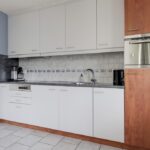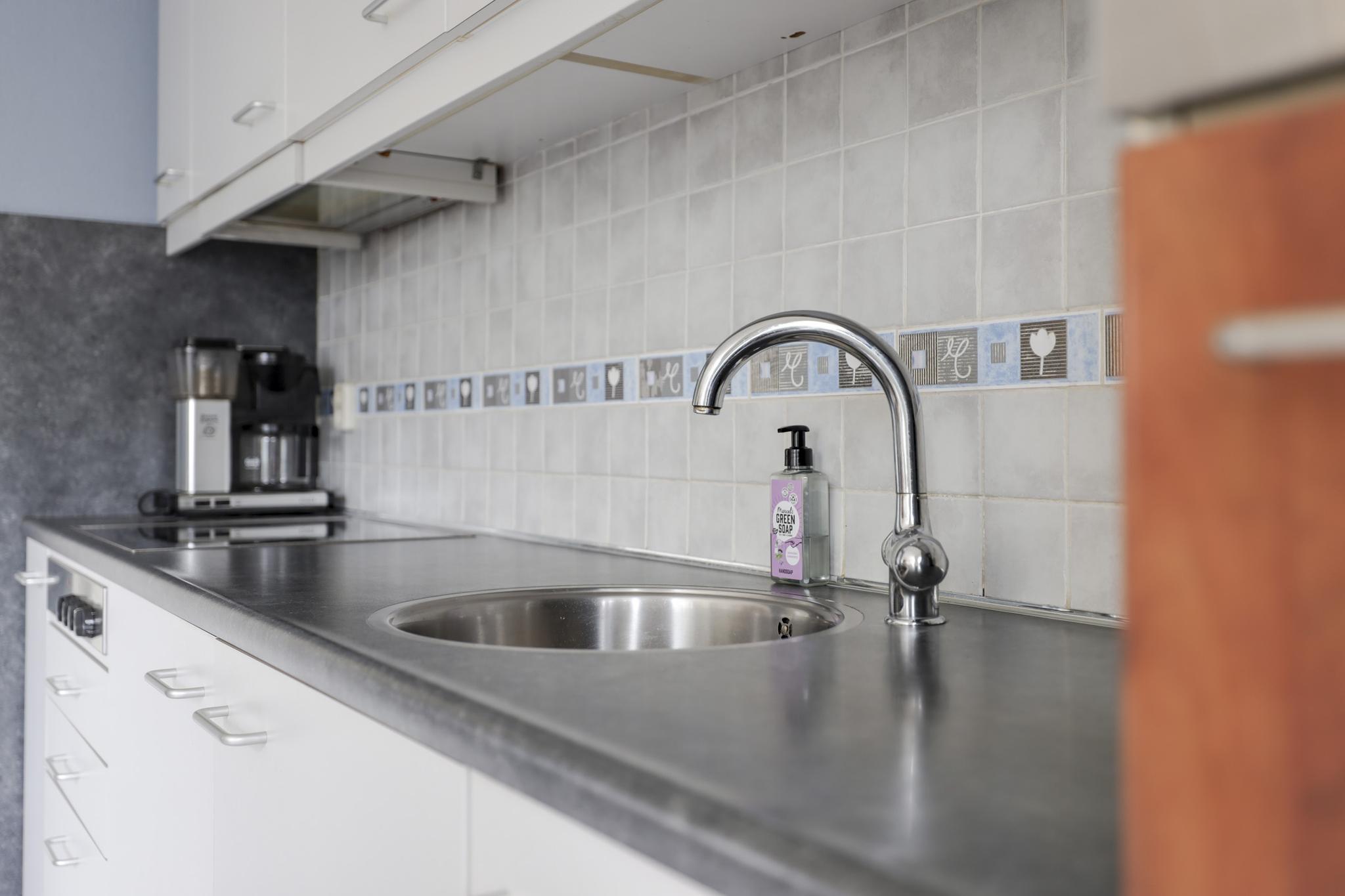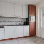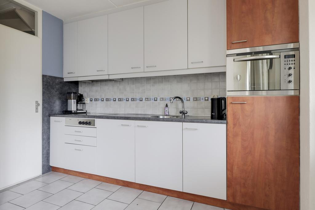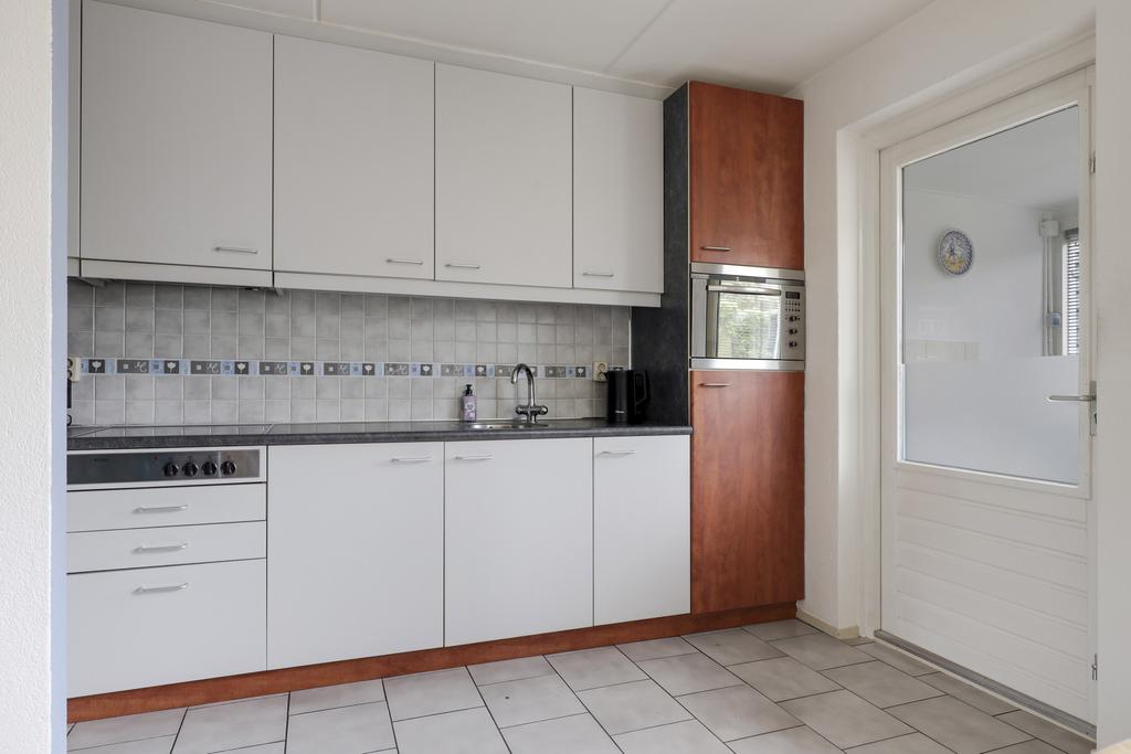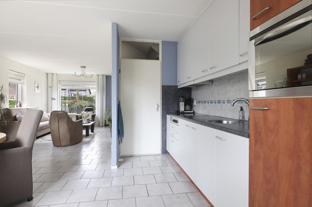 De open keuken staat direct in verbinding met de woonkamer. Er is hier gekozen voor een recht keukenblok met bovenkasten tot aan het plafond, waardoor er veel kastruimte aanwezig is. De inbouwapparatuur bestaat uit een kookplaat (2 inductie, 2 keramische pitten), een koelkast en een combi-oven/magnetron. Door de close-in-boiler heb je direct warm water. Vanuit de keuken is de trapkast bereikbaar.