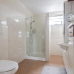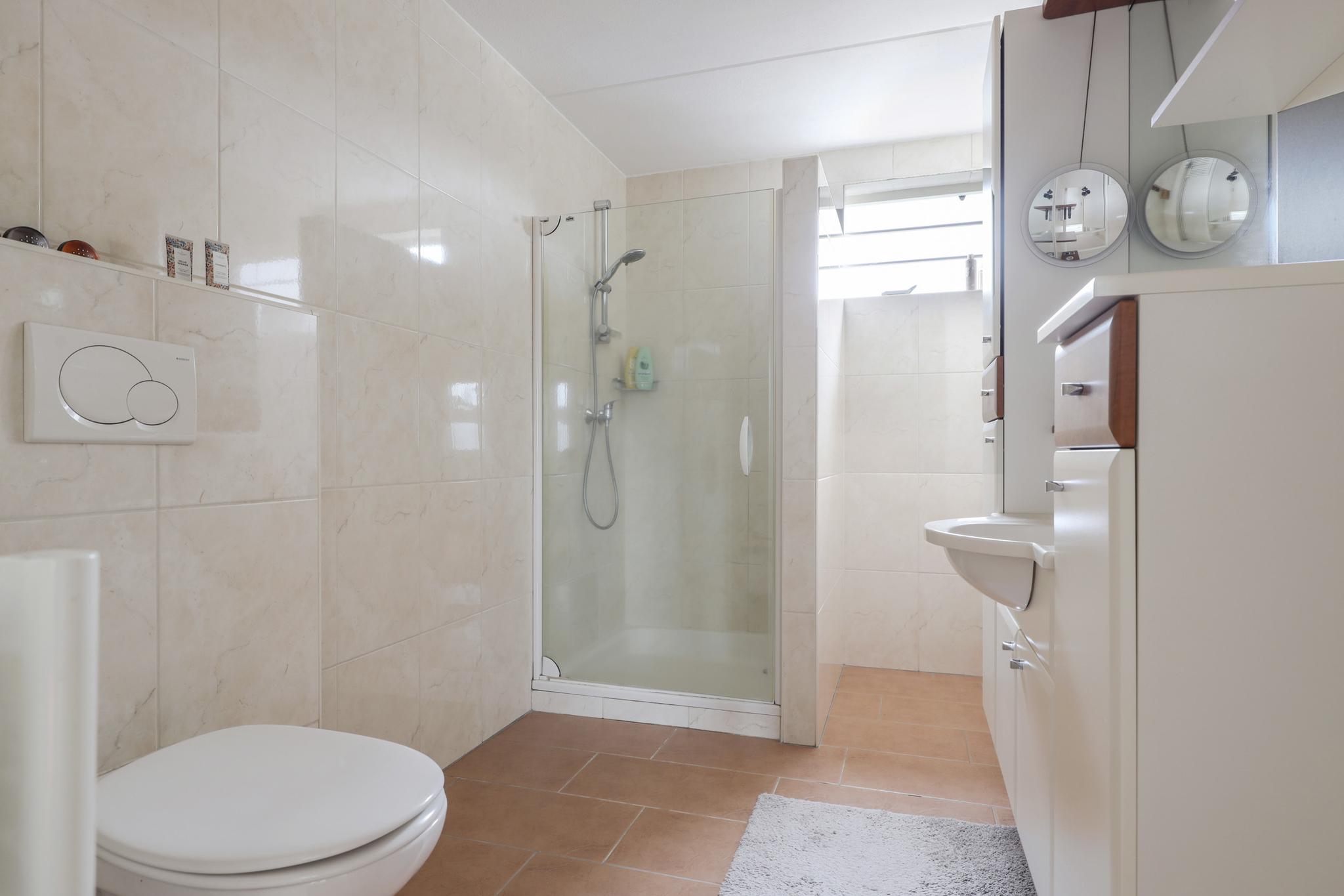 Badkamer met douchecel, een wastafelmeubel met extra kastruimte en een 2e toilet