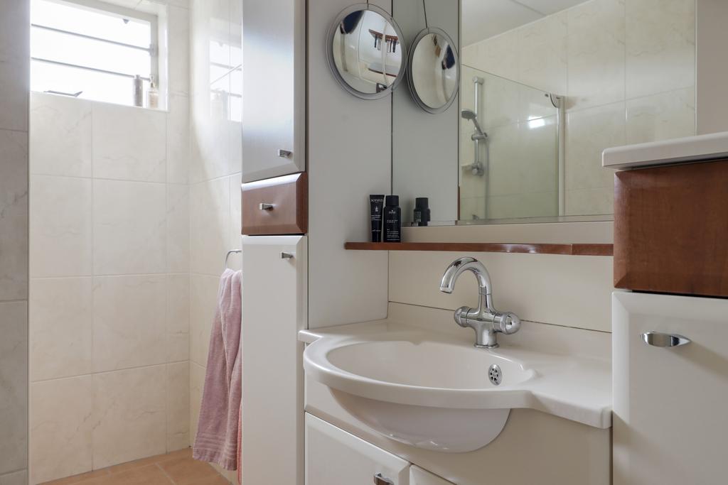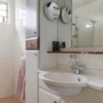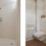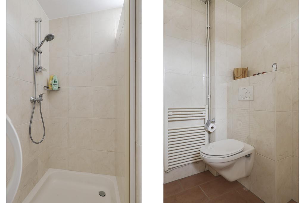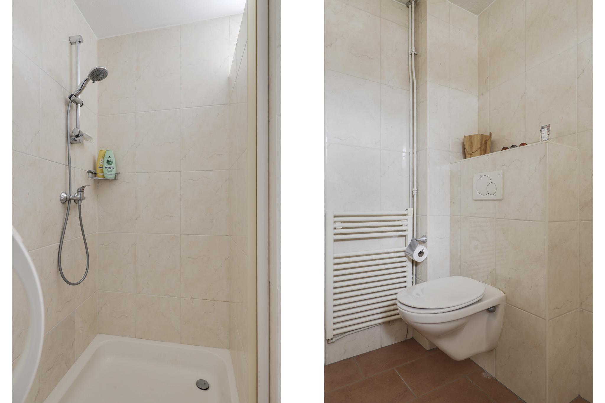 De badkamer is ruim opgezet waarbij al het wenselijke sanitair aanwezig is, maar er nog voldoende bewegingsruimte overblijft. De ruimte is geheel betegeld en ingericht met een douchecel, een wastafelmeubel en een 2e toilet (zwevend). Het wastafelmeubel is voorzien van veel extra opbergruimte. Uiteraard ontbreekt ook de handdoekradiator niet. Een hooggeplaatst raam biedt hier een ventilatiemogelijkheid, tevens is er ook mechanische afzuiging aanwezig.