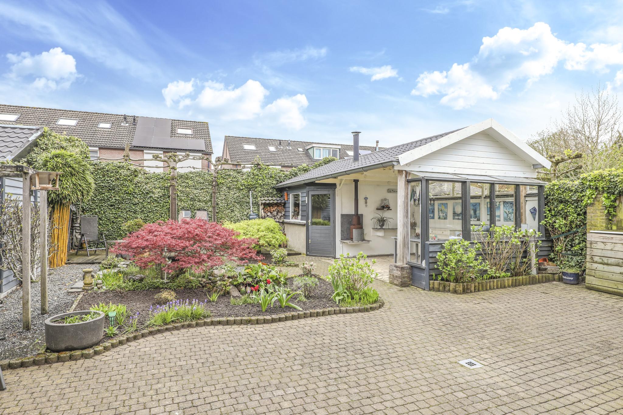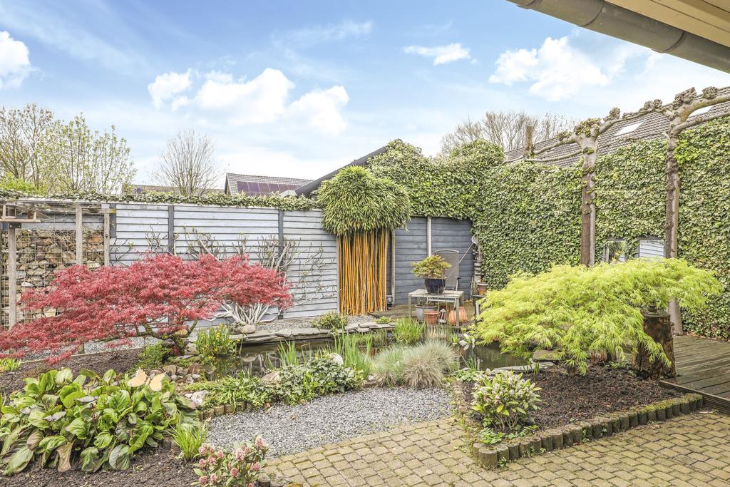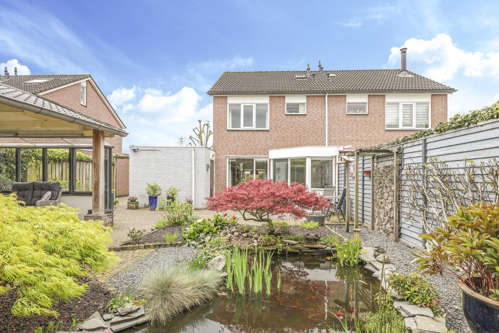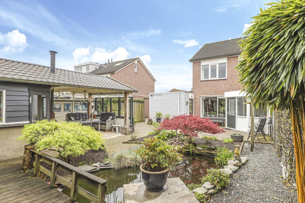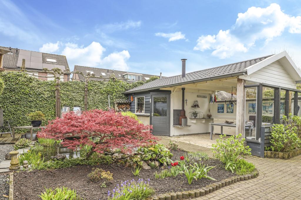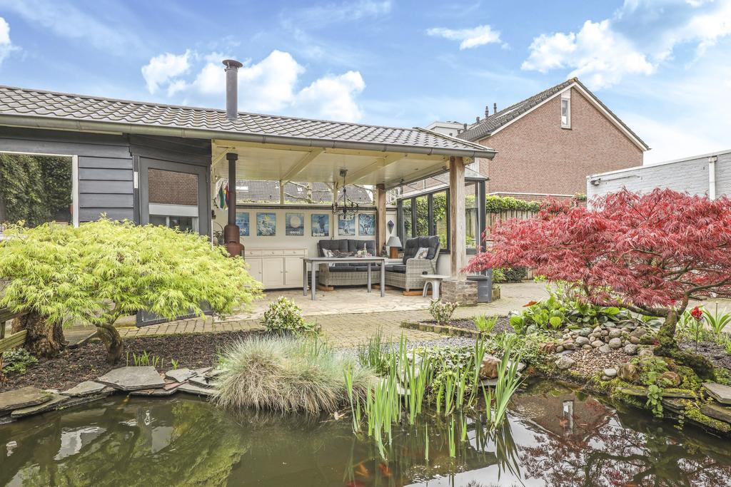 Bij deze woning hoort een heerlijke achtertuin. De tuin heeft een goed formaat, mede door de mooie breedte van het perceel. Geen wonder dat er hier meerdere terrassen zijn gecreëerd. Een groot terras direct aan de woning en een stijlvol vlonder terras achter in de tuin. Tussen de terrassen in is een vijver geplaatst met diverse planten en struiken. Achter in de hoek staat een ruime schuur welke met ca. 12m² grootte een stuk ruimer is dan gemiddeld. Naast het plaatsen van fietsen heb je hier veel ruimte om bijvoorbeeld te klussen. In de nok is nog extra opbergruimte aanwezig. Aan de schuur is een stijlvolle veranda geplaatst waar je heerlijk beschut kunt zitten. Wanneer het buiten afkoelt zit je hier nog heerlijk bij de houtkachel.