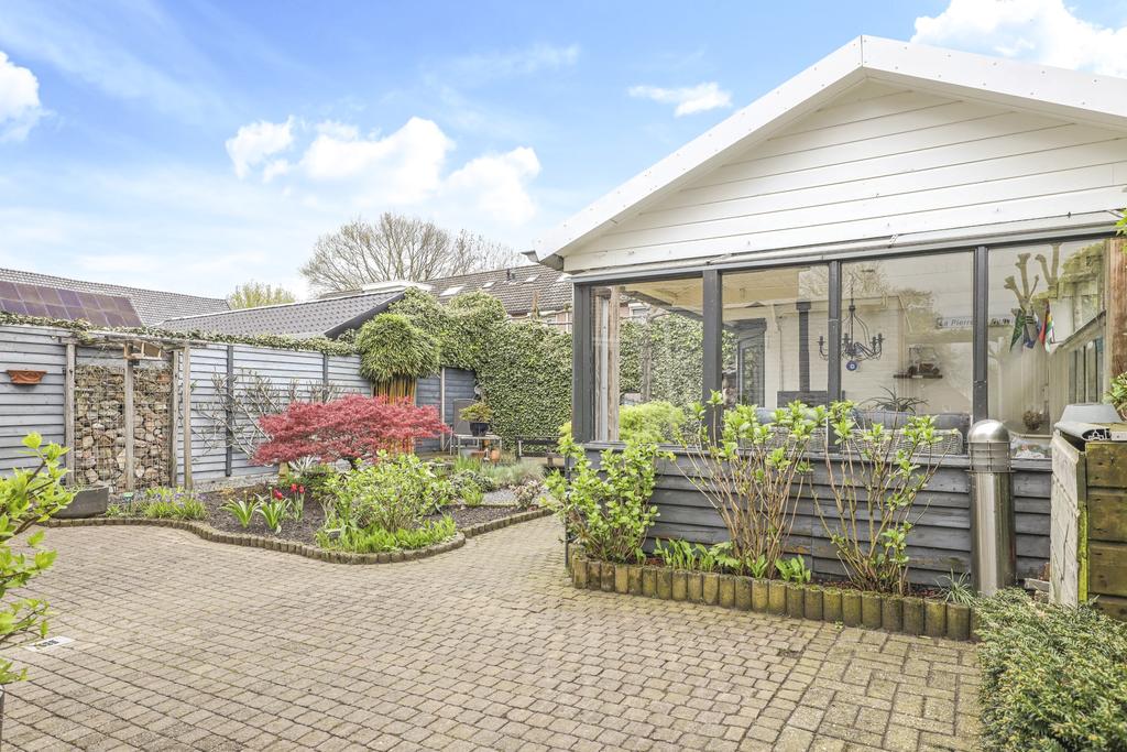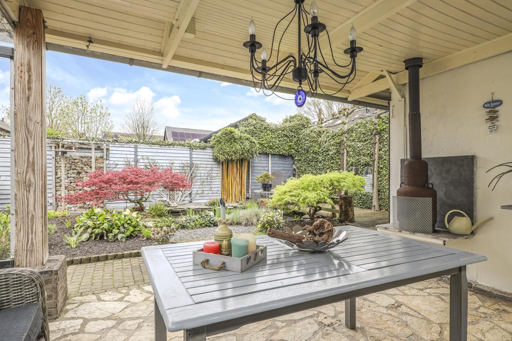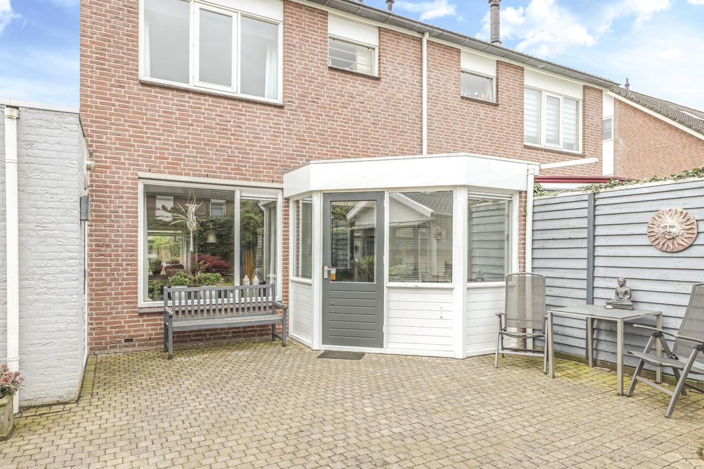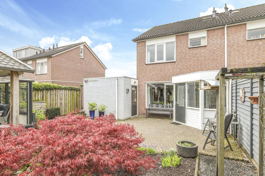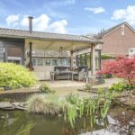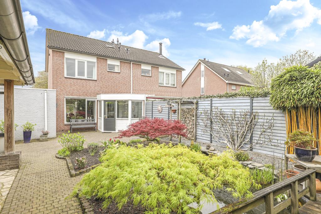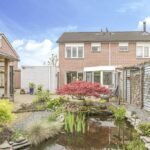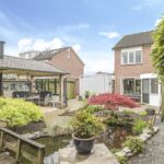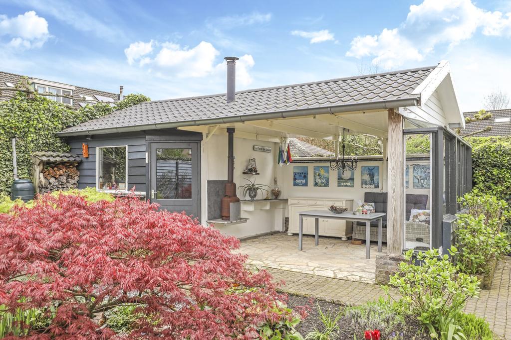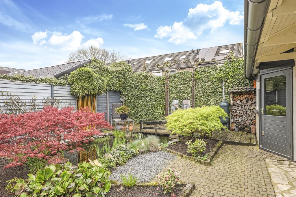Bij deze woning hoort een heerlijke achtertuin. De tuin heeft een goed formaat, mede door de mooie breedte van het perceel. Geen wonder dat er hier meerdere terrassen zijn gecreëerd. Een groot terras direct aan de woning en een stijlvol vlonder terras achter in de tuin. Tussen de terrassen in is een vijver geplaatst met diverse planten en struiken. Achter in de hoek staat een ruime schuur welke met ca. 12m² grootte een stuk ruimer is dan gemiddeld. Naast het plaatsen van fietsen heb je hier veel ruimte om bijvoorbeeld te klussen. In de nok is nog extra opbergruimte aanwezig. Aan de schuur is een stijlvolle veranda geplaatst waar je heerlijk beschut kunt zitten. Wanneer het buiten afkoelt zit je hier nog heerlijk bij de houtkachel.