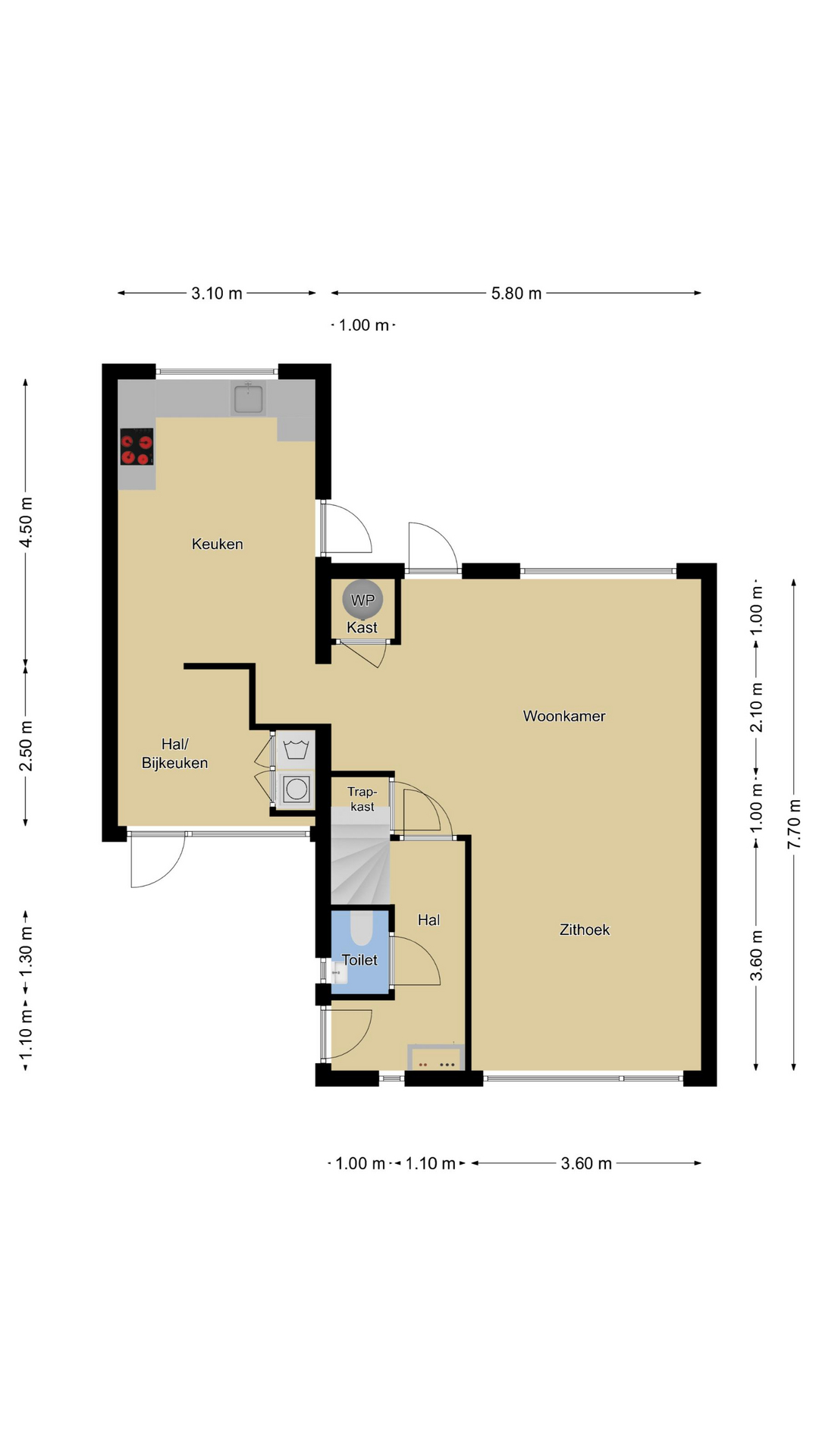Doorzon-woonkamer (vergroot) met trap/voorraadkast en tuindeur