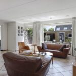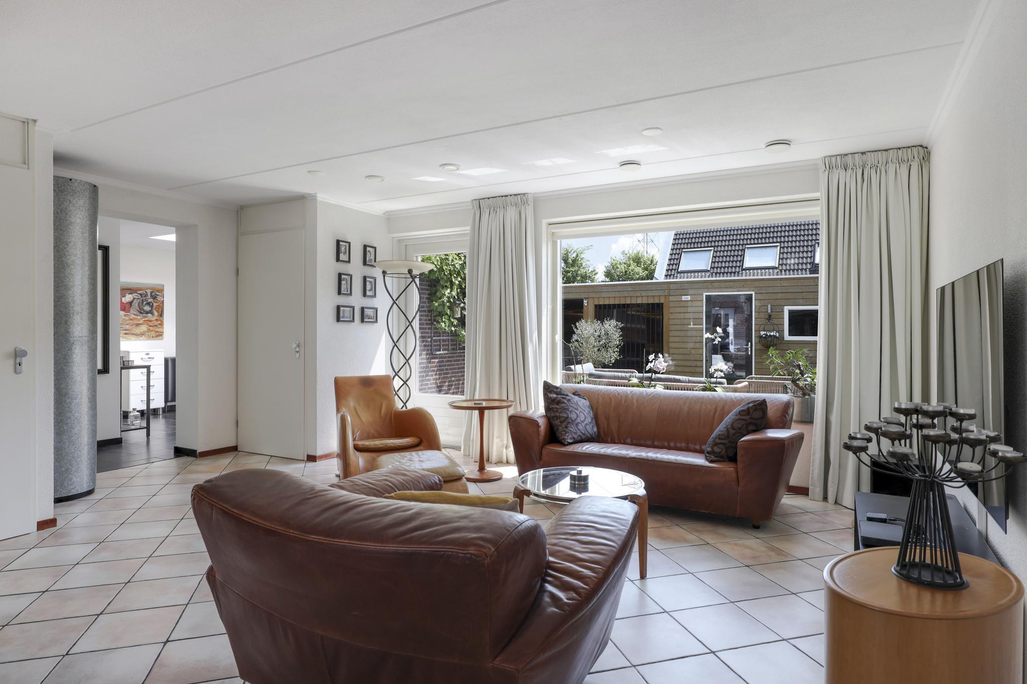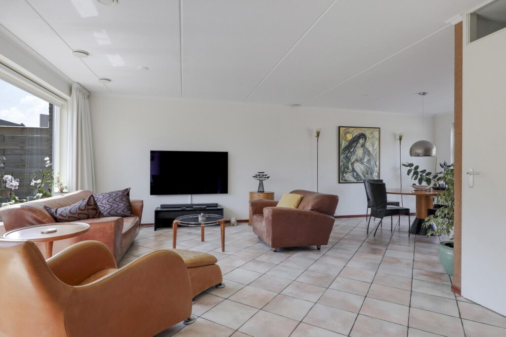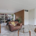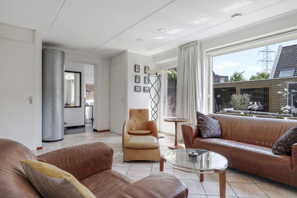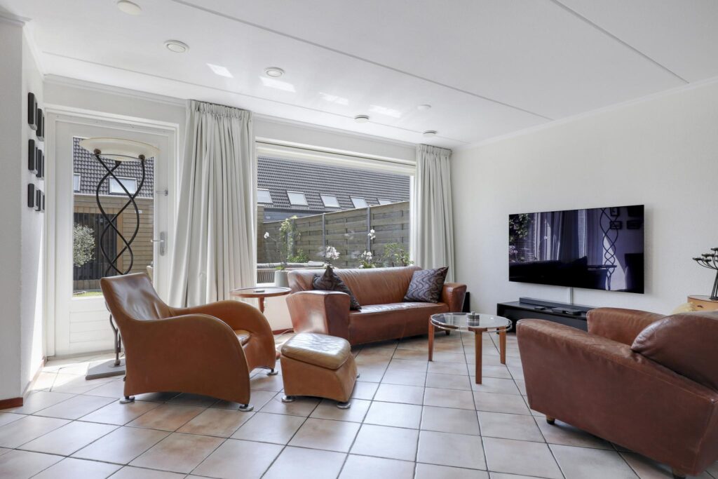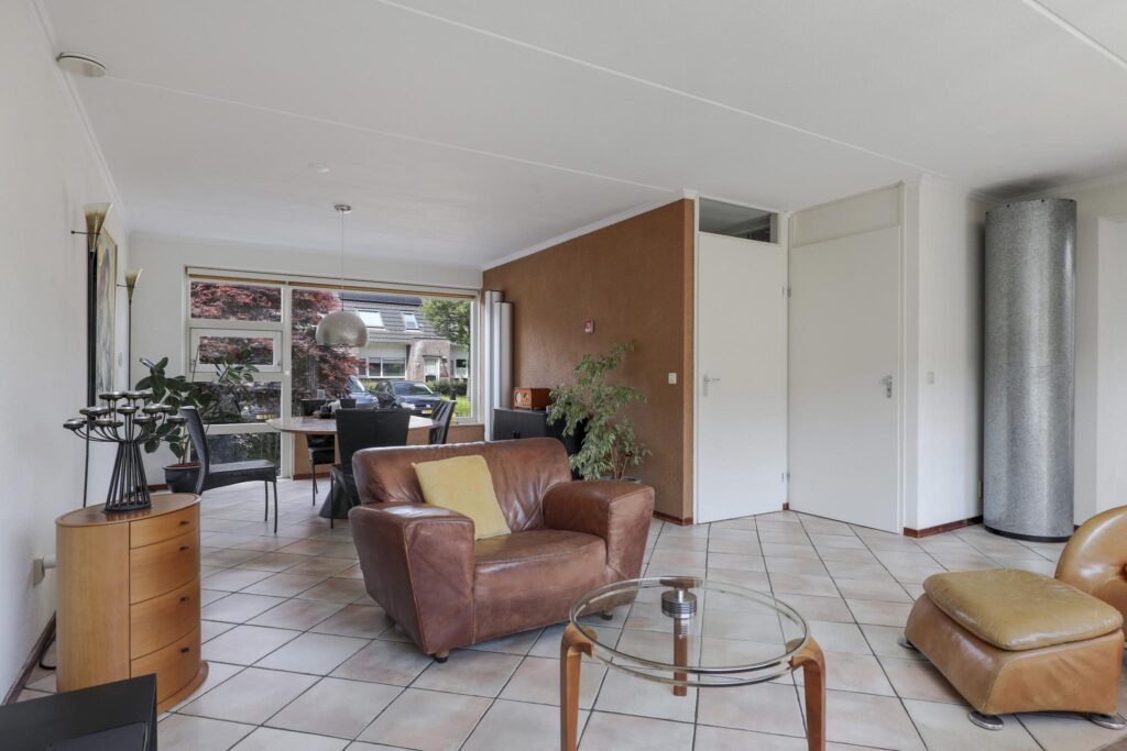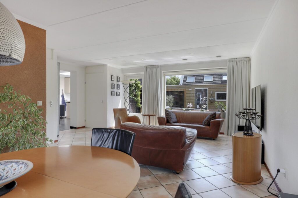 De woonkamer voelt prettig aan, mede door de doorzon-indeling met aan de voor- en achterzijde veel glasoppervlak. Het raam aan de voorzijde loopt door tot aan de vloer wat een speels effect geeft. Doordat de keuken is verplaatst naar de voormalige garage en de tussenmuur is verwijderd, is de woonkamer ook een stuk ruimtelijker geworden. De plavuizen vloer voelt comfortabel aan door de vloerverwarming die in de winter verwarmd en in de zomer koelt. Een tuindeur geeft direct toegang tot het buitenterras. Ook is er nog een inbouwkast waar je de nodige spullen kunt opbergen.