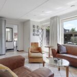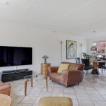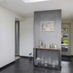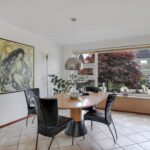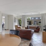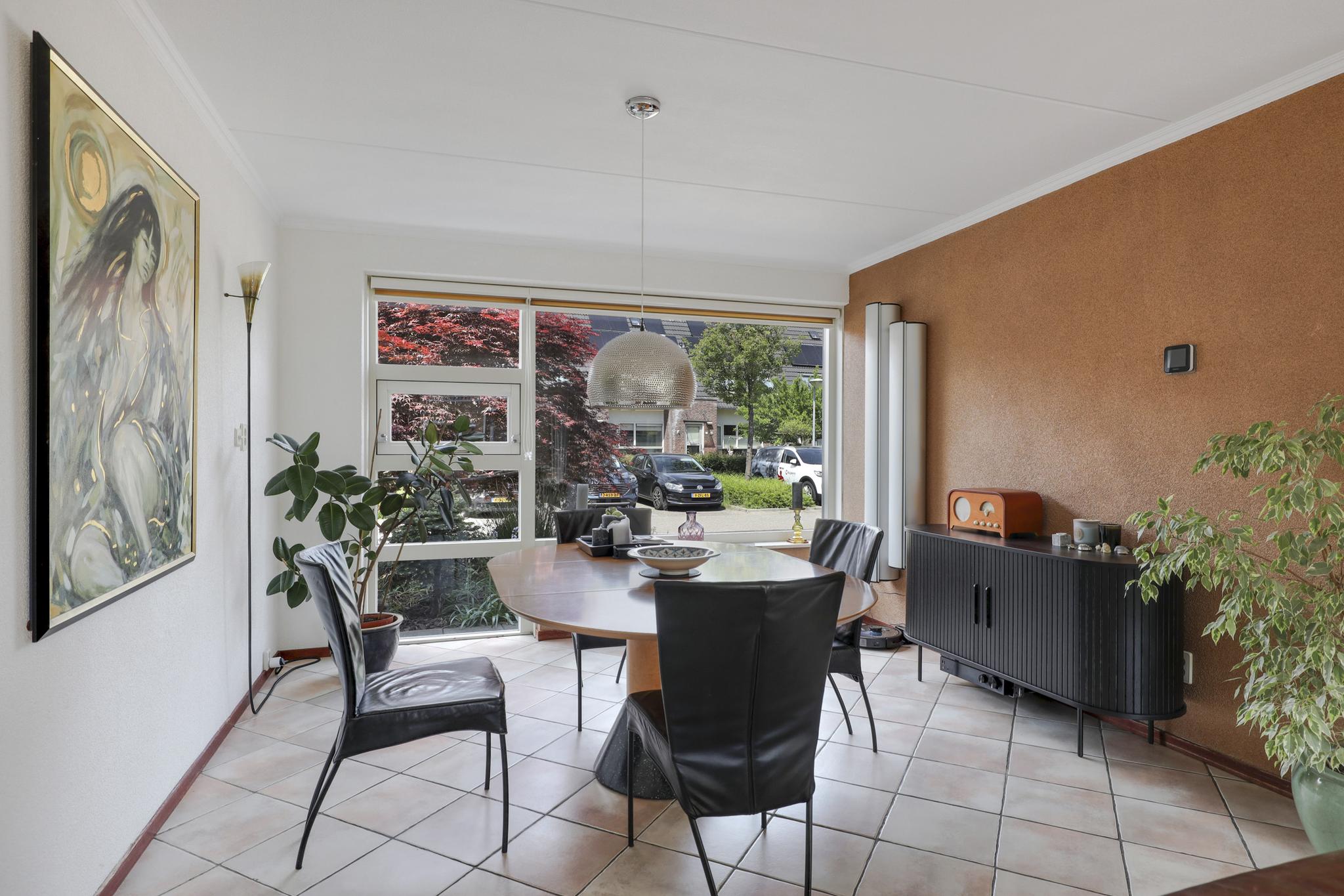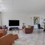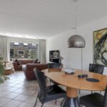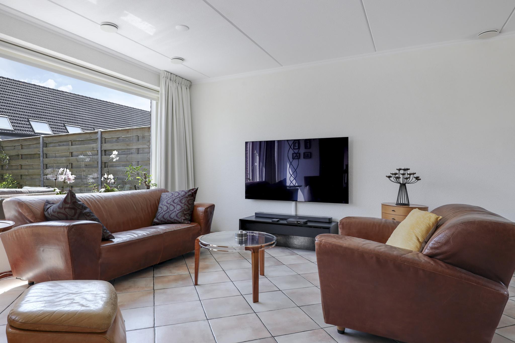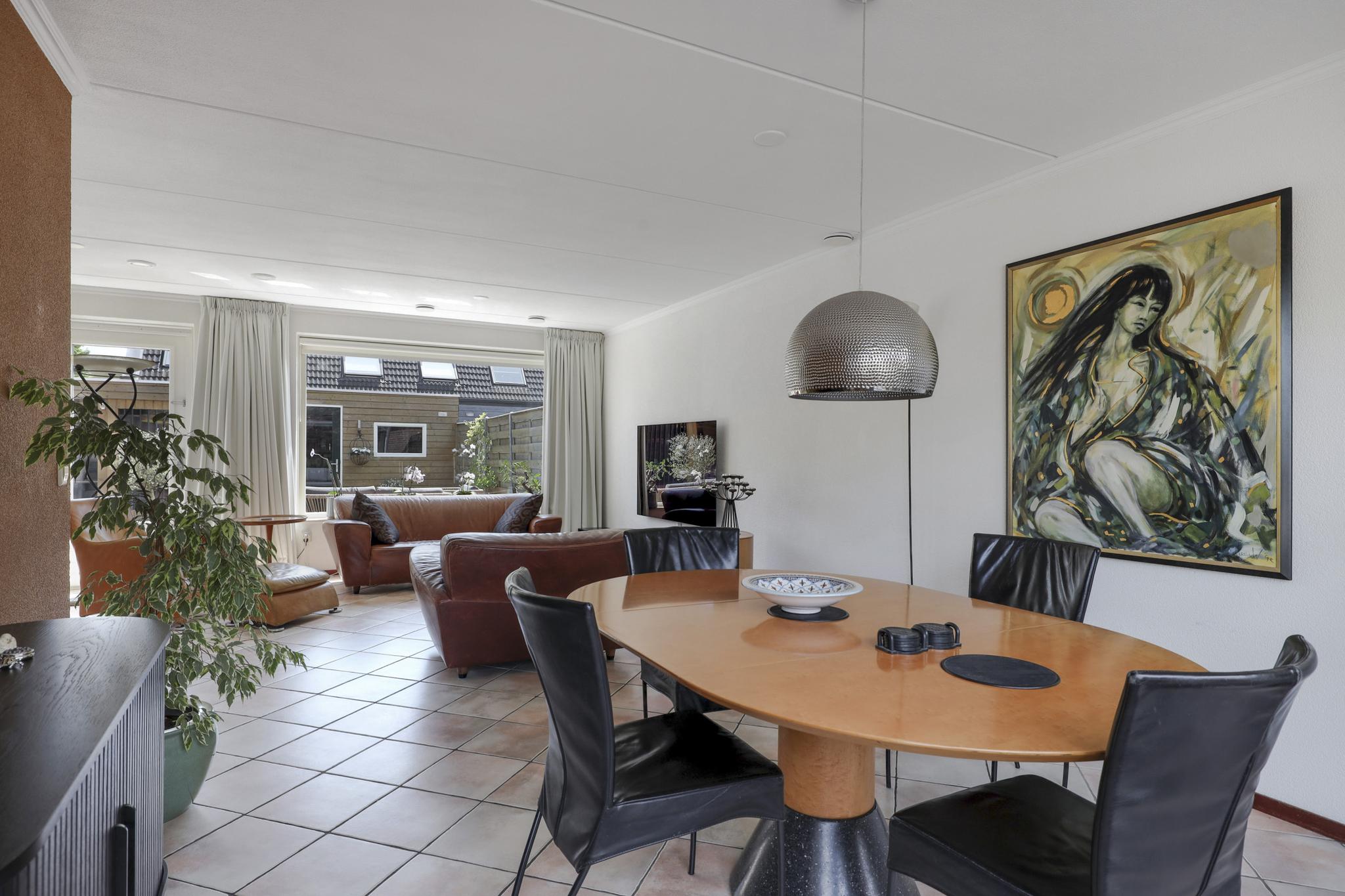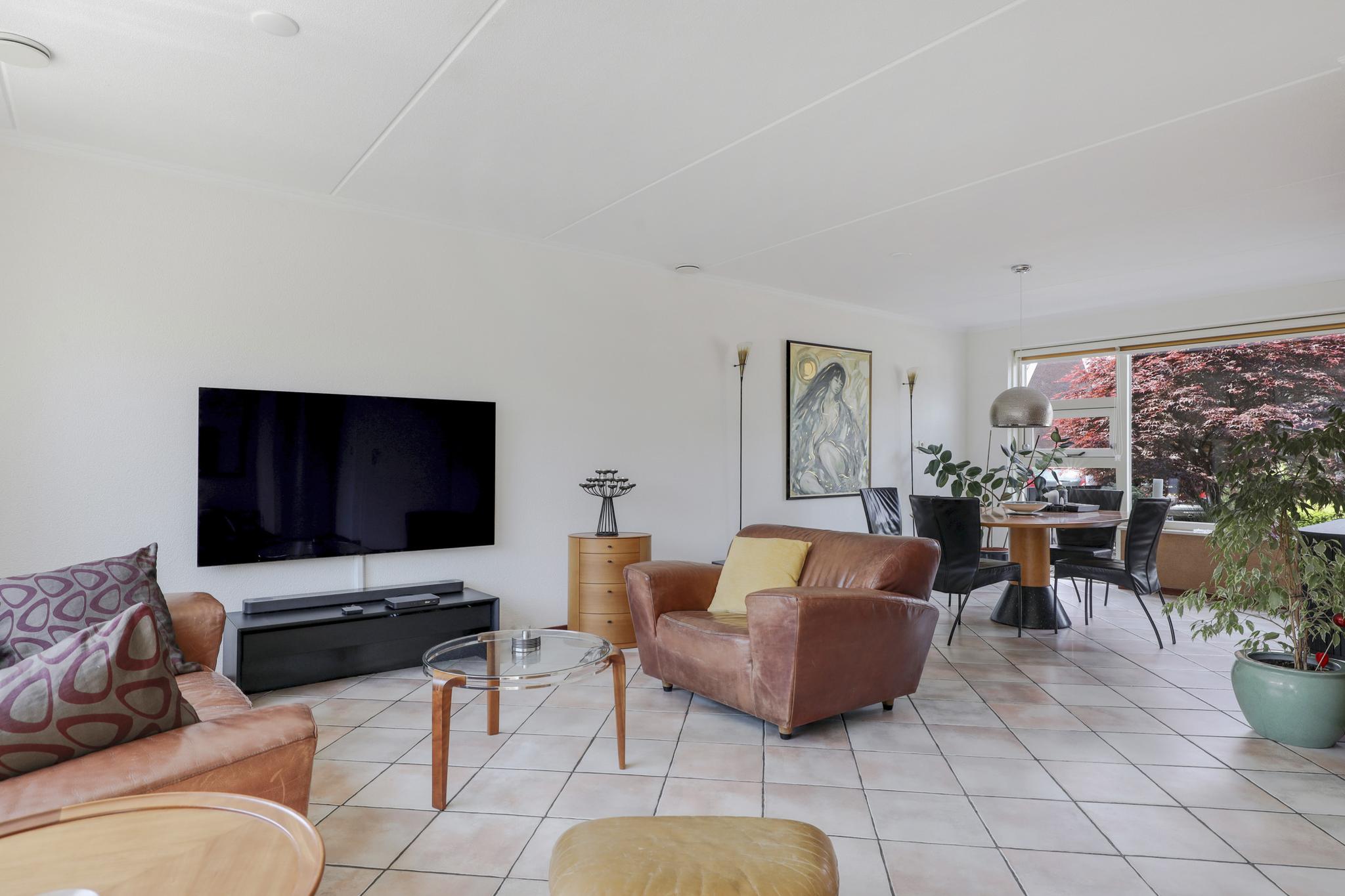De woonkamer voelt prettig aan, mede door de doorzon-indeling met aan de voor- en achterzijde veel glasoppervlak. Het raam aan de voorzijde loopt door tot aan de vloer wat een speels effect geeft. Doordat de keuken is verplaatst naar de voormalige garage en de tussenmuur is verwijderd, is de woonkamer ook een stuk ruimtelijker geworden. De plavuizen vloer voelt comfortabel aan door de vloerverwarming die in de winter verwarmd en in de zomer koelt. Een tuindeur geeft direct toegang tot het buitenterras. Ook is er nog een inbouwkast waar je de nodige spullen kunt opbergen.