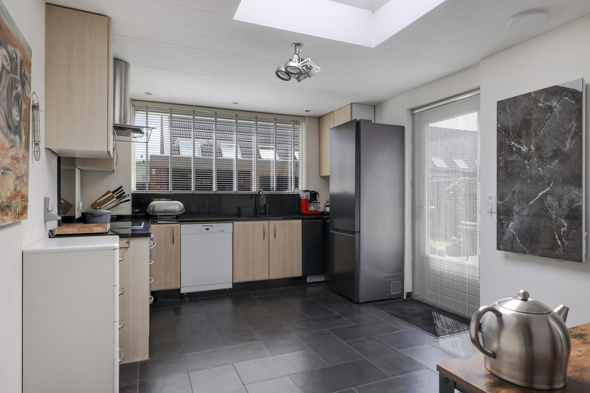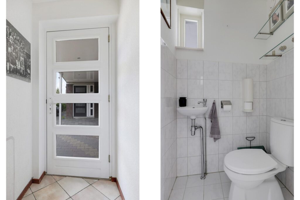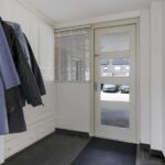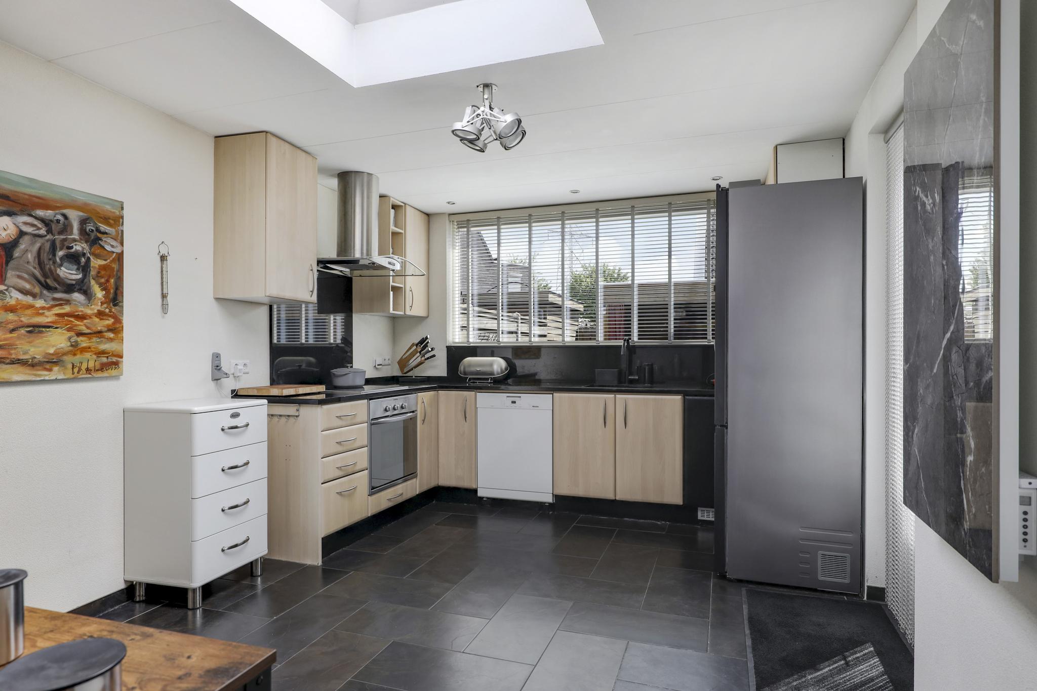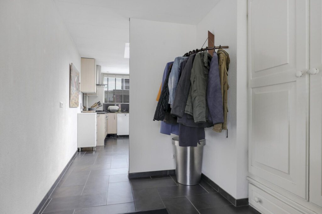Doordat de garage is verbouwd tot leefruimte, is de woning aanzienlijk groter geworden. De ruimte is opgedeeld in een leefkeuken en een bijkeuken. Overigens zou je de bijkeuken ook als 2e hal/entree kunnen zien aangezien je wellicht meer van deze deur gebruik zal maken dan de voordeur. Door het tussenwandje kijk je niet direct de keuken in en kunnen je ook hier de jassen en schoenen kwijt. De wasmachine en wasdroger zijn uit het zicht doordat ze in een kast zijn geplaatst.