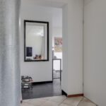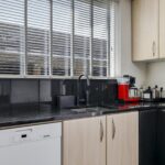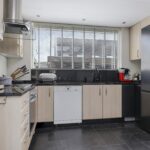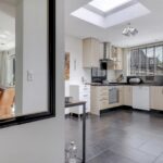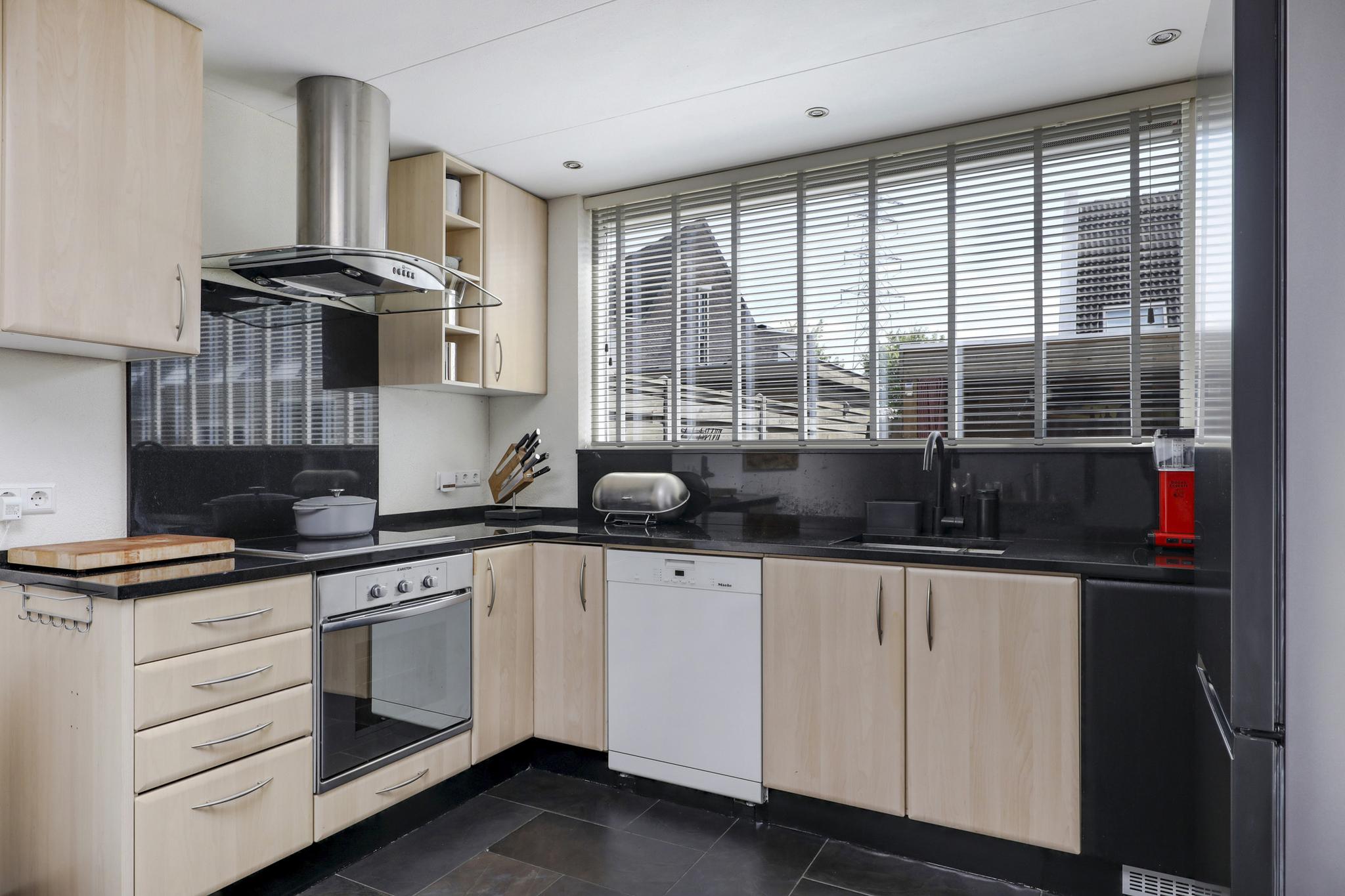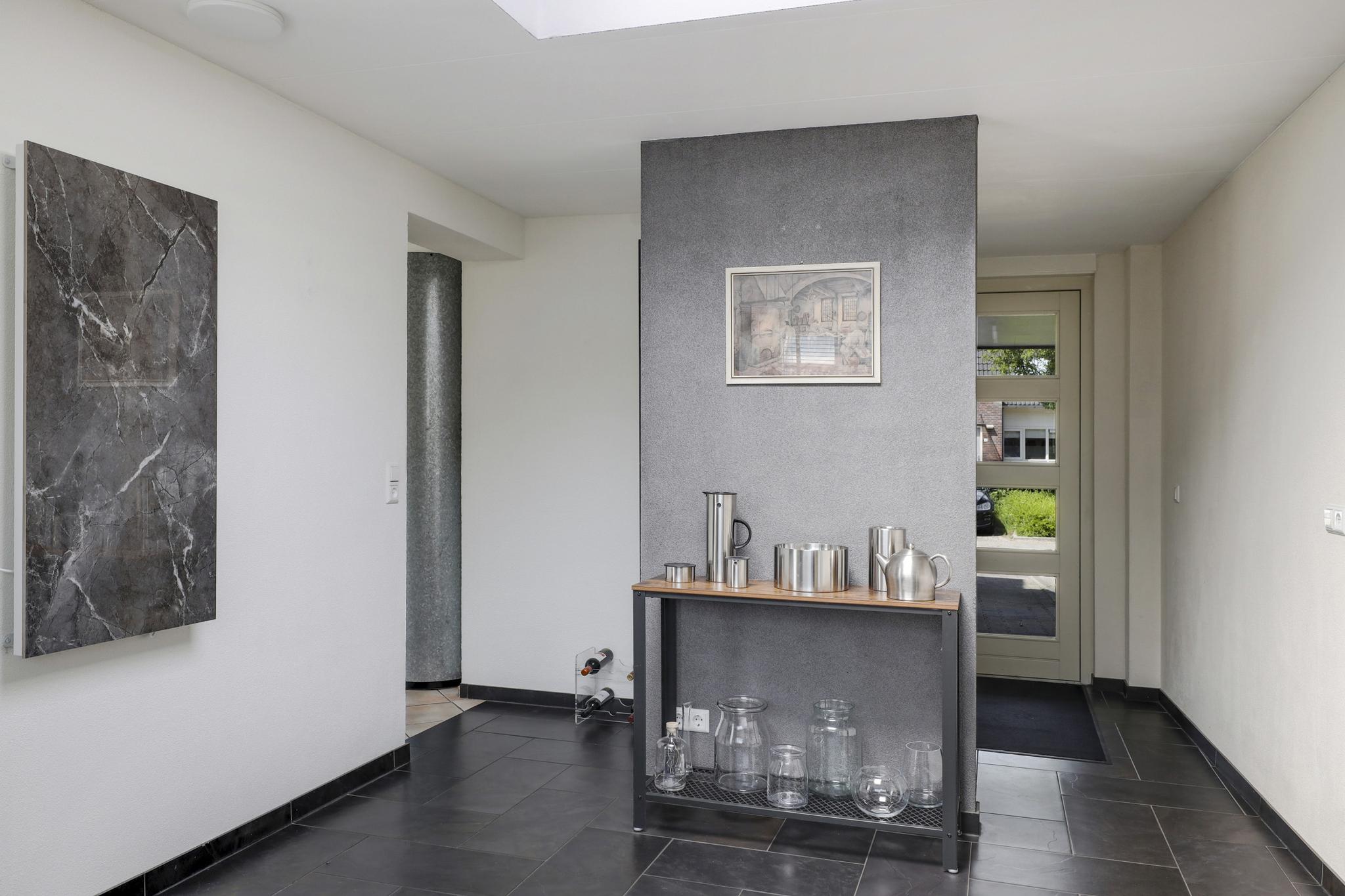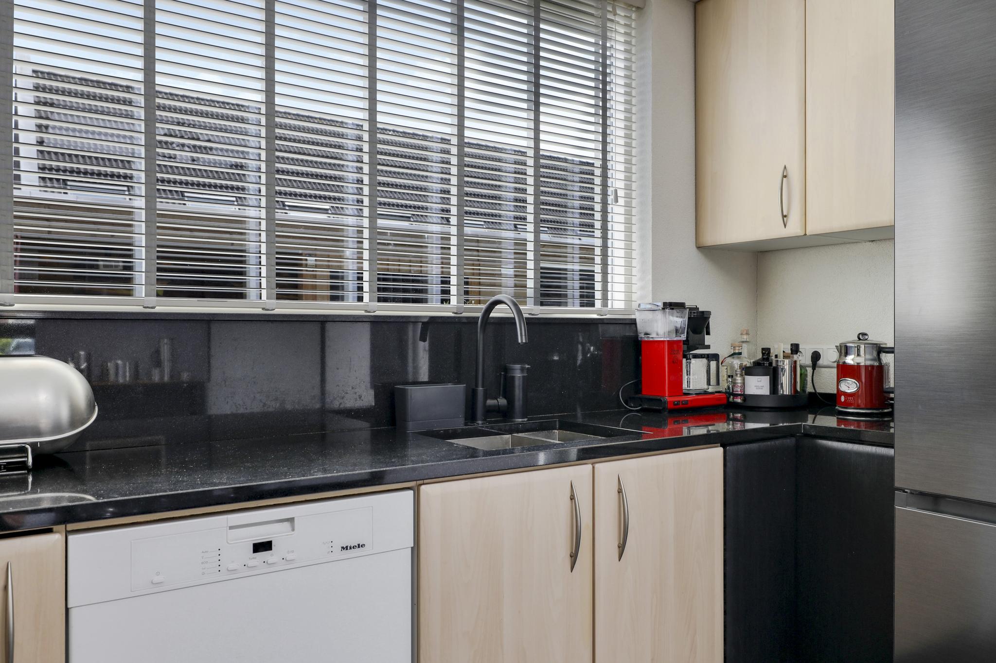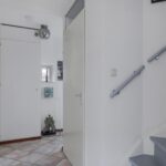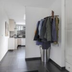 Doordat de garage is verbouwd tot leefruimte, is de woning aanzienlijk groter geworden. De ruimte is opgedeeld in een leefkeuken en een bijkeuken. Overigens zou je de bijkeuken ook als 2e hal/entree kunnen zien aangezien je wellicht meer van deze deur gebruik zal maken dan de voordeur. Door het tussenwandje kijk je niet direct de keuken in en kunnen je ook hier de jassen en schoenen kwijt. De wasmachine en wasdroger zijn uit het zicht doordat ze in een kast zijn geplaatst.