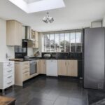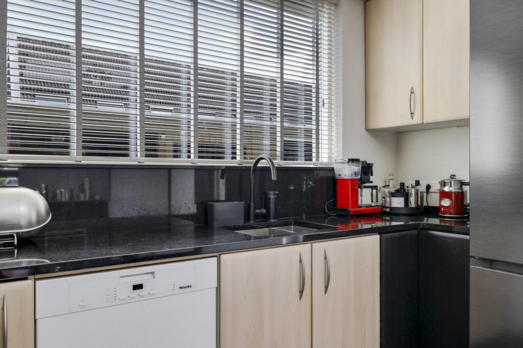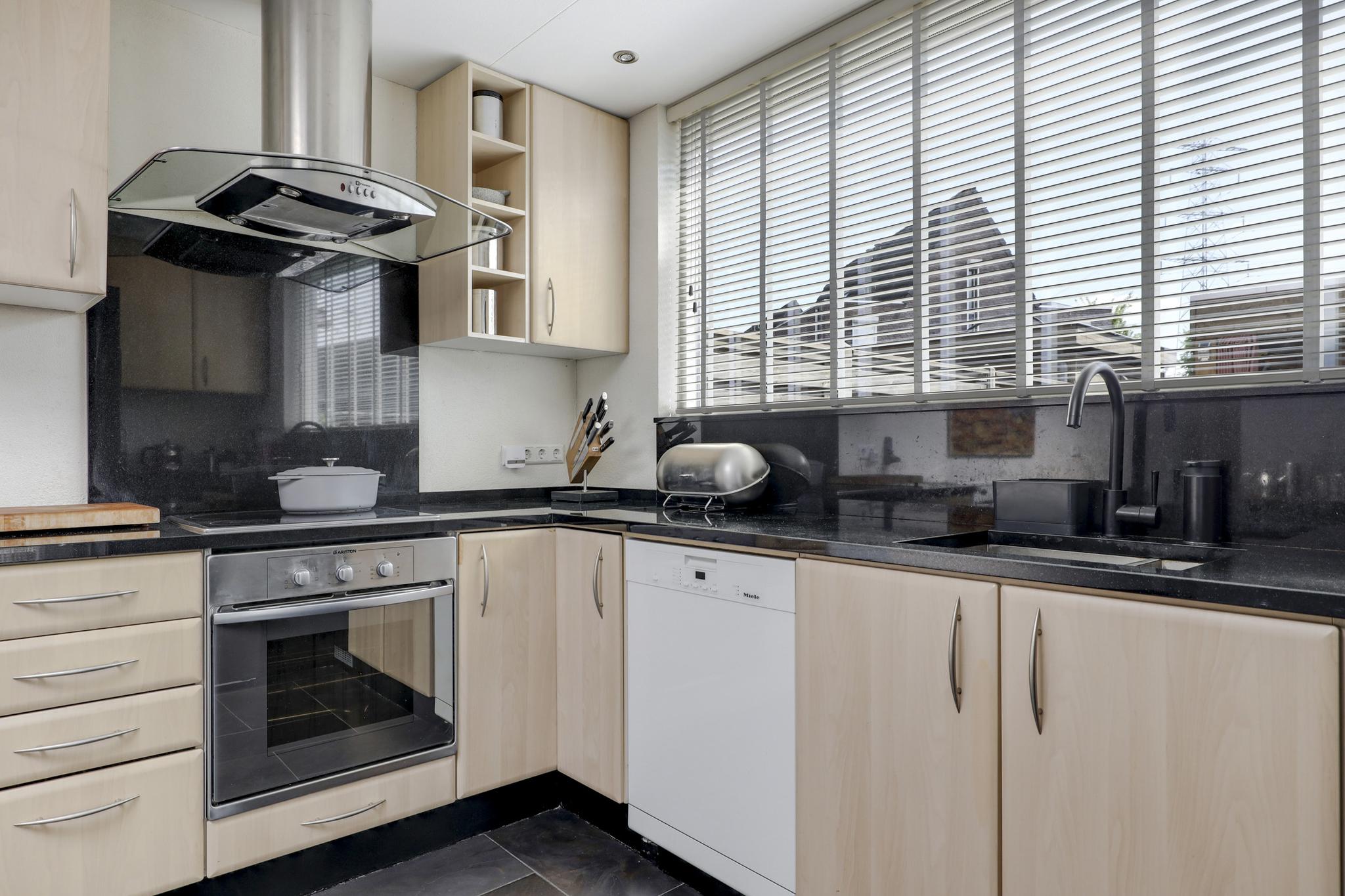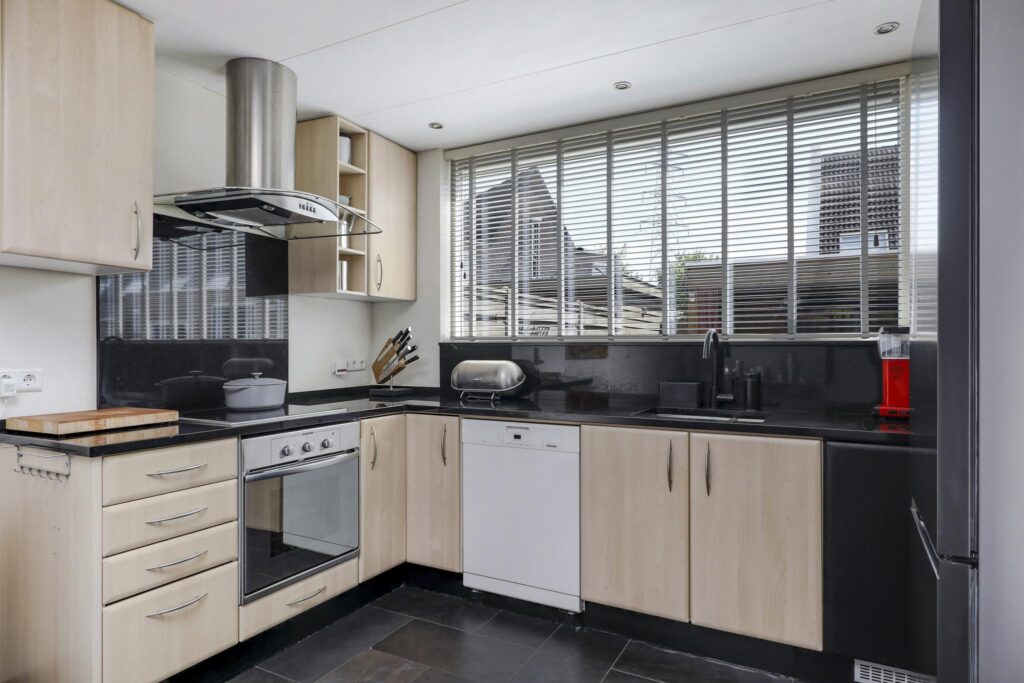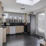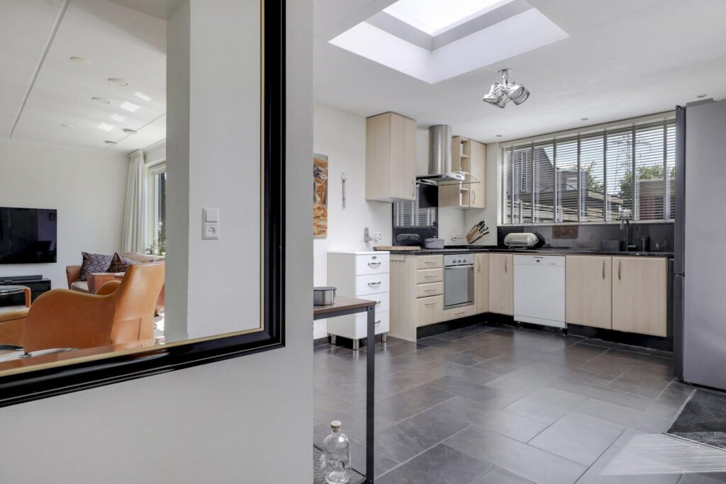 De keukenopstelling is aan de achterzijde gesitueerd en daardoor tuingericht. Het keukenblok is eenvoudig te noemen waarbij de meeste apparatuur los staat en met de verkoper mee zal gaan. Dit biedt juist de kans om geheel je eigen keuken te creëren en uit te zoeken. Je kunt er met gemak een leuke hoek- of U-opstelling kwijt. En doordat je er ook nog een ontbijt- of eettafel(tje) kwijt kunt, noemen we het al snel een ‘leefkeuken’. Opvallend is de grote lichtkoepel die voor een bijzonder aangename lichtinval zorgt, net als de extra tuindeur die direct toegang verleent tot het zonnige buitenterras.