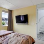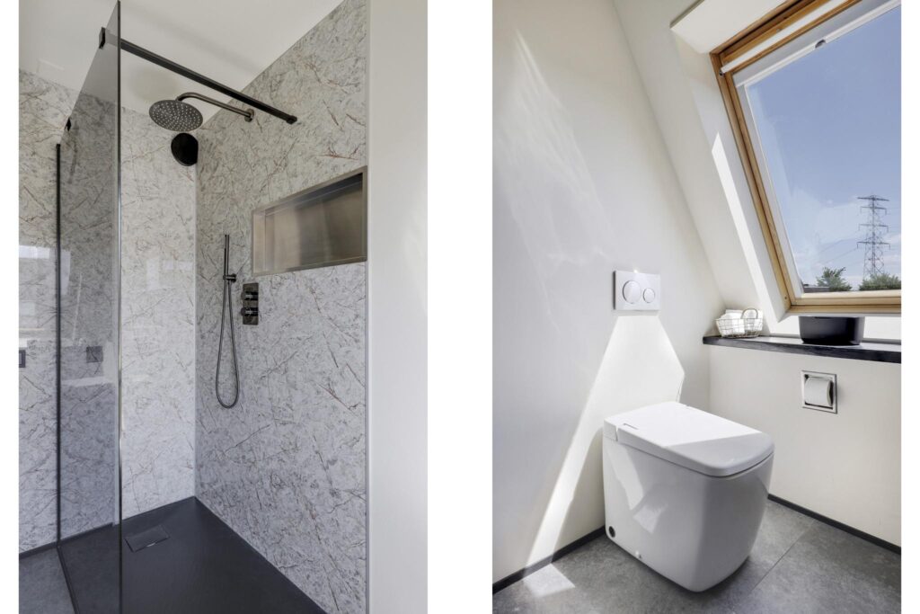 In januari van dit jaar is de volledige badkamer vernieuwd. Er zijn daarbij goede keuzes gemaakt met luxe sanitair en trendy afwerking. De ruimte is ingedeeld met een inloopdouche, een 2e toilet en een breed 2-persoons wastafelmeubel. Dit wasmeubel heeft brede ladekorven waar je veel toiletspullen in kwijt kunt. Erboven hangt een spiegel die is v.v. van verlichting en verwarming waardoor deze niet snel zal beslaan. De inloopdouche heeft zowel een rainshower als een handdouche. In het nisje in de wand kun je een douchegel kwijt. Het meest bijzondere is toch wel het toilet. Deze doet eigenlijk ‘alles’ op afstandsbediening. Zo is de toiletbril verwarmd en heeft het Led-verlichting. Een dakvenster (met verduisteringsscherm) zorgt niet alleen voor daglicht, maar ook voor de ideale ventilatiemogelijkheid.