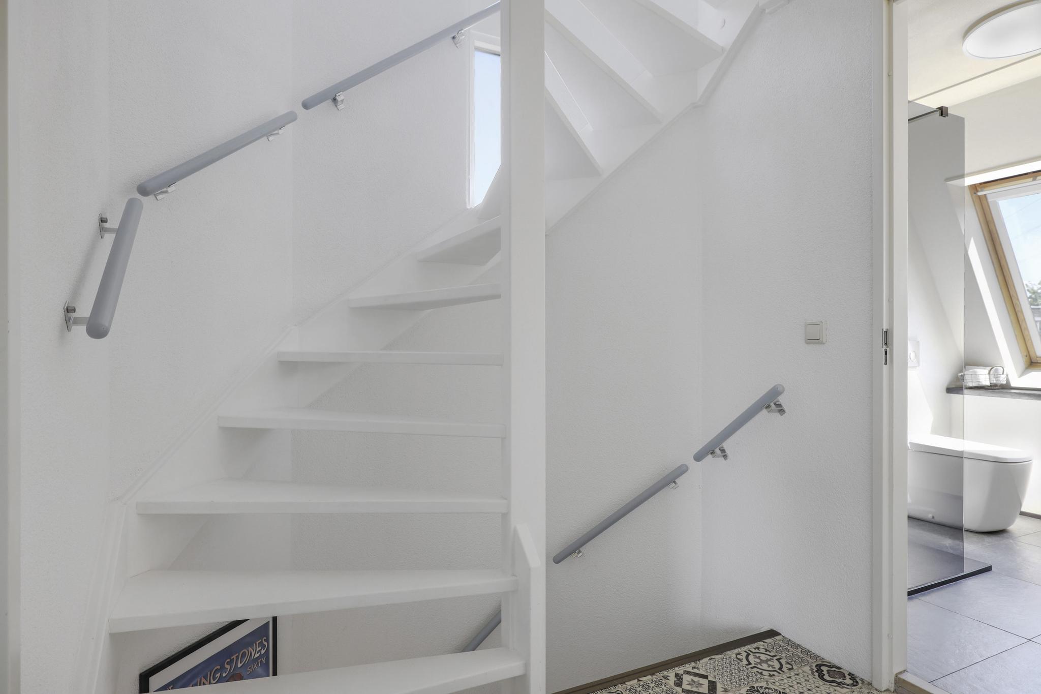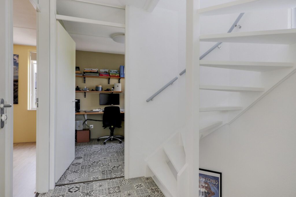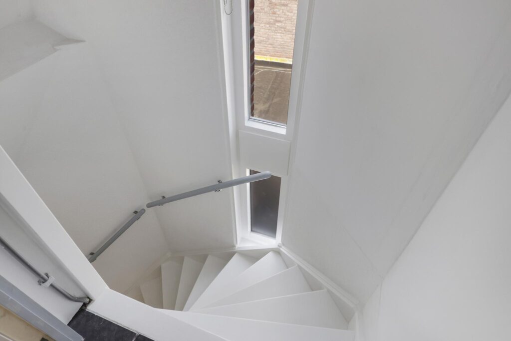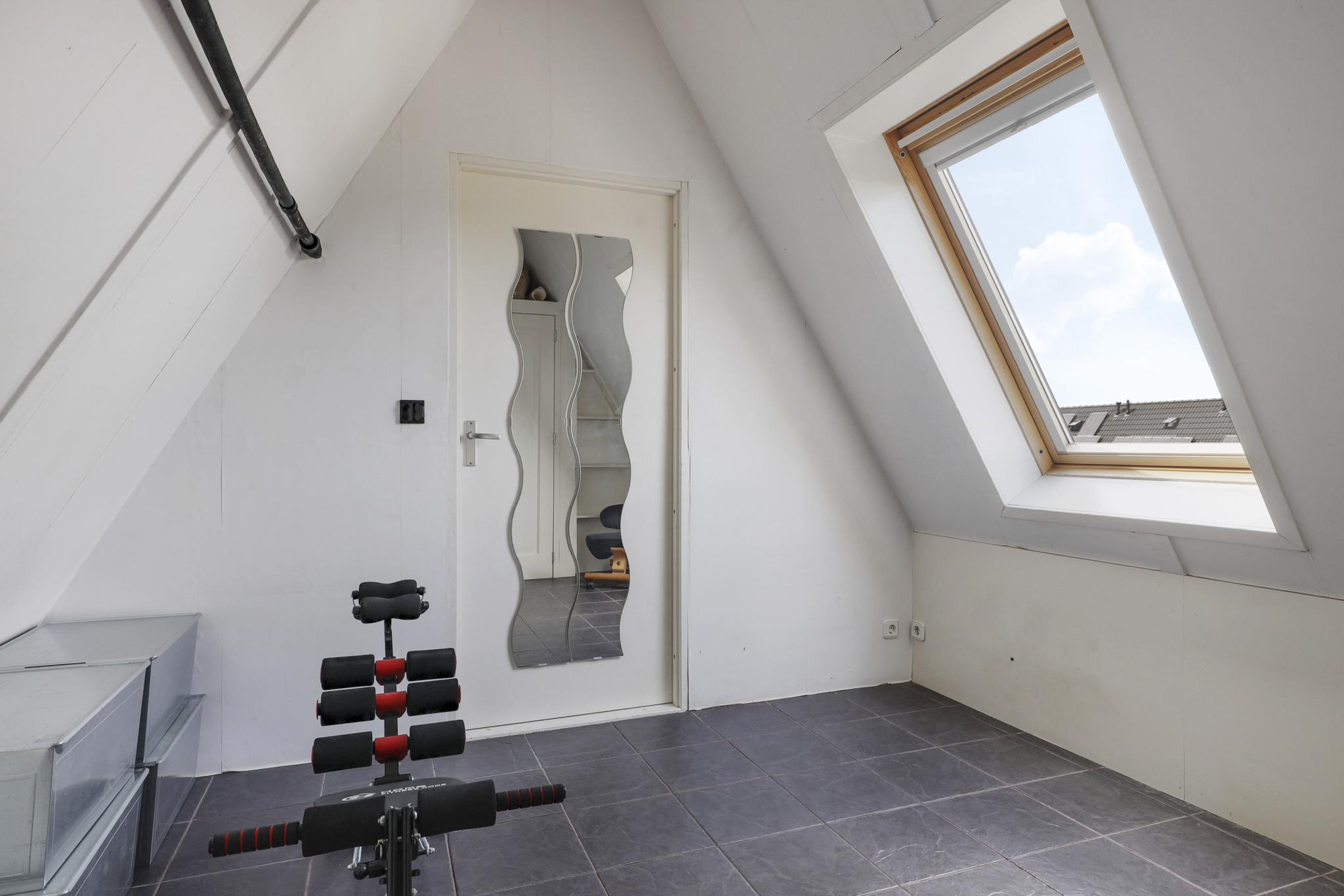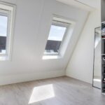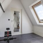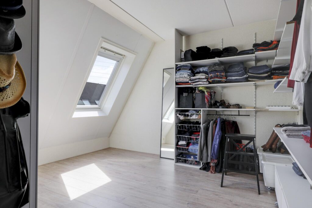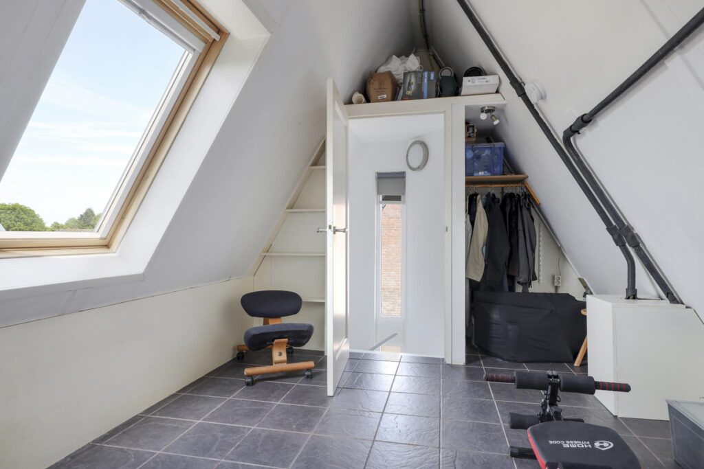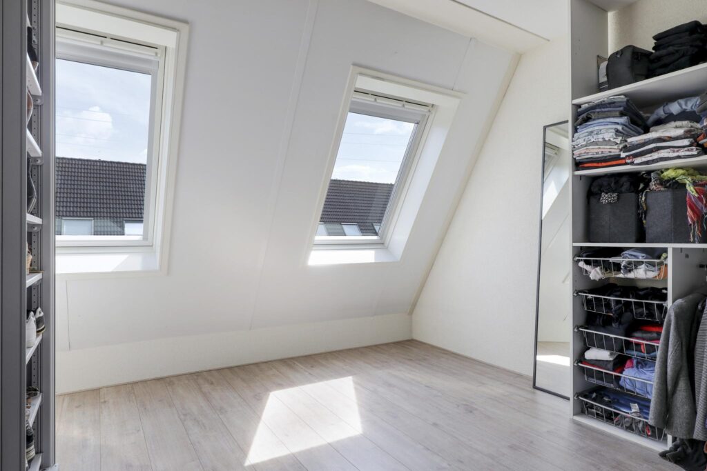 Deze woonlaag is wat krapper, maar biedt nog steeds de mogelijkheid om een 4e slaapkamer te creëren. Het trappengat is afsluitbaar middels een deur. Achterin de kamer is een inloopkast aanwezig waar je de nodige spullen kunt opbergen. Ook is hier de WTW-unit geïnstalleerd. De (slaap)kamer is multifunctioneel te gebruiken. Je zou het bijvoorbeeld ook kunnen inrichten als hobby- of werkkamer. Een dakvenster zorgt voor een prettige lichtinval. Hetzelfde geldt voor het trappenhuis waar een smal, maar hoog raam (ook op de overloop) voor veel lichtinval zorgt.