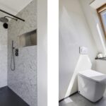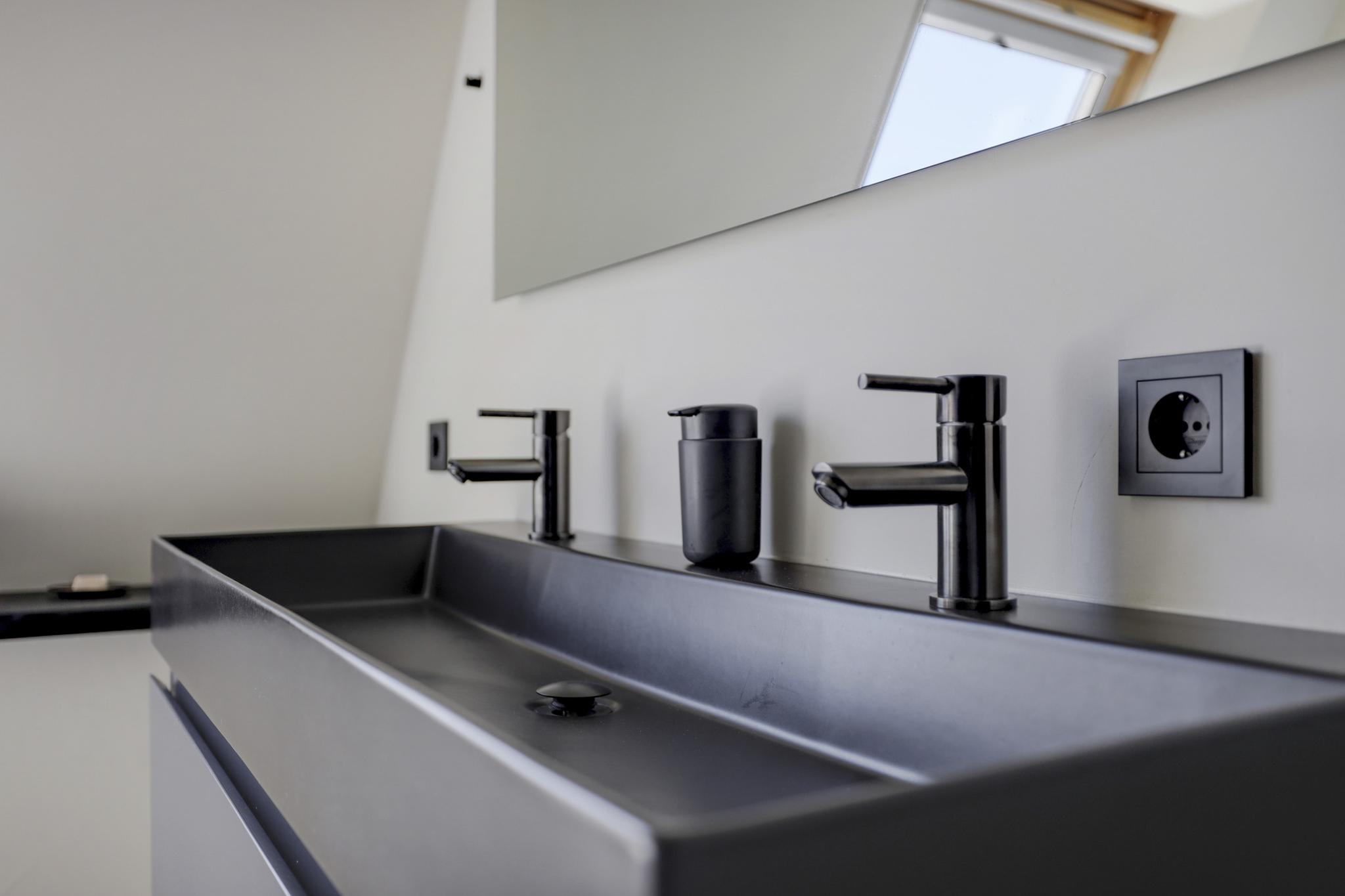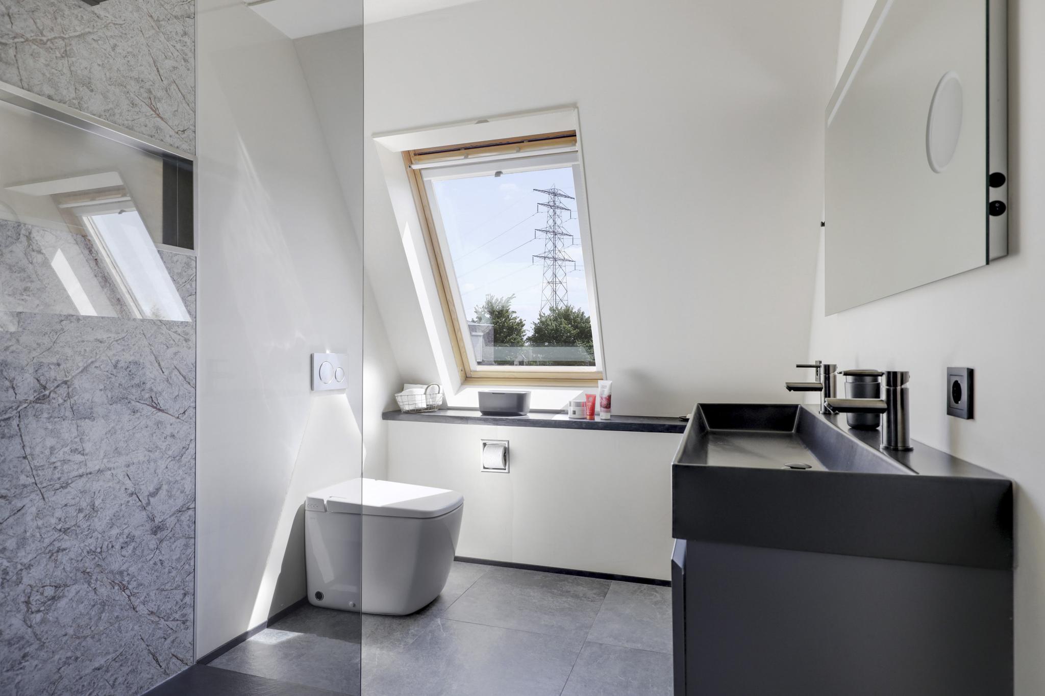 Badkamer met inloopdouche, 2-persoons wastafelmeubel, 2e toilet en dakvenster (v.v. verduisteringsscherm).