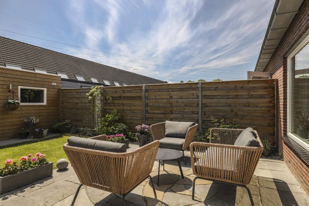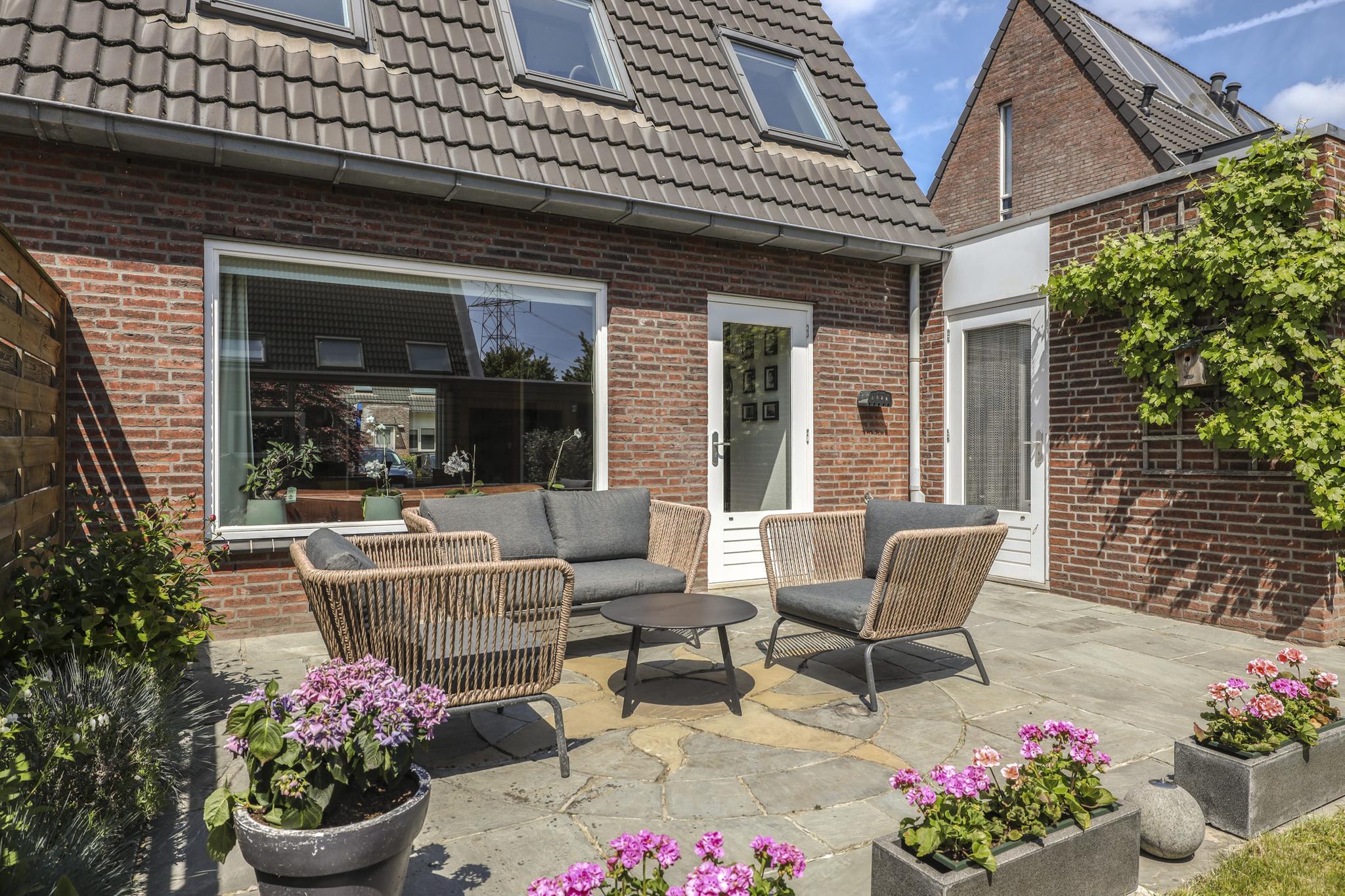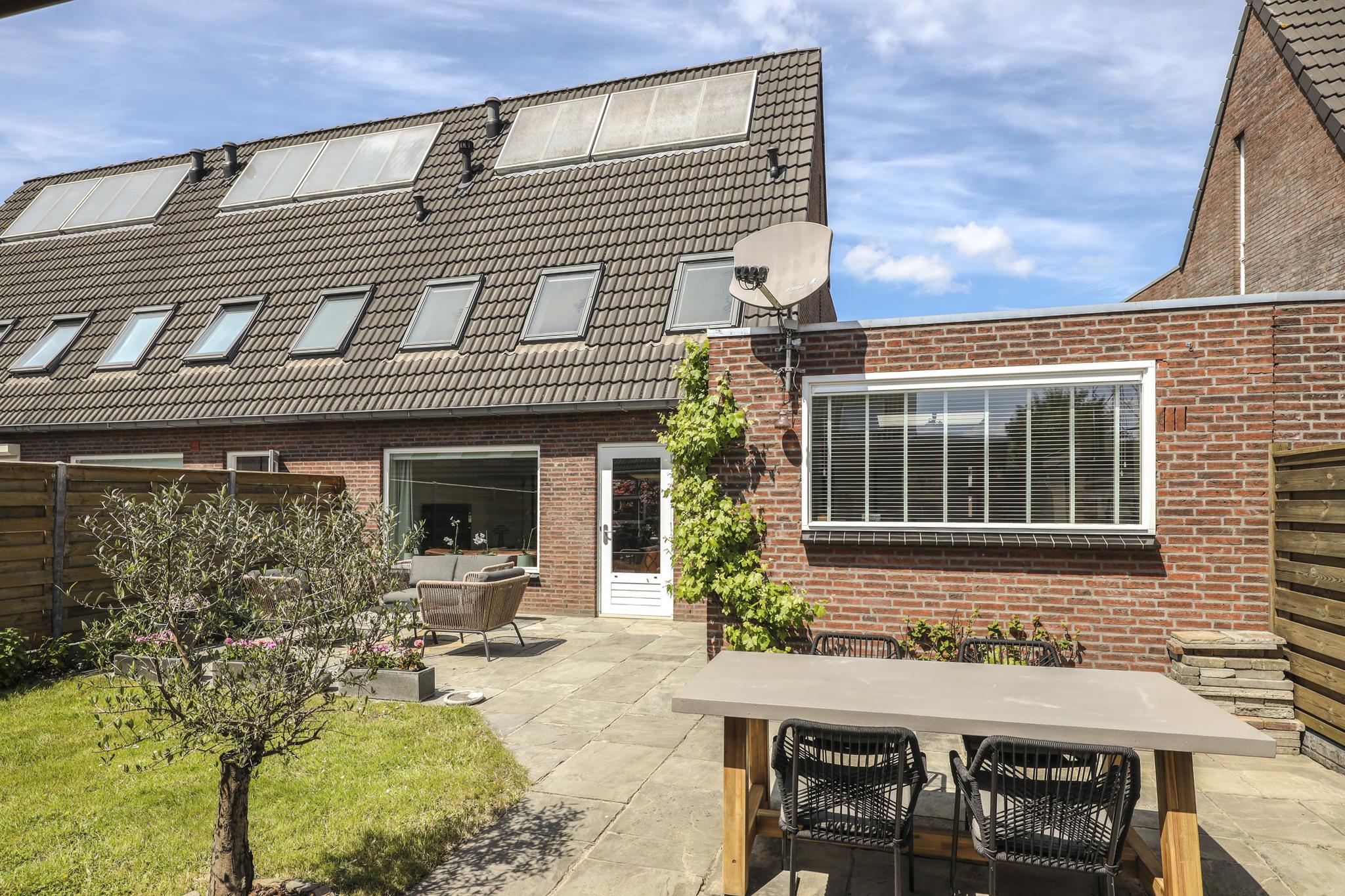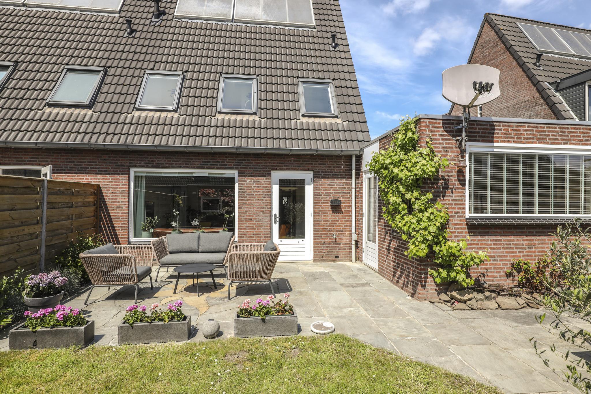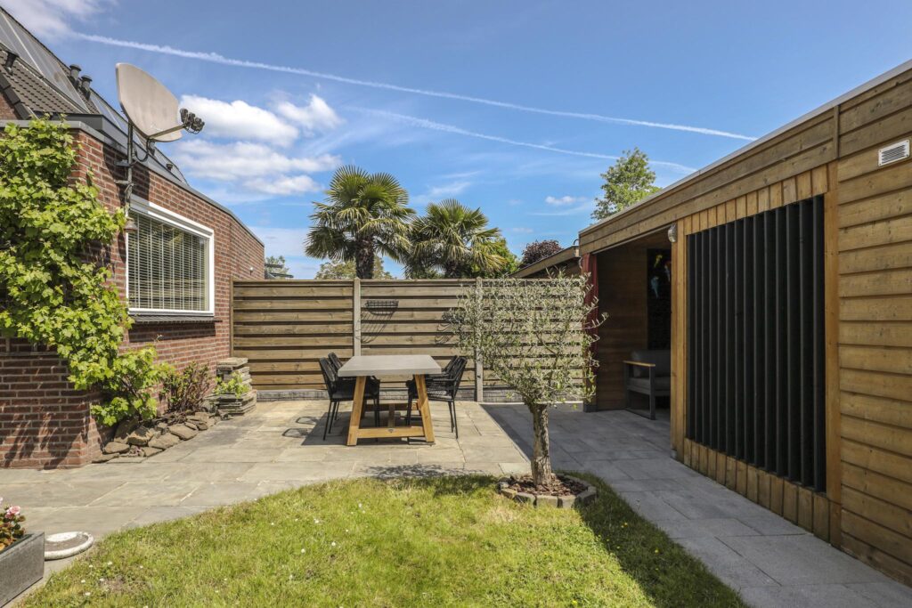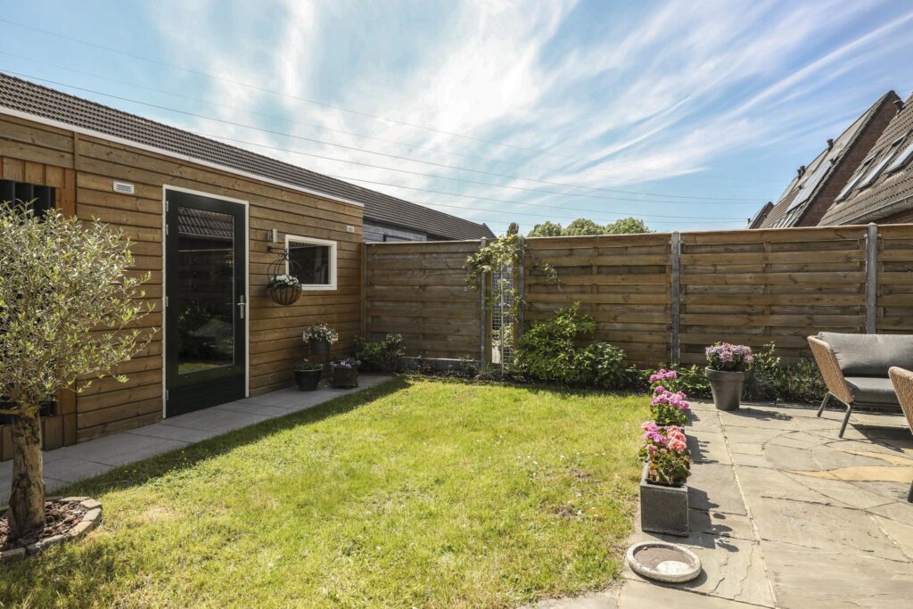 Ben je een tuinliefhebber, dan zal je deze tuin zeker aanspreken. De tuin ligt niet alleen gunstig op de zon (pal zuid), maar heeft ook een mooie breedtemaat. Dit komt doordat de woning van zichzelf al iets breder is dan gemiddeld en er van oorsprong nog een garage naast staat. Er zijn 2 terrassen aangelegd waar je de gehele dag in de zon kunt zitten. De grote leistenen tegels vergroten het ruimtelijke gevoel waarbij een stukje grasveld, een olijfboom, een druivenstruik en enkele borders voor een groen karakter zorgen. Op beide erfgrenzen met de buren zijn degelijke schuttingen met betonpalen geplaatst.