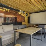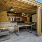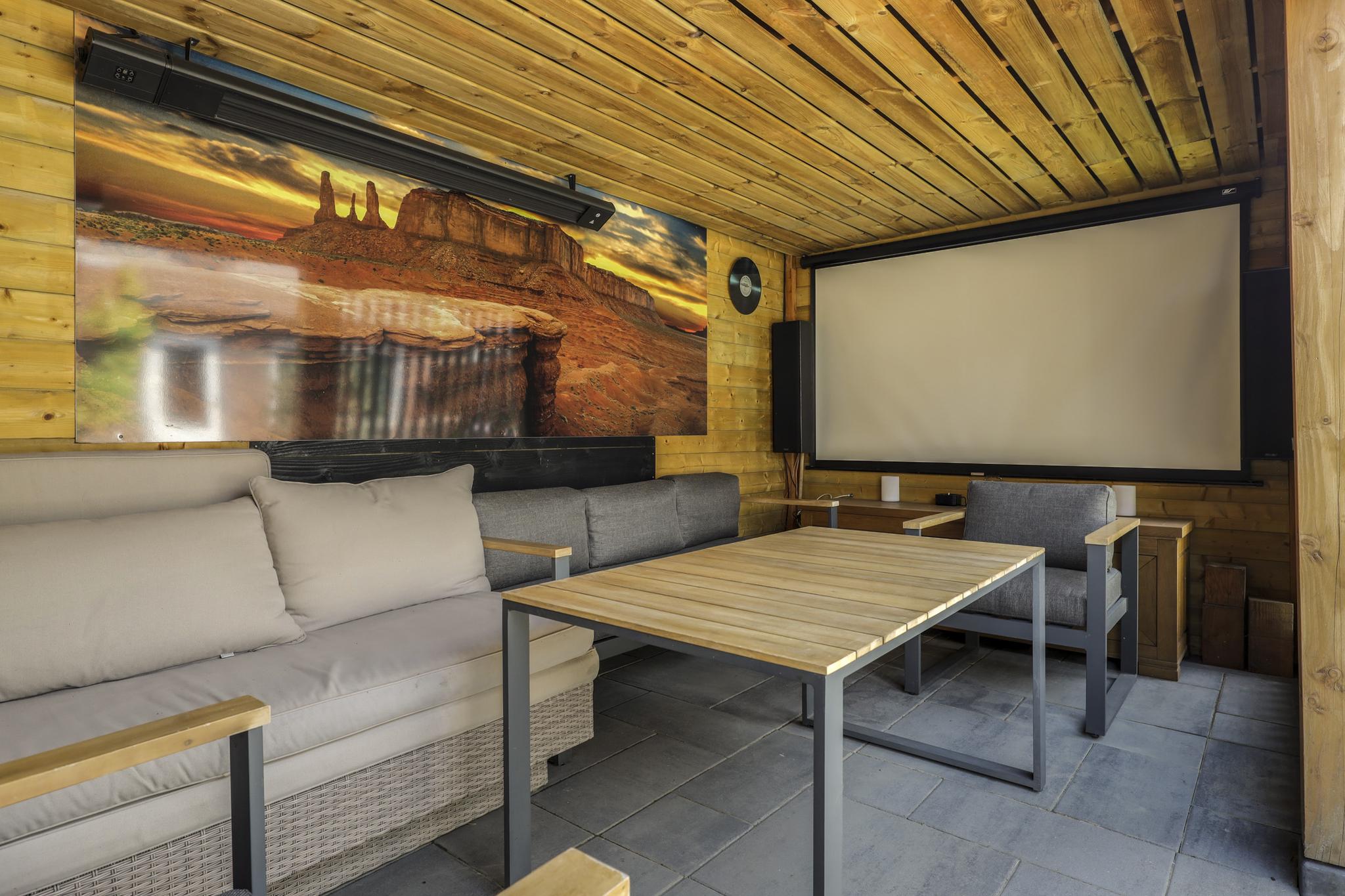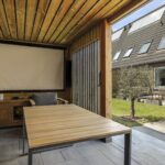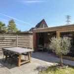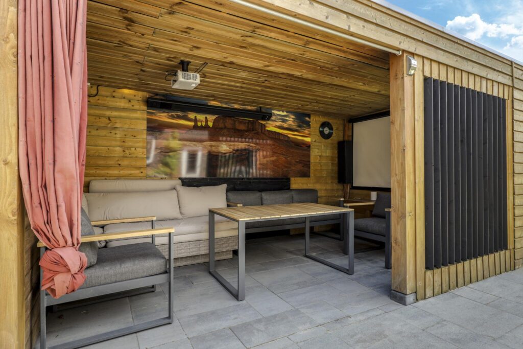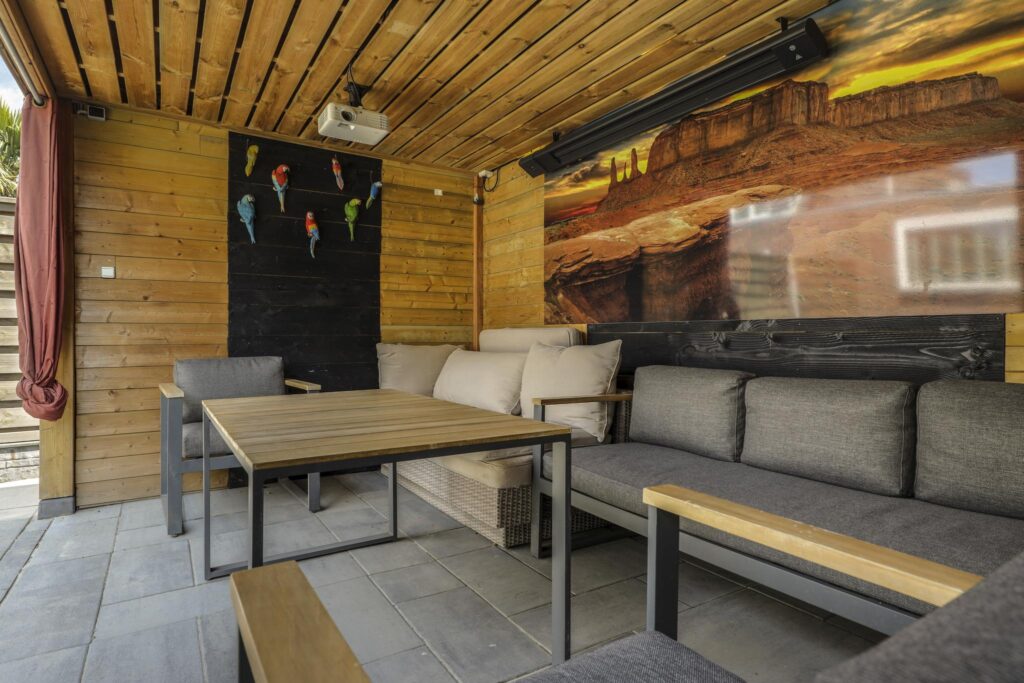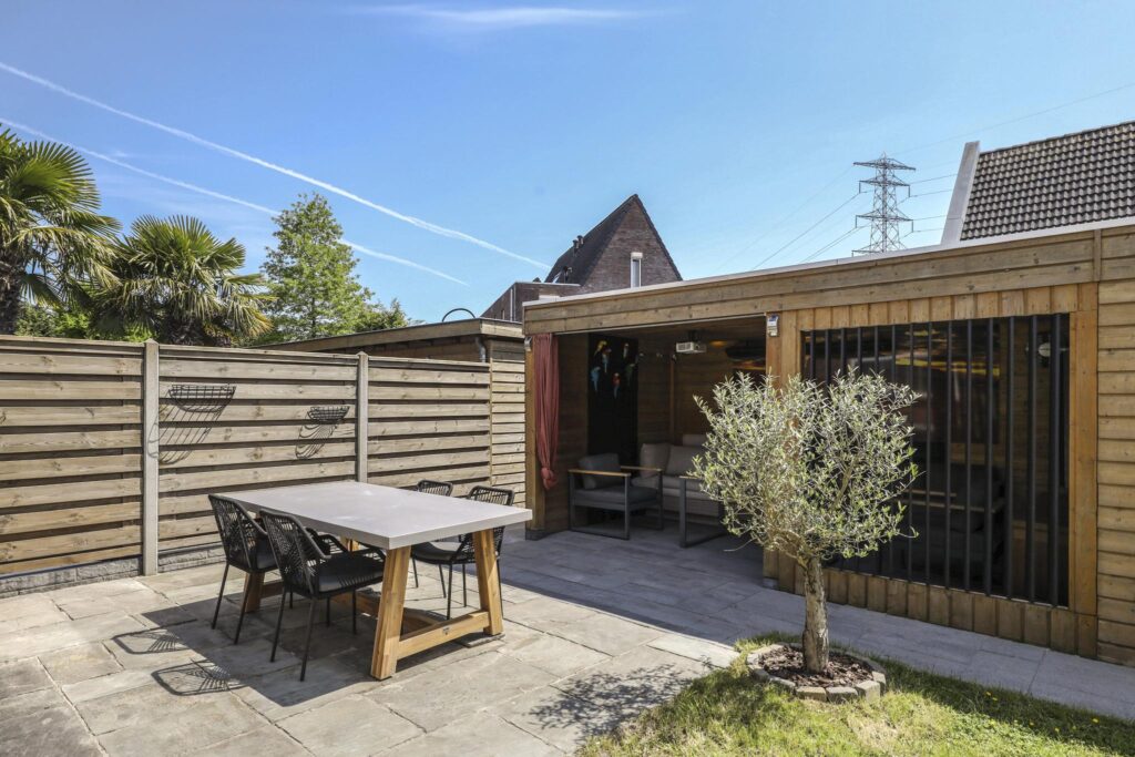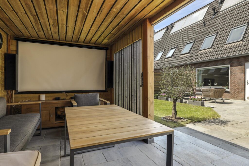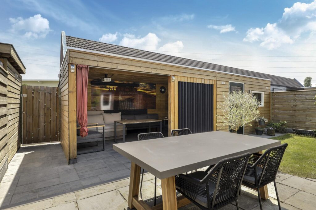 De veranda is een heerlijke plek om (beschut) te zitten, zeker op een warme zomerdag en je graag de schaduw opzoekt. Met ca. 13m2 kun je er een lekkere loungeset kwijt. Leuk detail zijn de ‘draaishutters’ aan de voorzijde die voor een speels element in de veranda zorgen. De veranda is verder voorzien van elektra waardoor je de mogelijkheid hebt om bijvoorbeeld een beamer (met groot scherm) en geluidsboxen te plaatsen.