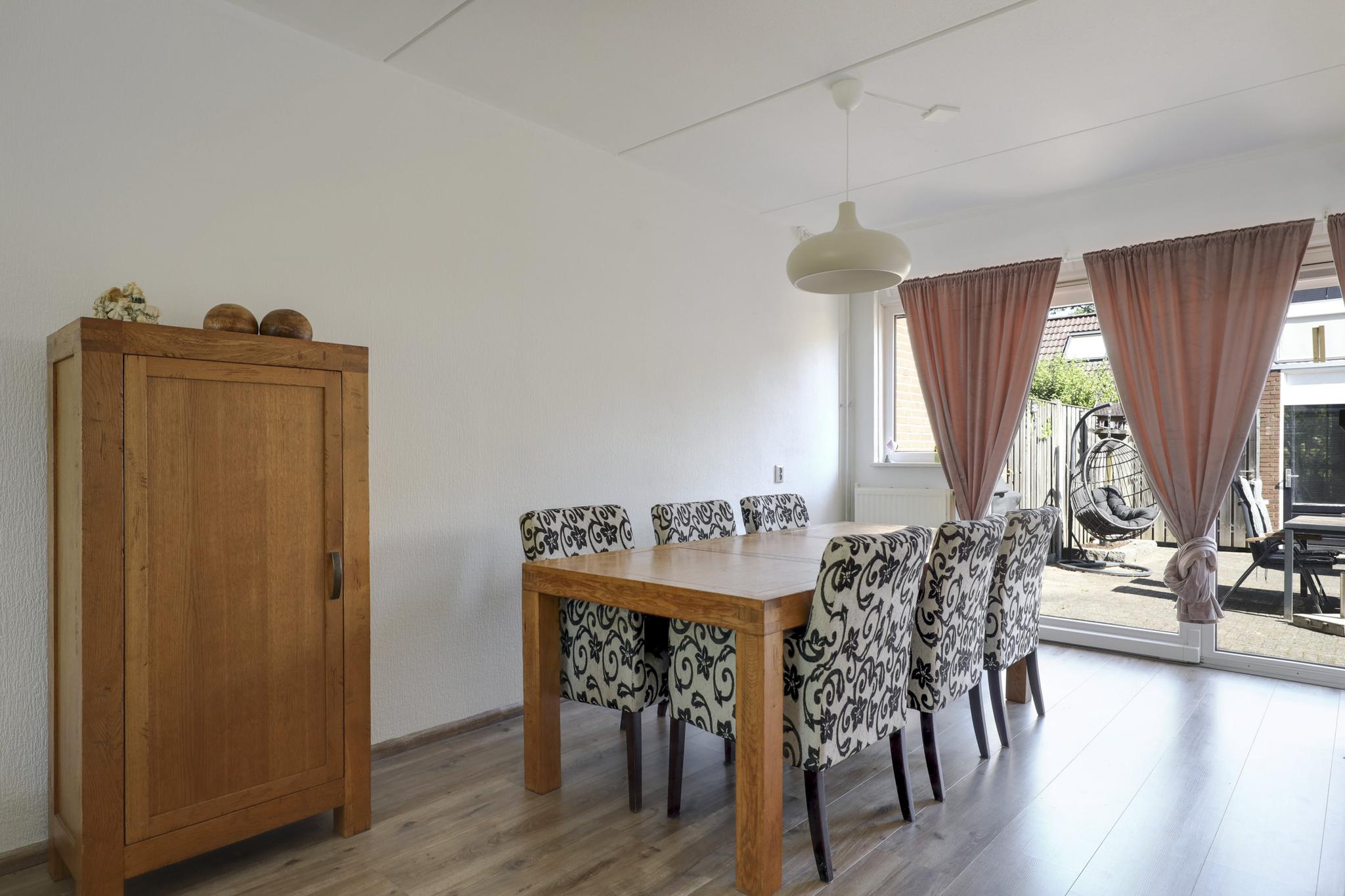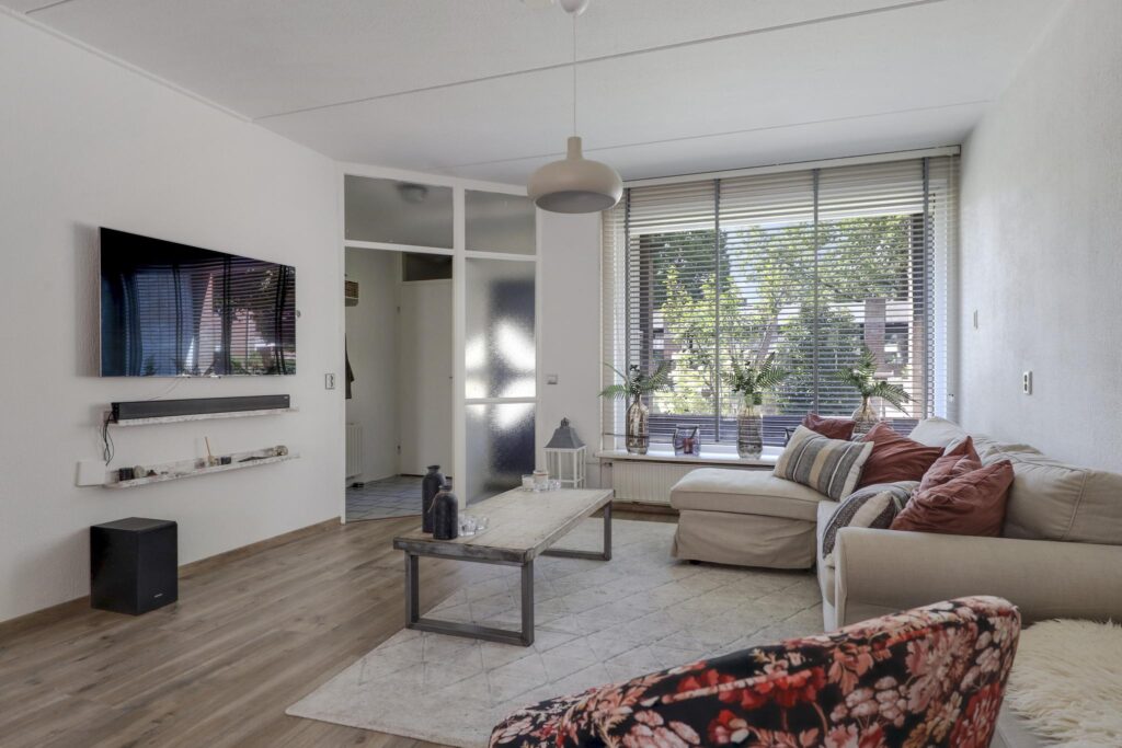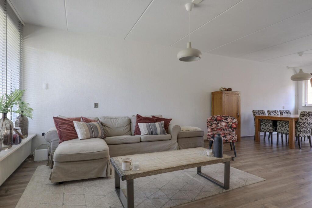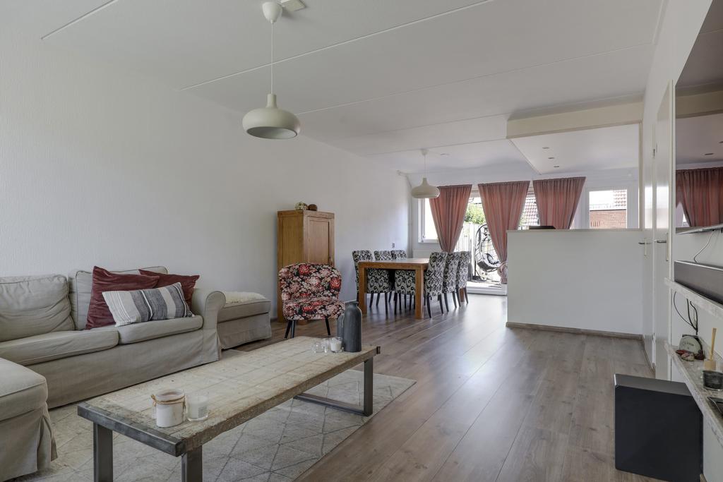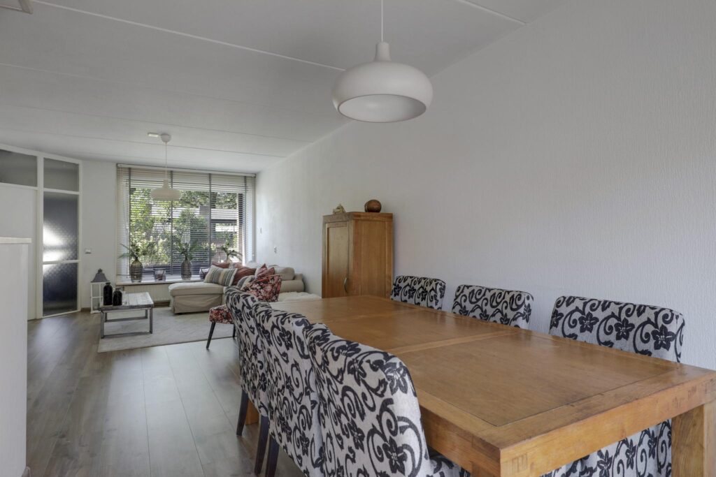 Bij binnenkomst in de woonkamer valt het fijne woonklimaat direct op. De grote raampartijen bieden veel lichtinval waardoor de ruimte aangenaam aanvoelt. De afwerking is verzorgd en neutraal te noemen met o.a. een houtlook laminaatvloer en lichte wanden. Het goede formaat biedt ruimte voor een grote hoekbank en een 6-persoons eettafel. In de zomerdag zet je de schuifpui open waardoor je de tuin eenvoudig bij de woonkamer betrekt. Naast de schuifpui is tevens een loopdeur aanwezig. Opvallend zijn de 2 vaste kasten (onder de trap) die voor bijzonder veel opbergruimte zorgen (voorraad, stofzuiger, enz.).