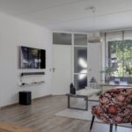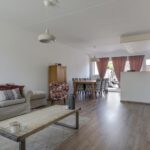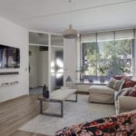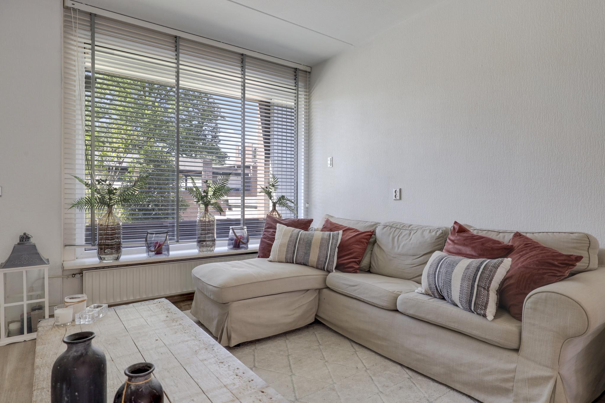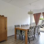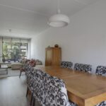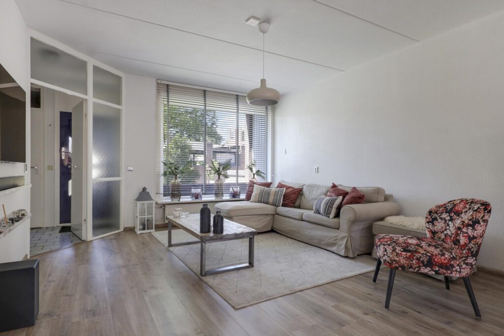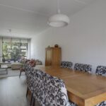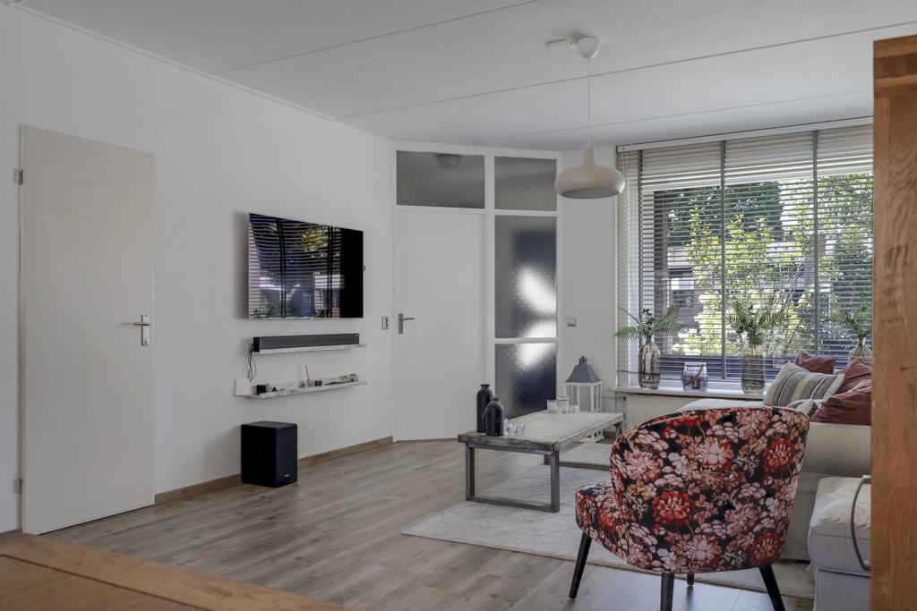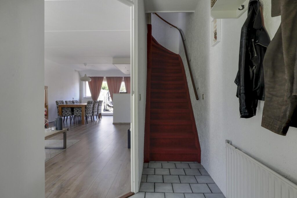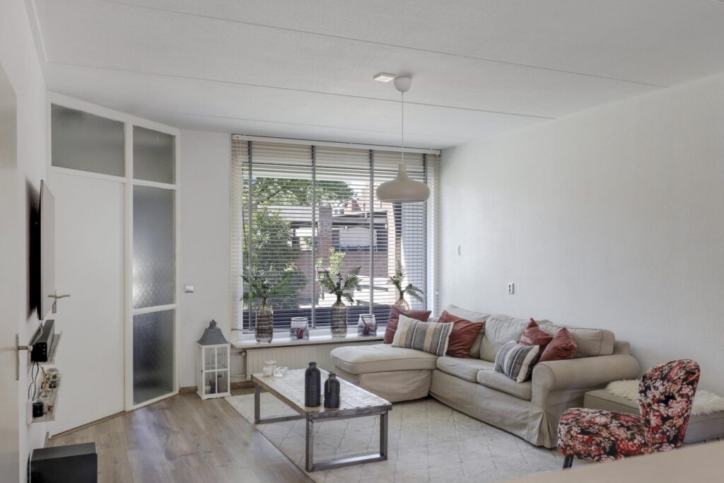 Bij binnenkomst in de woonkamer valt het fijne woonklimaat direct op. De grote raampartijen bieden veel lichtinval waardoor de ruimte aangenaam aanvoelt. De afwerking is verzorgd en neutraal te noemen met o.a. een houtlook laminaatvloer en lichte wanden. Het goede formaat biedt ruimte voor een grote hoekbank en een 6-persoons eettafel. In de zomerdag zet je de schuifpui open waardoor je de tuin eenvoudig bij de woonkamer betrekt. Naast de schuifpui is tevens een loopdeur aanwezig. Opvallend zijn de 2 vaste kasten (onder de trap) die voor bijzonder veel opbergruimte zorgen (voorraad, stofzuiger, enz.).