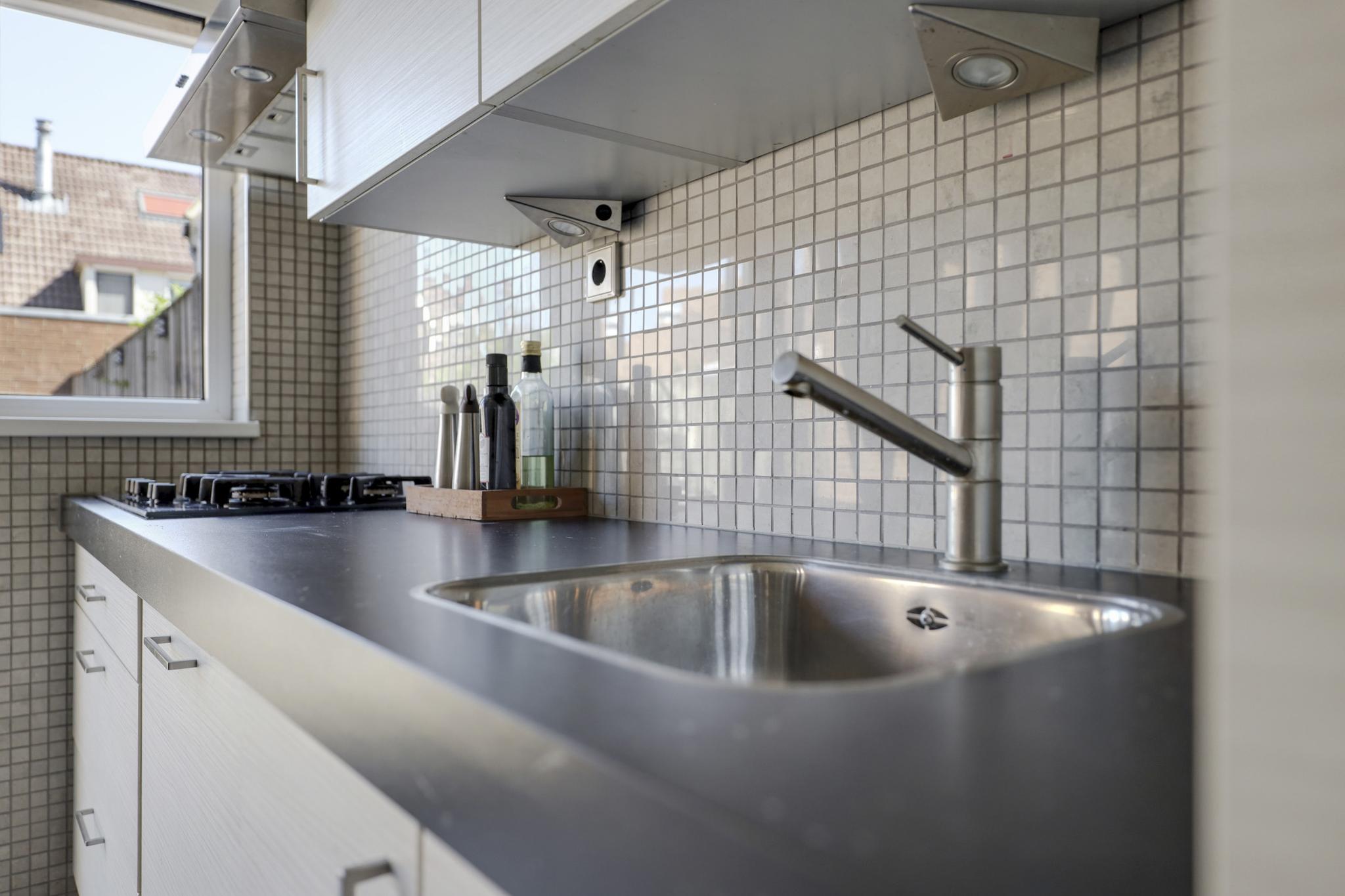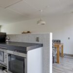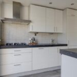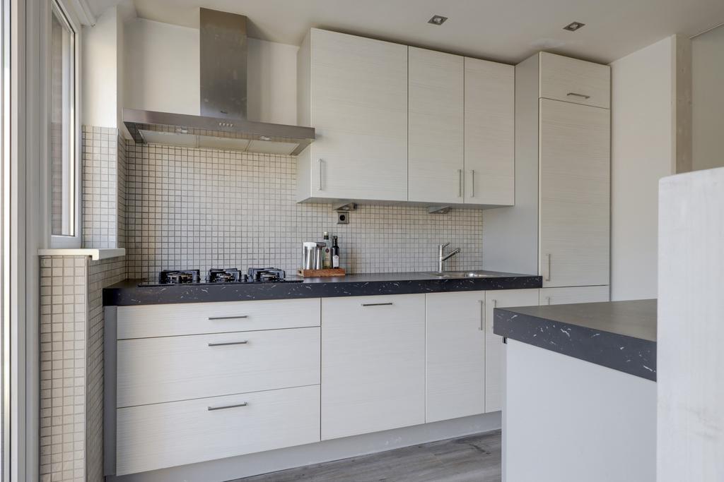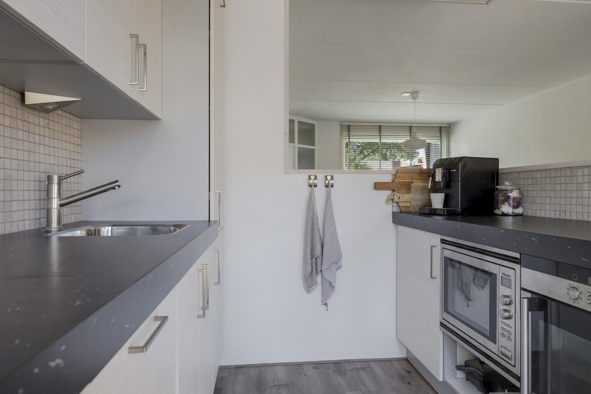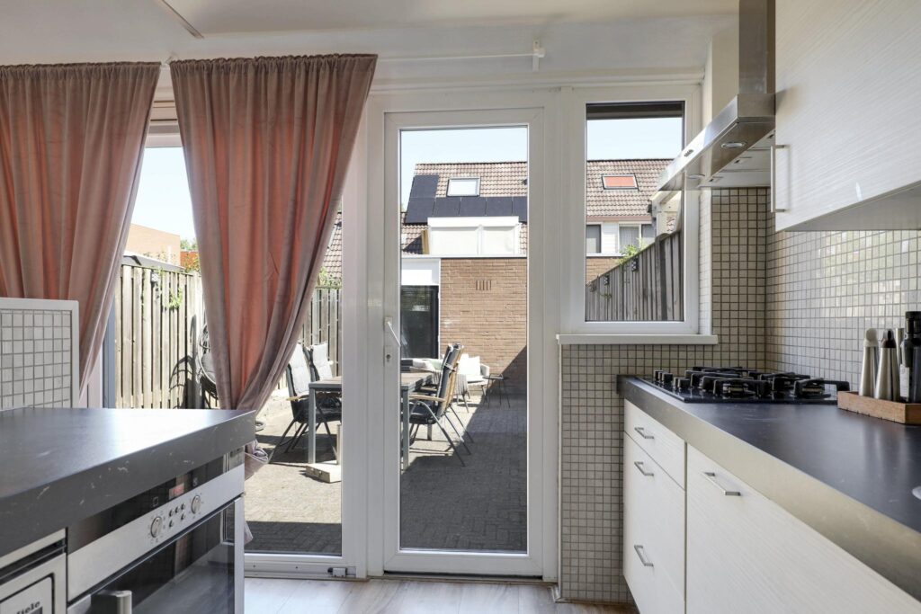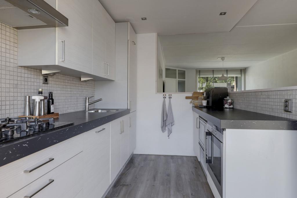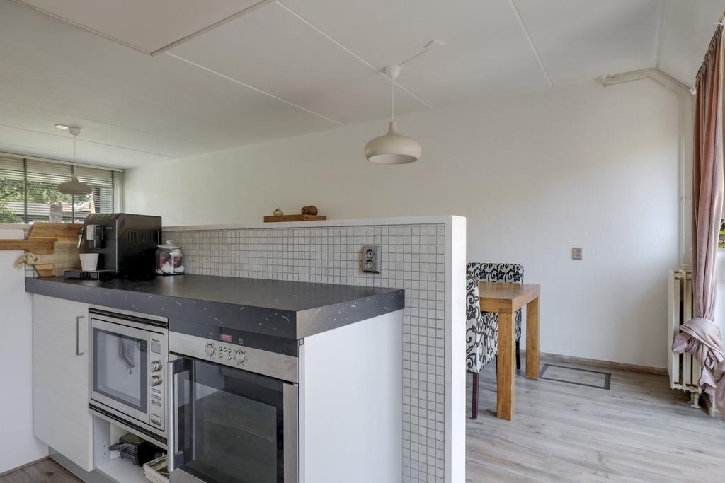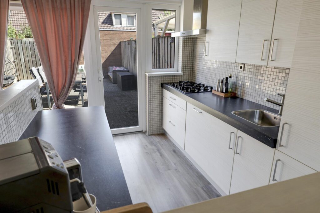 De keuken bevindt zich aan de achterzijde van de woning. De keuken staat in open verbinding met de woonkamer waardoor je contact kunt houden met het gezin wanneer je een maaltijd bereid. Door de lage scheidingwand behoud je dit contact, maar kijk je vanaf de bank niet direct op het aanrecht. De keuken heeft een tijdloze uitstraling met lichte fronten een donker blad. Een leuk detail is dat de fronten zijn voorzien van een houtlook. Het keukenblok is daarbij voorzien van alle wenselijke inbouwapparatuur, zijnde een 5-pits gaskookplaat, een afzuigkap, een vaatwasser, een koel/vries-combinatie, een oven en een combi-oven/magnetron. In het plafond en onder de bovenkasten zijn inbouwspots verwerkt.