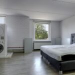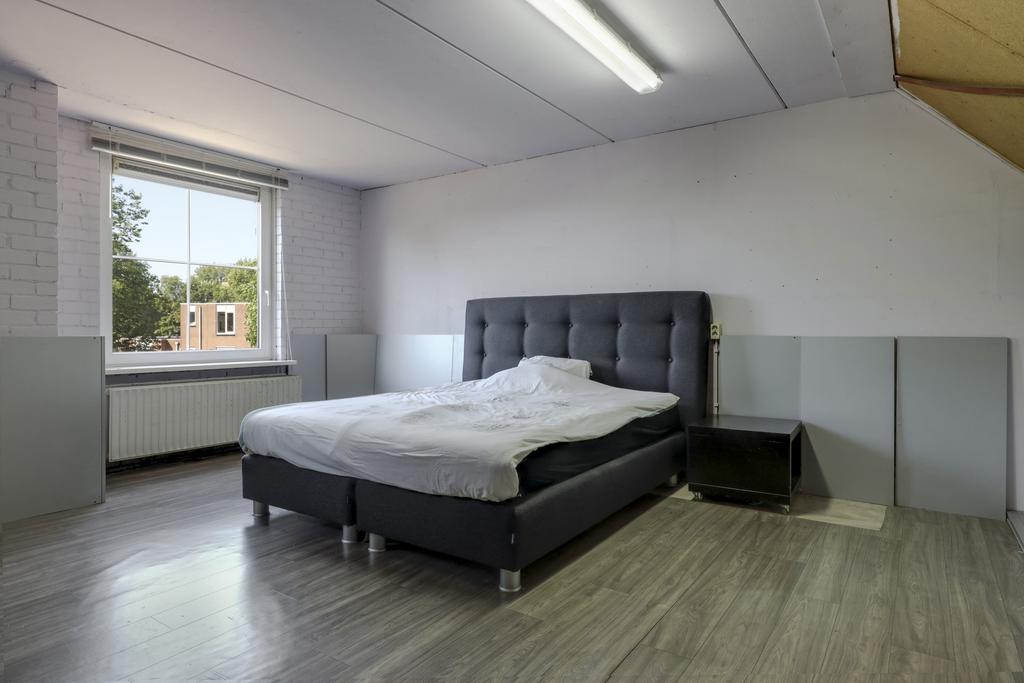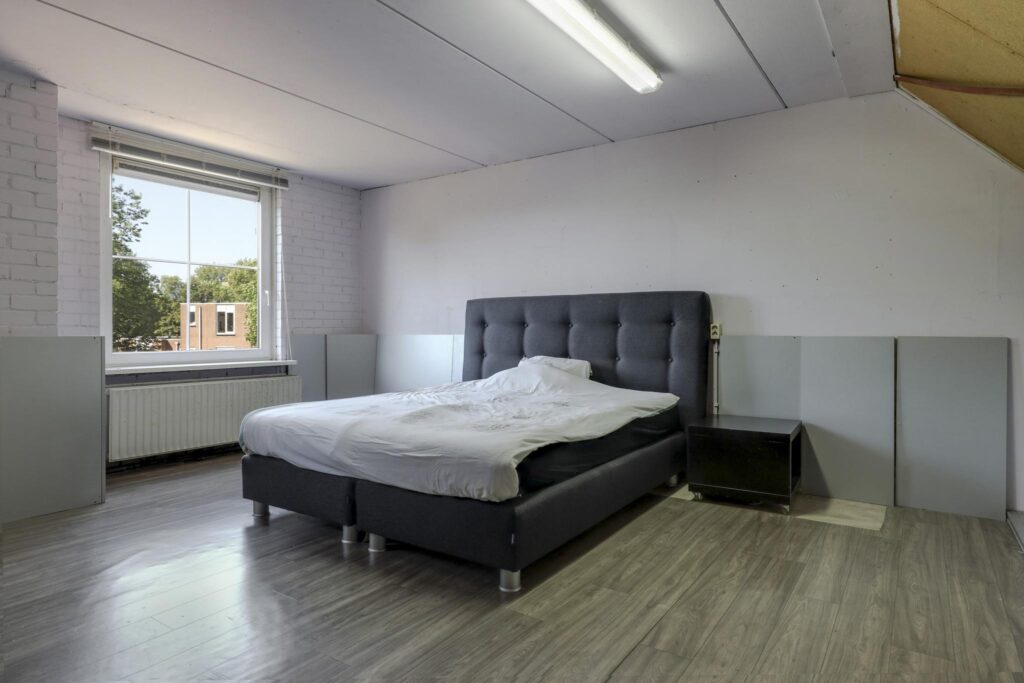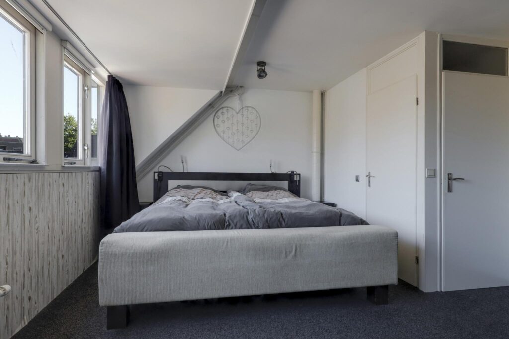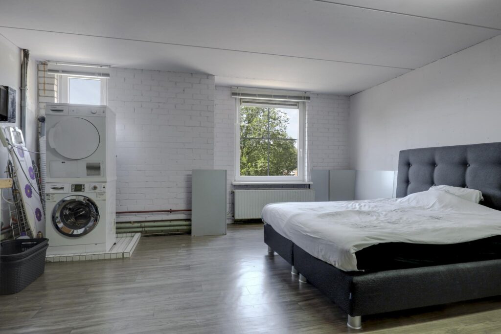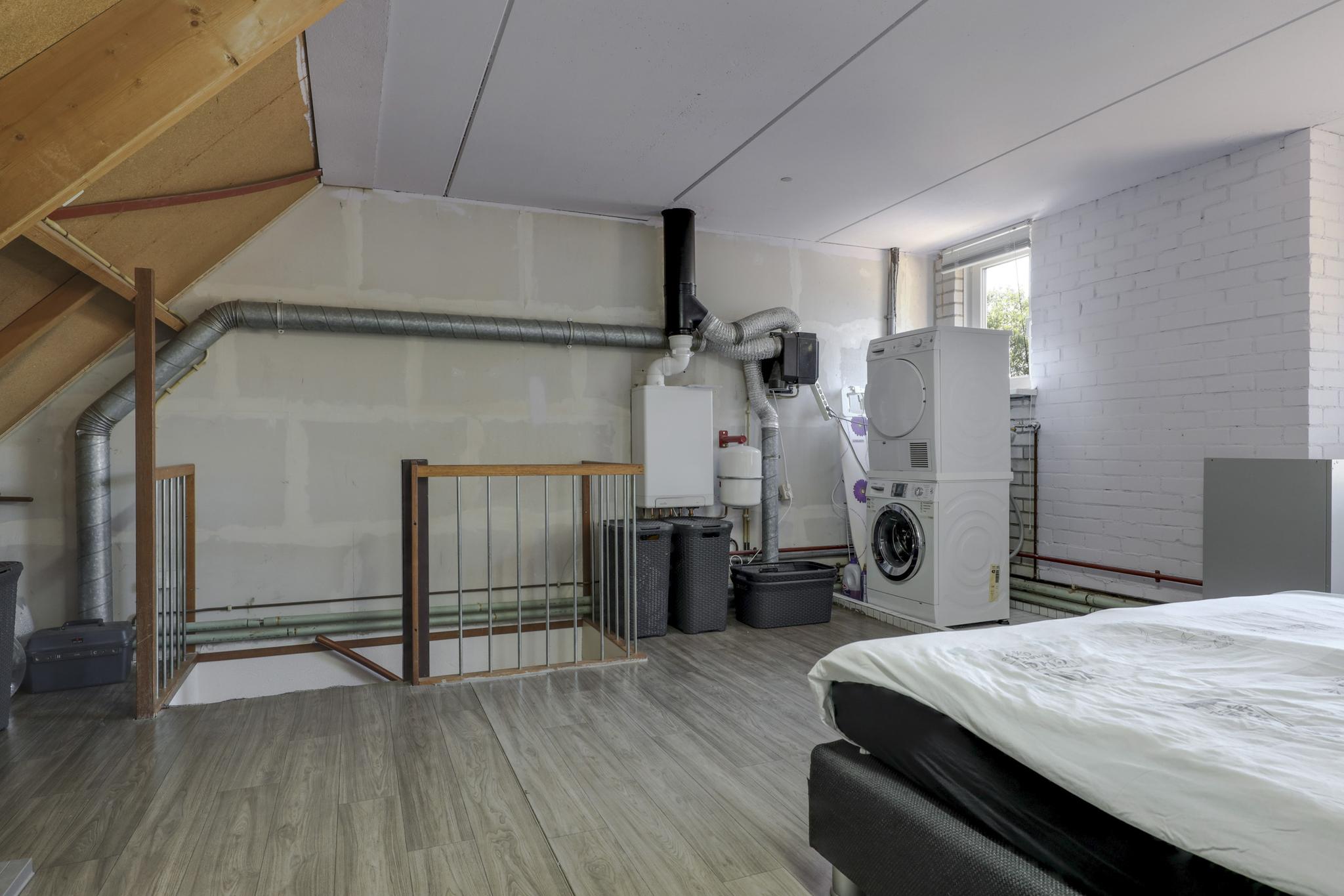 Via de vaste trapopgang bereiken we de 2e verdieping. Deze verdieping is verrassend ruim. In de huidige setting betreft dit een grote ruimte, uiteraard is deze ruimte eenvoudig op te delen in een slaapkamer en een voorzolder. Doordat de voorgevel recht omhoogloopt heb je hier veel ruimte waardoor de extra slaapkamer geen kleine ruimte betreft. In de hoek tref je hier de opstelling van de cv-ketel (huur) en de mechanische ventilatie-unit. Ook zijn hier de aansluitingen voor de wasmachine en wasdroger te vinden.