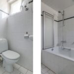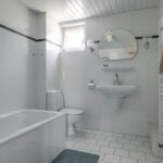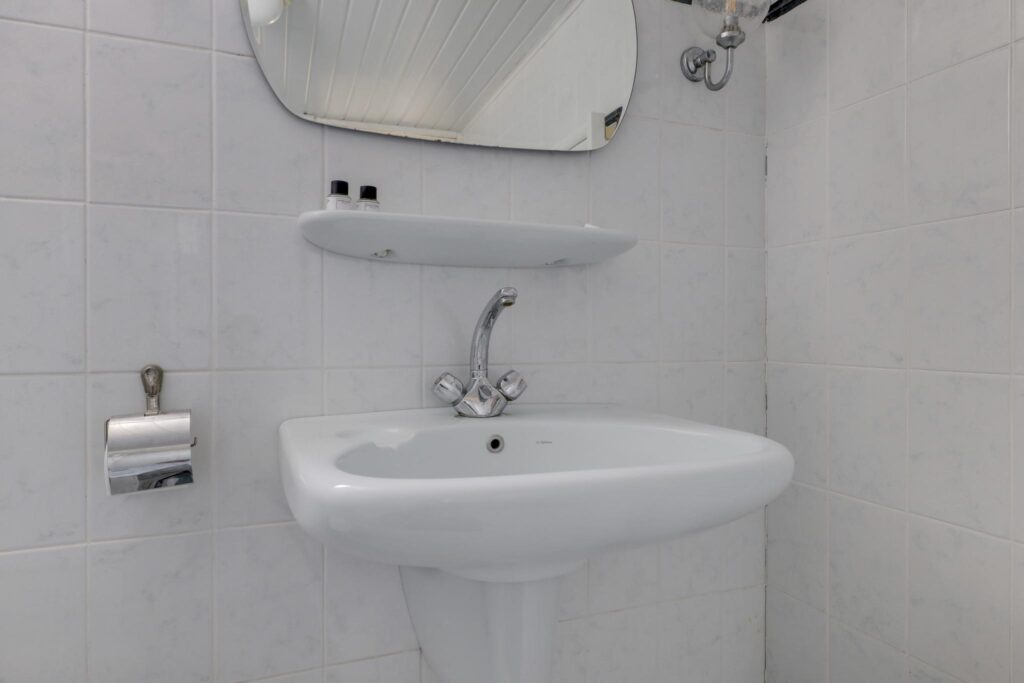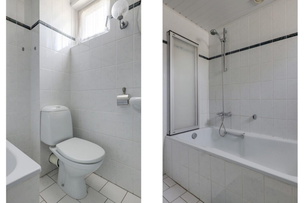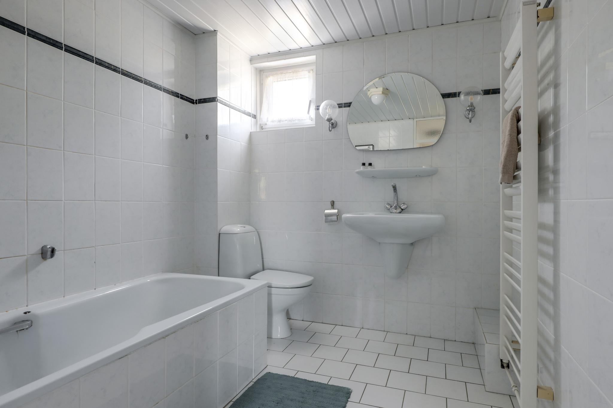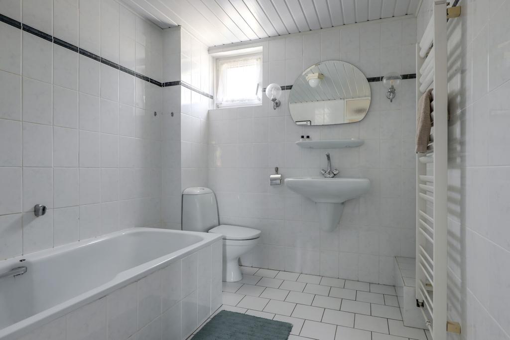 Aan de voorzijde van de woning is de badkamer gelegen. De badkamer is neutraal ingericht en voorzien van licht tegelwerk. Een ligbad/douche combinatie is aanwezig, alsmede een wastafel met planchet en een 2e toilet. Ook de handdoekradiator ontbreekt niet. Een hooggeplaatst raam biedt daglichtinval en tevens een ventilatiemogelijkheid. Ventileren is ook mogelijk middels de mechanische ventilatie.