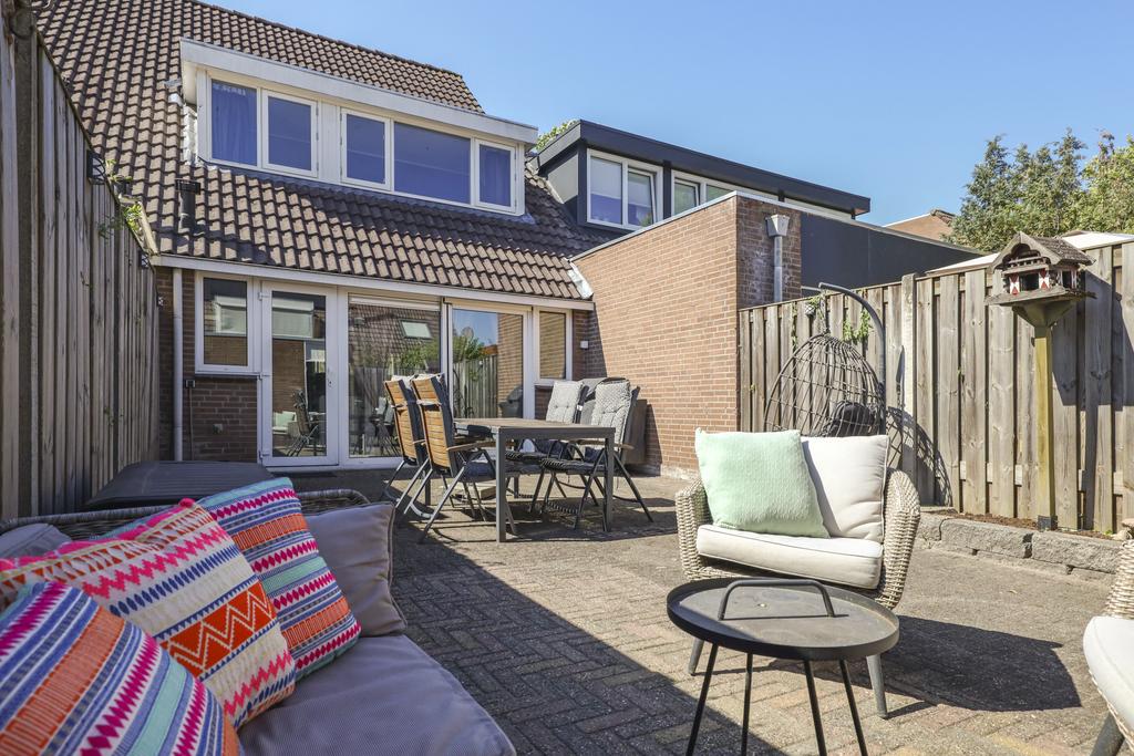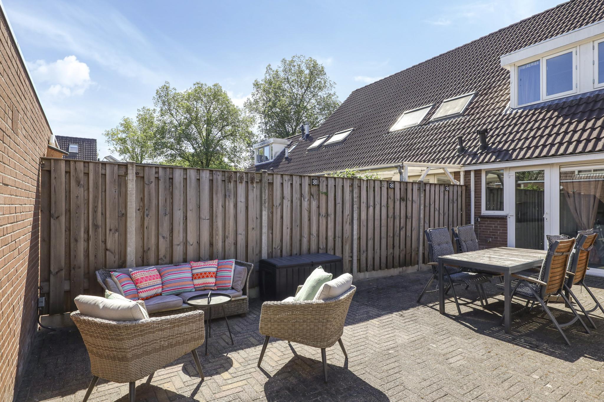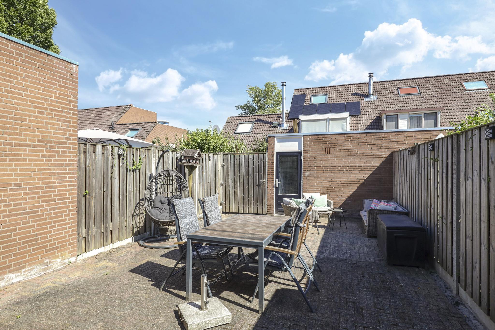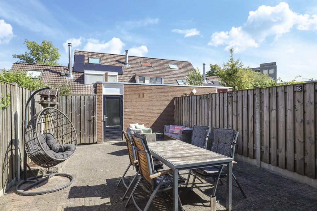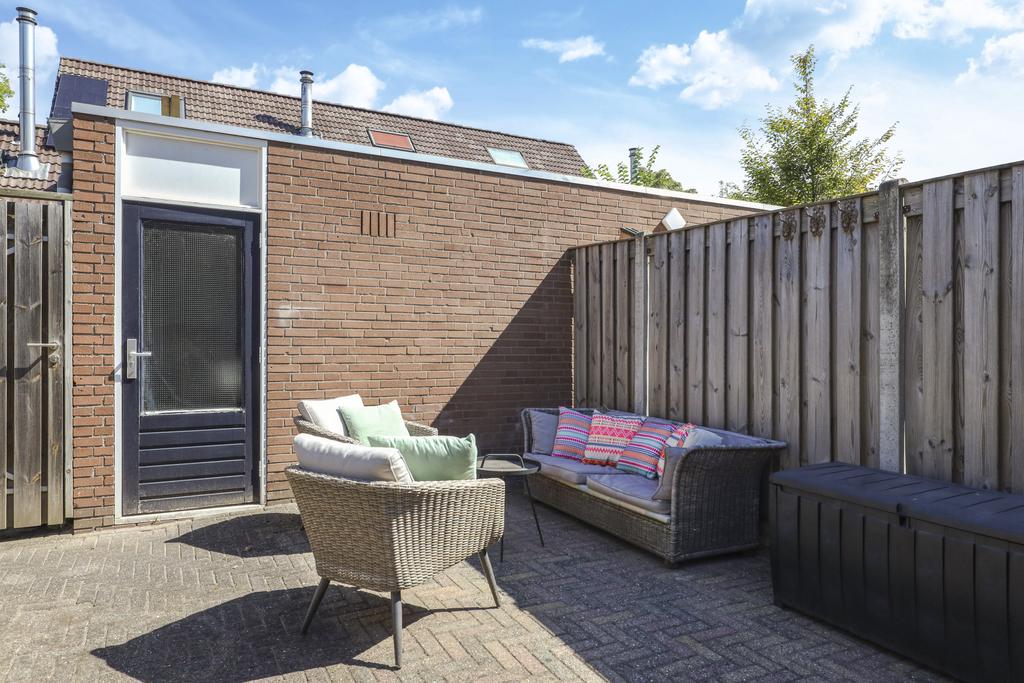Via de schuifpui is de achtertuin te bereiken. De tuin heeft een onderhoudsvriendelijk karakter en is ingedeeld met een groot terras. Met gemak kan je hier meerdere tuinsets kwijt waardoor er verschillende zithoeken worden gecreëerd. Achter in de tuin is een stenen schuur geplaatst. Hier heb je veel praktische opbergruimte voor bijvoorbeeld de fiets en/of motor. Een bredere poort dan gemiddeld maakt dat je eenvoudig met de motor te tuin in kan. De erfafscheidingen zijn degelijk geplaatst met houten schuttingen met betonpalen.