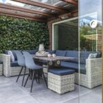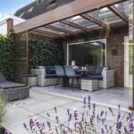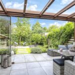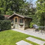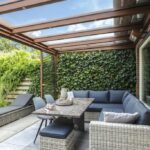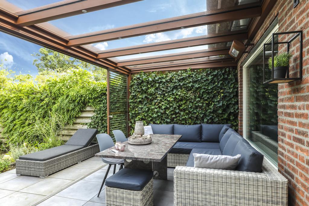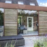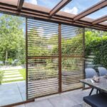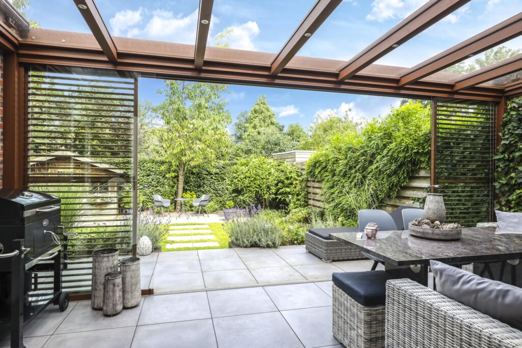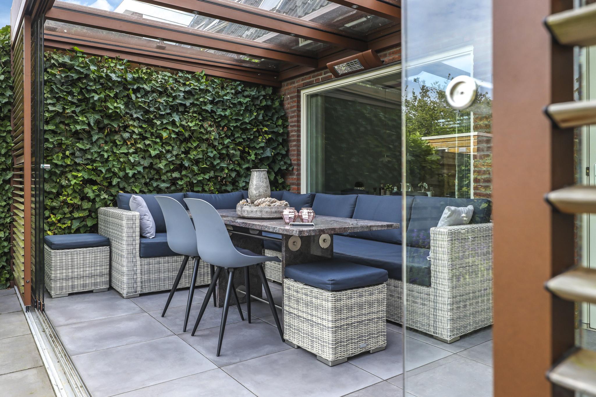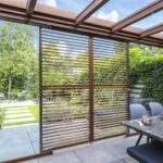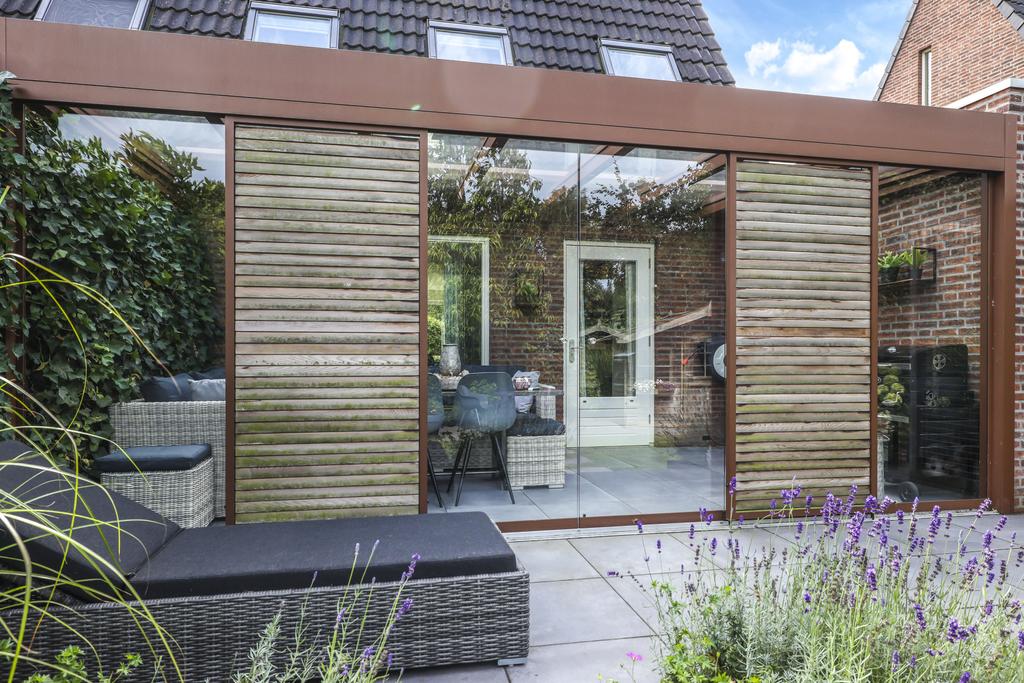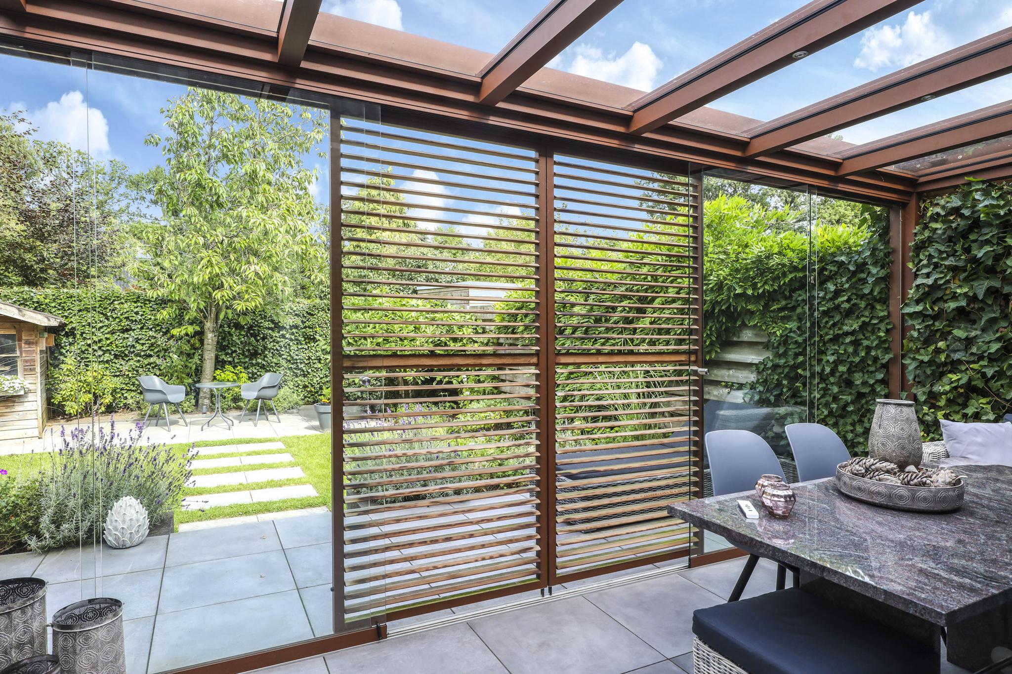 Stijlvolle tuinkamer met glaspanelen en houten shutterlamellen