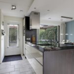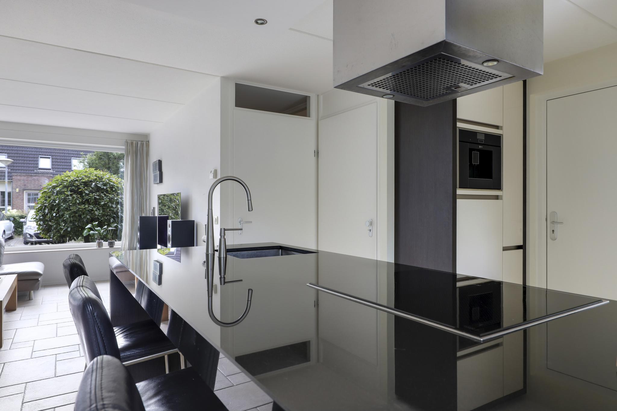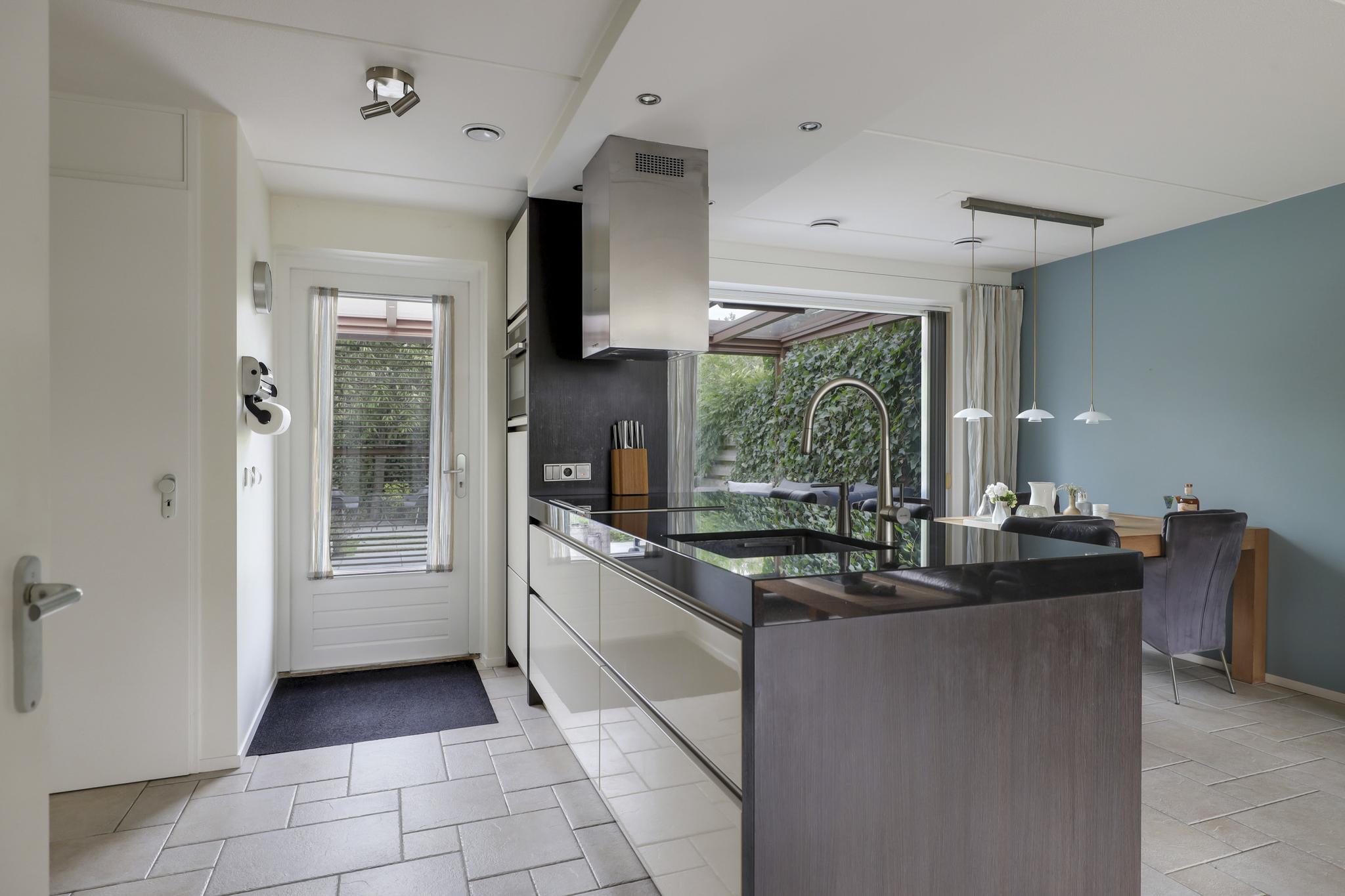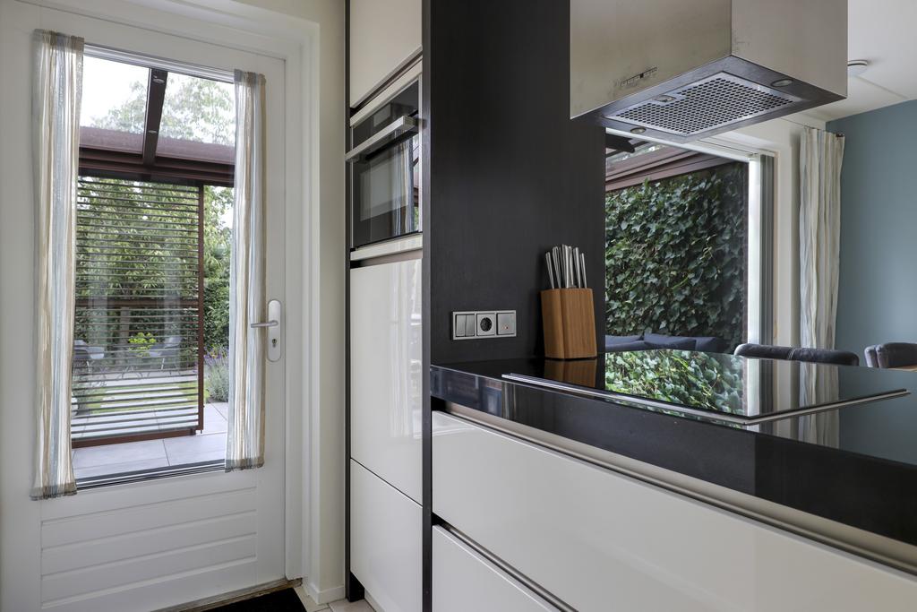 Open keuken met eilandopstelling v.v. inbouwapparatuur en een tuindeur