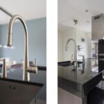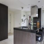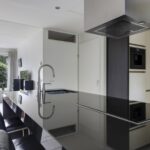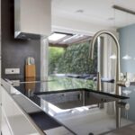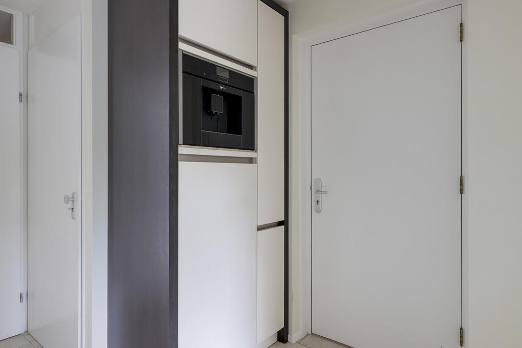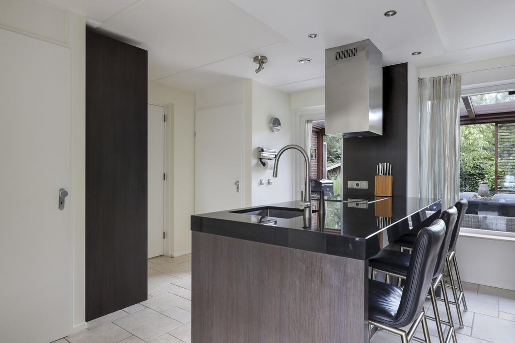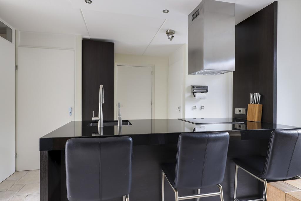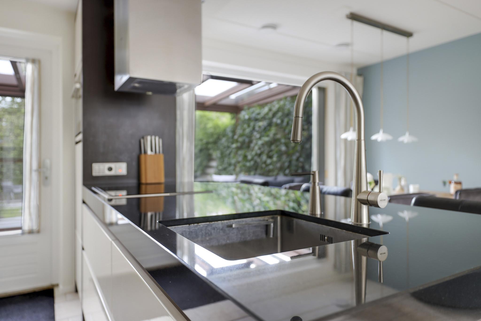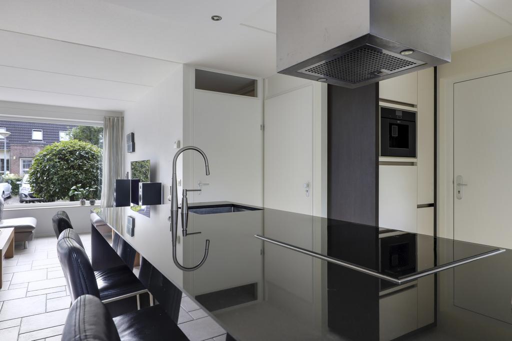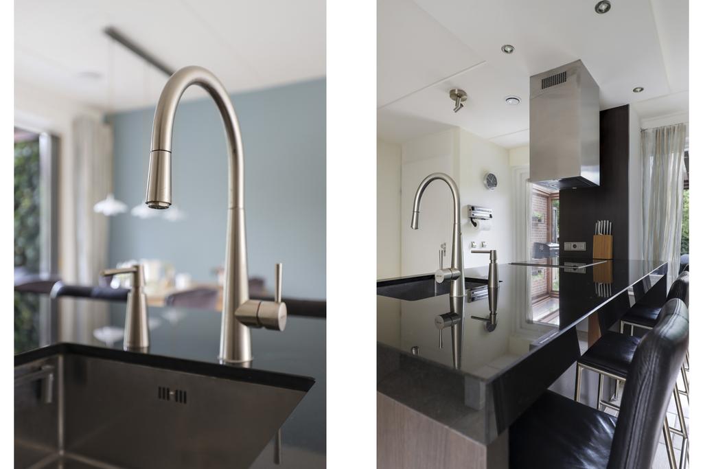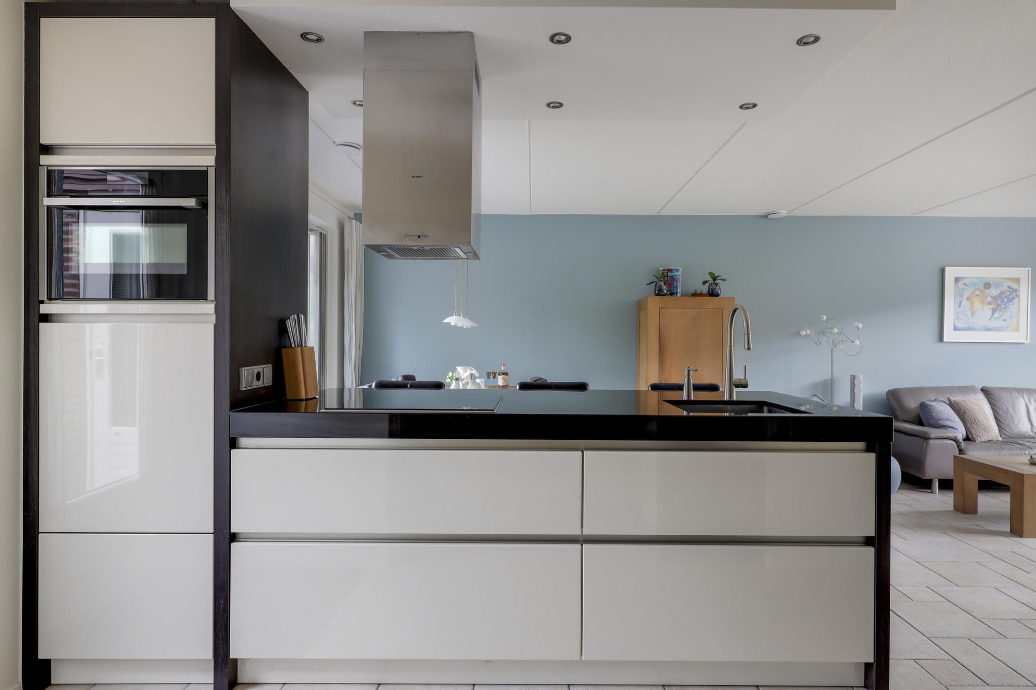 De inbouwapparatuur bestaat uit een 4-pits inductie kookplaat met flexzones, een design afzuiger, een vaatwasser op hoogte v.v. blauwe Ledverlichting, een combi-oven met stoomfunctie, een koelkast en een koffiemachine. En dat allemaal van A-merk apparatuur zoals Neff en Siemens. Ook de kraan mag er zijn (Solitaire) waarbij de kleur aangeeft of dat het water koud (blauw) of warm (rood) is. Er is een zeeppompje ingebouwd en de gootsteen is stijlvol onder het werkblad geplaatst. Dit werkblad is van graniet en heeft een uitzonderlijke dikte wat de keuken een robuuste uitstraling geeft. Brede ladekorven (120cm breed) en inbouwspots in de koof boven het schiereiland maken de keuken compleet. Tevens is er nog een trapkast te vinden waar je de nodige voorraad kwijt kunt. Een tuindeur geeft direct toegang tot de tuinkamer/veranda.