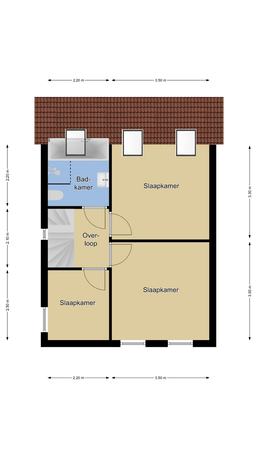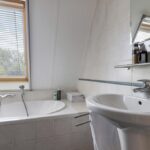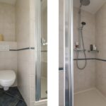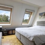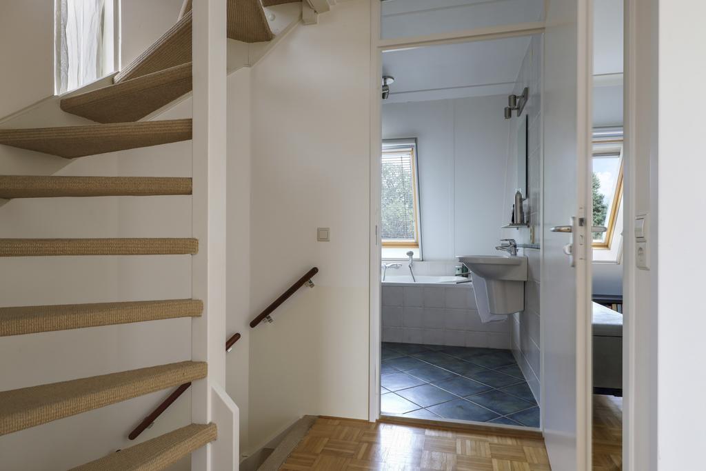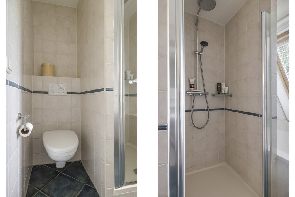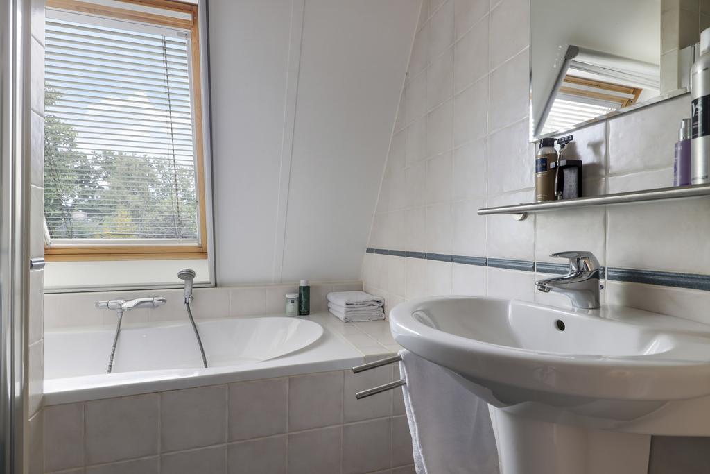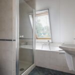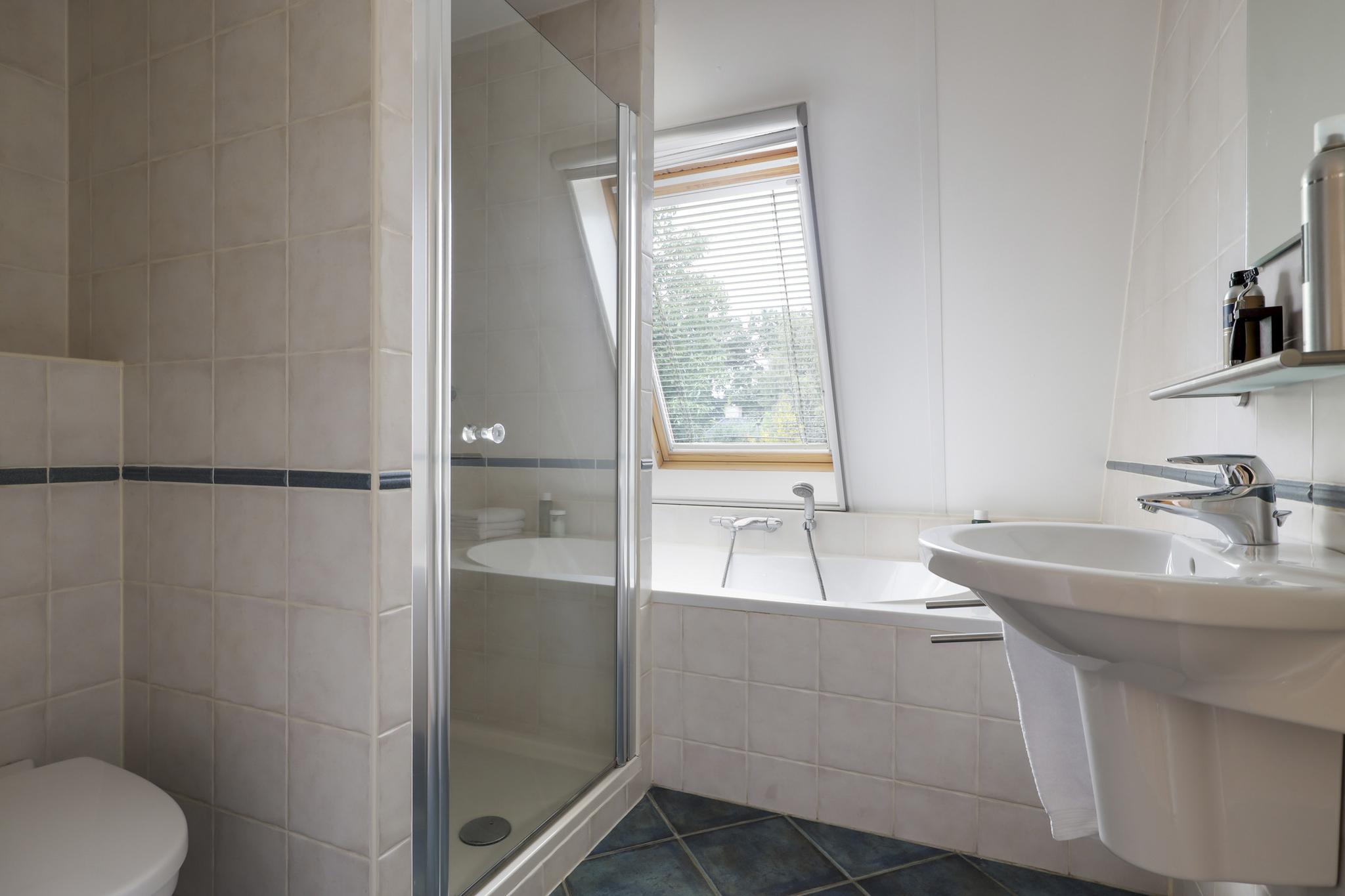 De 4e deur op de overloop is van de badkamer. Hier is de ruimte optimaal ingedeeld waardoor al het wenselijke sanitair aanwezig is. Allereerst het ligbad waar je prima met z’n tweeën in kunt. De douche is voorzien van zowel een rainshower als een handdouche. De wastafel wordt vergezeld door een planchet (schap), een spiegel en spotverlichting. Het 2e toilet is, net als in de hal, zwevend uitgevoerd. Het grote Velux dakvenster zorgt niet alleen voor een prettige lichtinval, maar ook voor een prima ventilatiemogelijkheid. Er is wandverwarming en natuurlijk loopt de vloerverwarming ook hier door waardoor je nooit op een koude tegelvloer hoeft te staan.
