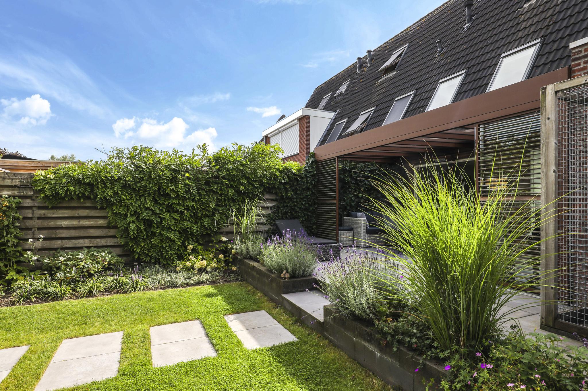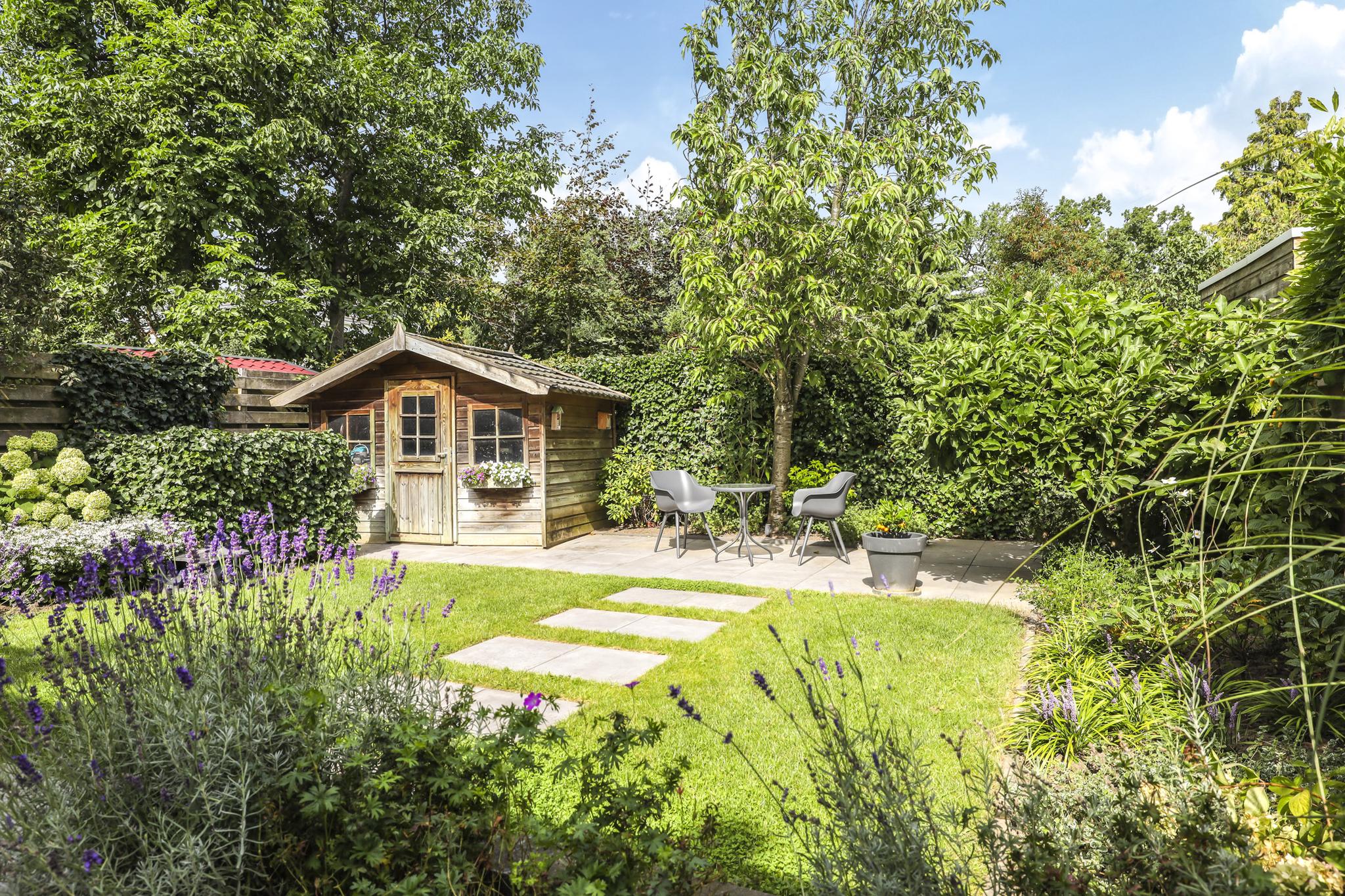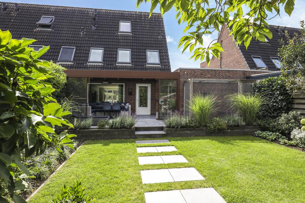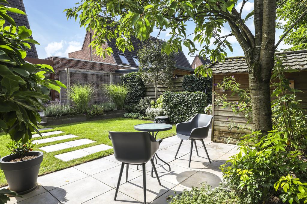 De tuin is in 2019 opnieuw aangelegd waarbij er mooie keuzes zijn gemaakt. De groot formaat, keramische tegels (60×60) uit de tuinkamer lopen door verder de tuin in. Het hoogteverschil is fraai opgelost met een klein ‘trappetje’ die dan weer is voorzien van ledverlichting. Er is een strak gazon aangelegd die dagelijks wordt bijgehouden door een robotmaaier (ter overname). Een Japanse sierkers en een magnolia geven de tuin nog meer kleur. Achterin de tuin is een extra tuinhuis geplaatst (6m2) waar je je tuingereedschap kunt opbergen. Ook is er een hoekje gecreëerd voor de afvalcontainers. En niet onbelangrijk: er is een achterom aanwezig!