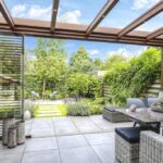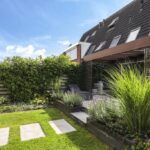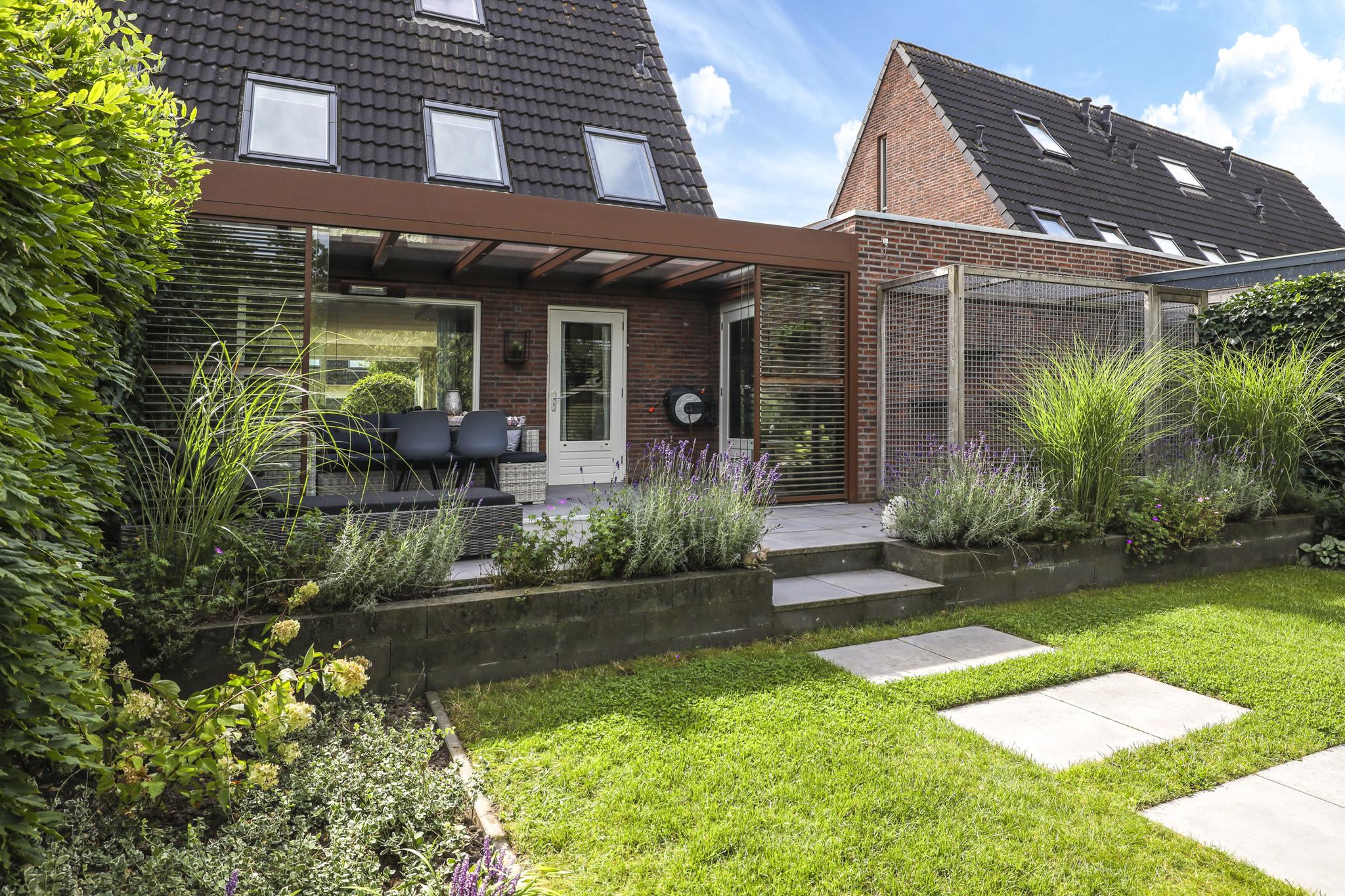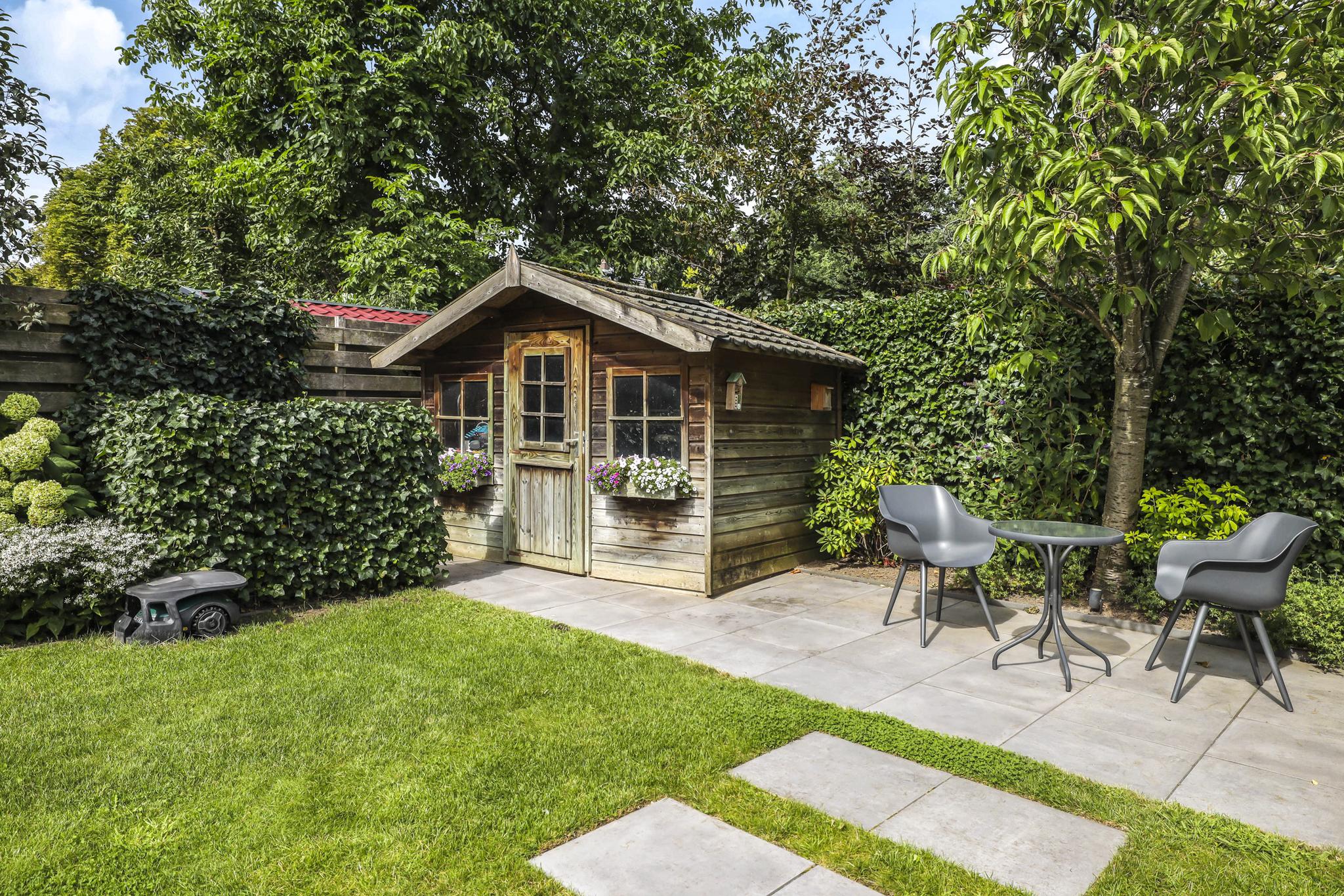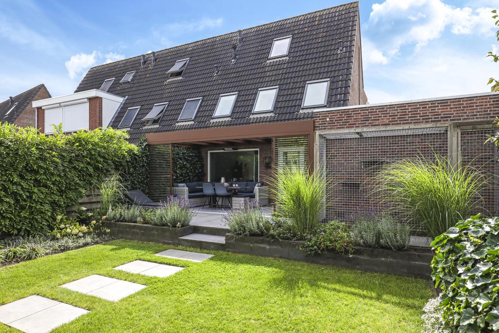 De tuin is in 2019 opnieuw aangelegd waarbij er mooie keuzes zijn gemaakt. De groot formaat, keramische tegels (60×60) uit de tuinkamer lopen door verder de tuin in. Het hoogteverschil is fraai opgelost met een klein ‘trappetje’ die dan weer is voorzien van ledverlichting. Er is een strak gazon aangelegd die dagelijks wordt bijgehouden door een robotmaaier (ter overname). Een Japanse sierkers en een magnolia geven de tuin nog meer kleur. Achterin de tuin is een extra tuinhuis geplaatst (6m2) waar je je tuingereedschap kunt opbergen. Ook is er een hoekje gecreëerd voor de afvalcontainers. En niet onbelangrijk: er is een achterom aanwezig!