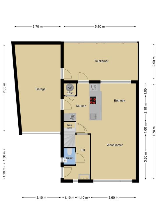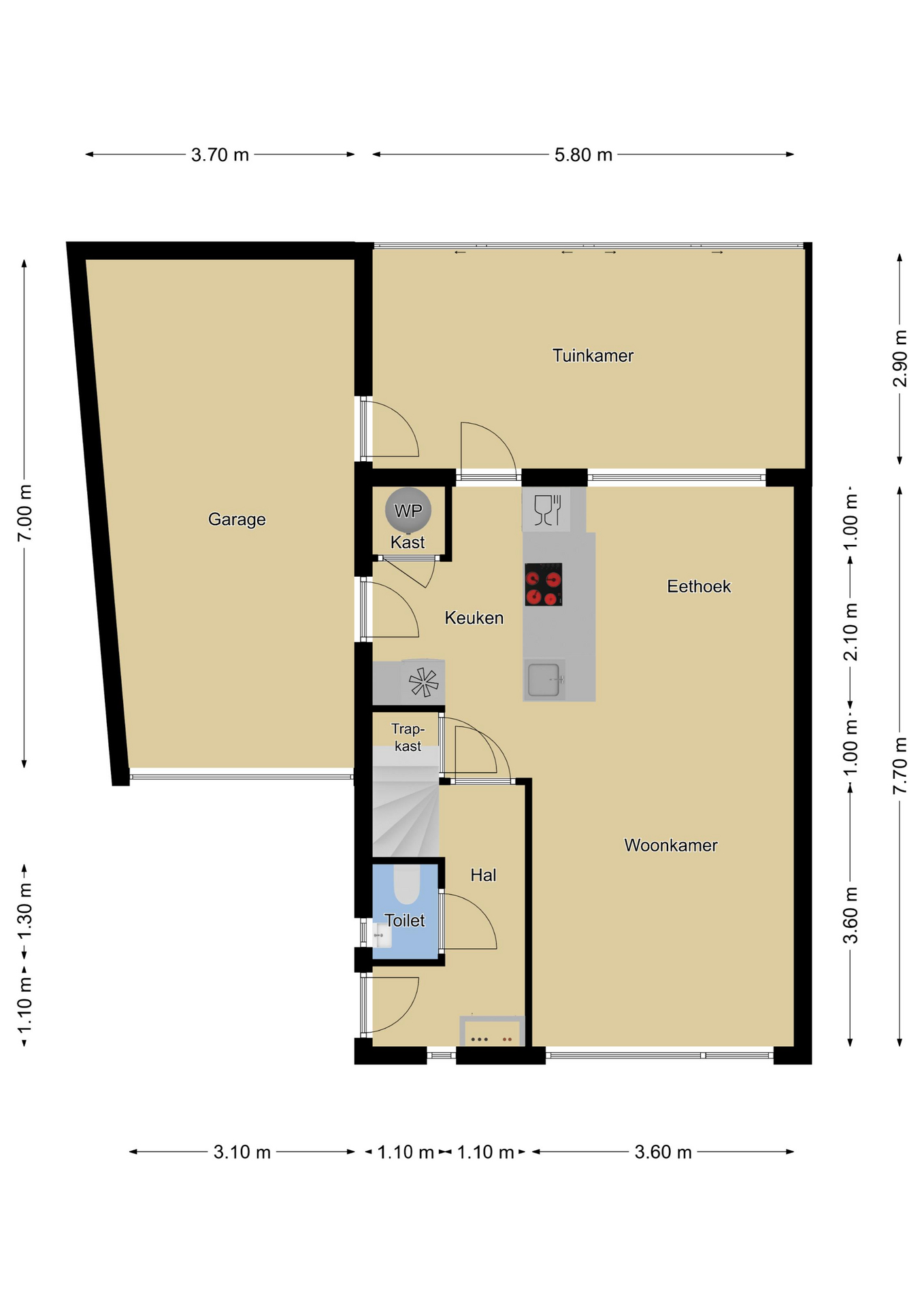 Vanuit de keuken is er een doorloop naar de garage waardoor deze van binnenuit toegankelijk is. Zoek je een woning met een volwaardige garage, dan zal je deze zeker aanspreken. Deze garage is zelfs groter dan gemiddeld doordat die aan de achterzijde in de breedte uitloopt (van 3,1m aan de voorzijde tot 3,7m aan de achterzijde). En dat met een diepte van 7 meter is de garage bijna 24m2 (!) groot. Ook heeft het een mooie hoogtemaat (2,6m) waardoor je bijvoorbeeld een dakkoffer aan het plafond kunt hangen zonder ruimte te verliezen.