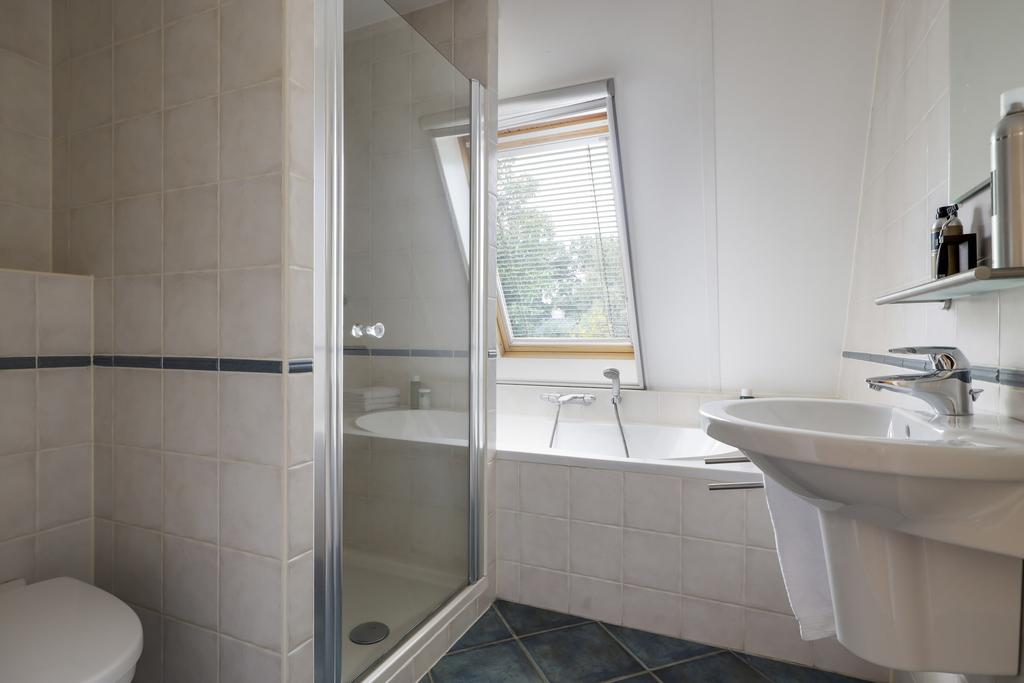 Badkamer met ligbad, douche, wastafel en 2e toilet.