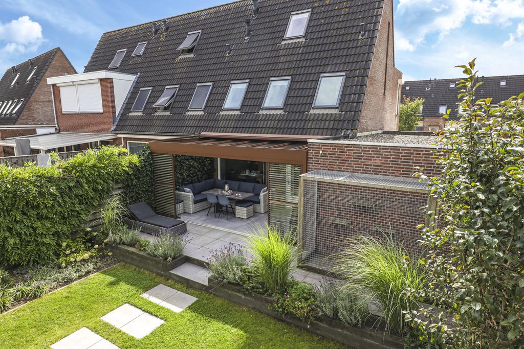 De achtertuin is groter dan de gemiddelde tuin (11m bij 10m) en heeft een opvallend vrije ligging. Er is geen inkijk en voor je gevoel woon je aan een bosrand door de mooie, volwassen bomen. De achtertuin is verzorgd aangelegd met meerdere terrassen (60×60 tegels), een gazon en sfeervolle tuinverlichting (HUE Ledspots) die net als de robotmaaier ter overname worden aangeboden.