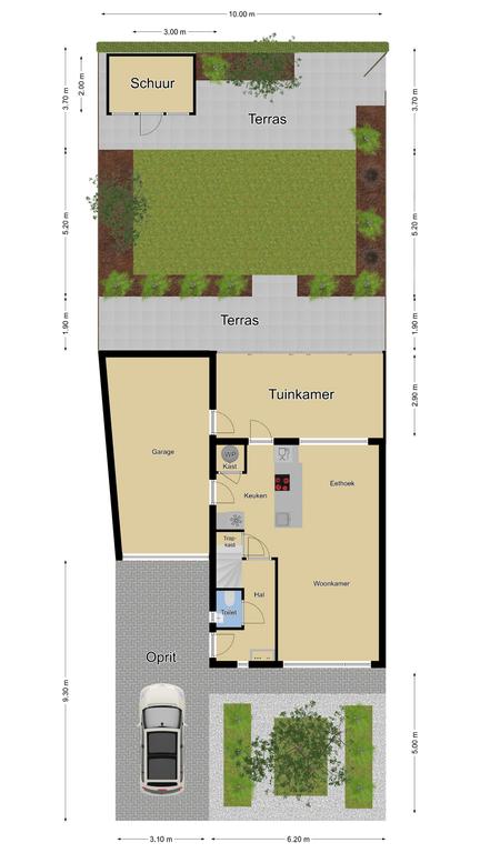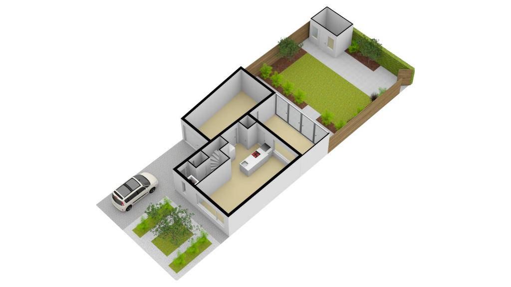 Een auto rijden we tegenwoordig niet snel meer een garage binnen. Om die reden zou je de garage ook kunnen opdelen met aan de voorzijde een inpandige fietsenstalling en aan de achterzijde een werk/hobbykamer. Aan de achterzijde is tevens een extra loopdeur die toegang geeft tot de tuinkamer.
