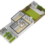 Bij deze woning is het geval dat de kavel naar achteren in de breedte uitloopt. Dat wil zeggen dat de voortuin iets smaller is dan de achtertuin. Dat schuine verloop zie je bijvoorbeeld ook terug in de garage die achterin breder is dan de voorzijde. Dat verloop is in dit geval erg gunstig want daardoor is de achtertuin dus breder dan gemiddeld (10 meter). En als je dan beseft dat de tuin ook nog eens ca. 11 meter diep is (excl. tuinkamer), dan weet je dat het hier om een serieuze achtertuin gaat. Daarbij komt dat de achtertuin grenst aan de tuin van de achterburen die bijzonder groot is en is aangekleed met veel groen. Hierdoor is er nauwelijks tot geen inkijk wat voor een bijzonder vrije ligging zorgt en voor je gevoel de tuin nog groter maakt.