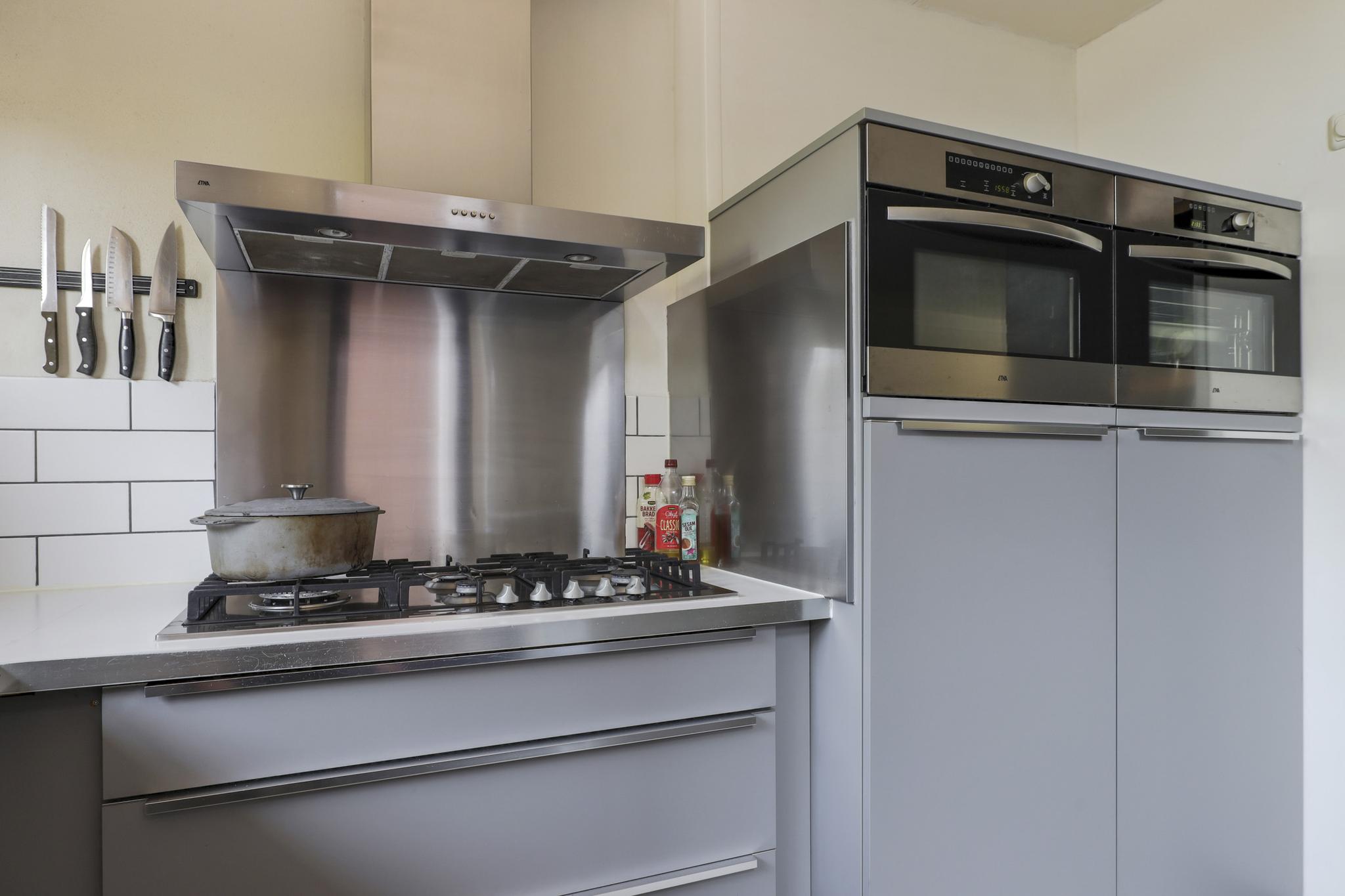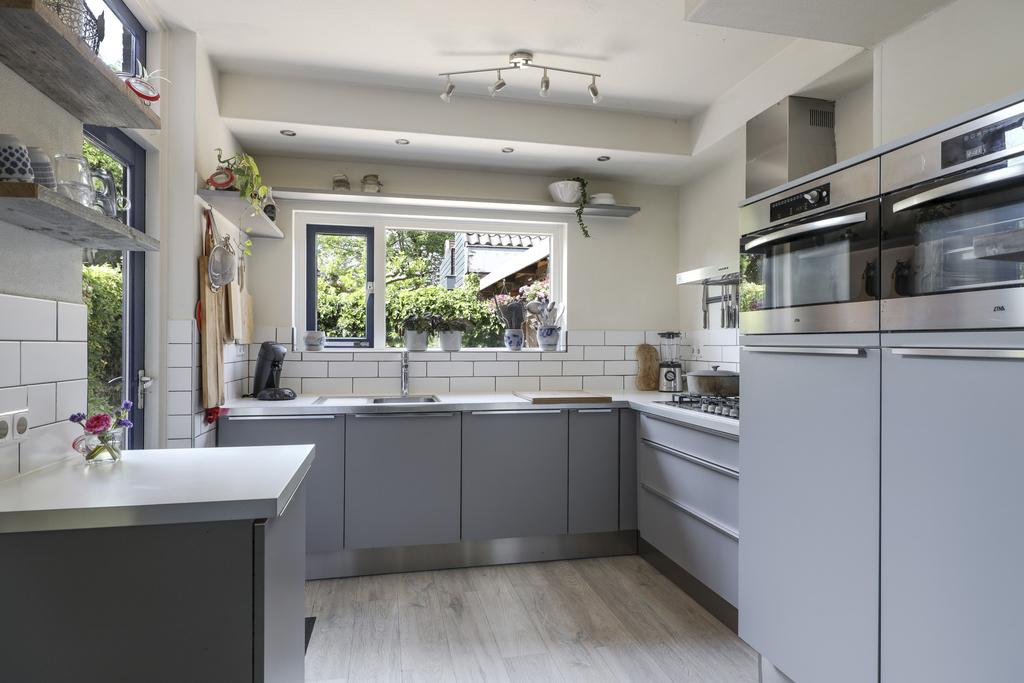 Het lijkt alsof deze woning ter hoogte van de keuken is uitgebouwd, echter is dit hoe de woning voor de bouw is ontworpen. Dit betekent wel dat de keuken groter is dan verwacht waardoor je hier lekker veel ruimte hebt. Geen wonder dat de huidige bewoners hebben gekozen voor een grote hoekkeuken. Alle wenselijke apparatuur is ingebouwd in de keuken, zoals een 5-pits gaskookplaat, een afzuigkap, een vaatwasser, een koelkast, een vriezer, een oven en een combi-oven/magnetron. Door het grote raam kijk je vanaf hier de tuin in. De tuindeur geeft tevens toegang tot de achtertuin.