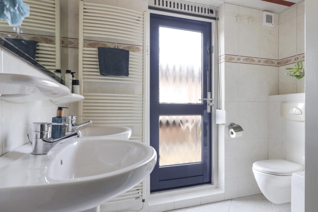 Bij een volwaardige gezinswoning hoort een complete badkamer. De ruimte is neutraal aangekleed met licht tegelwerk. Uiteraard is alle wenselijke sanitair aanwezig, zijnde een ligbad, een inloopdouche, een 2e toilet en een dubbele wastafel. Ook de handdoekradiator en mechanische afzuiging ontbreken hier niet. Vanaf de badkamer heb je tevens toegang tot het balkon.