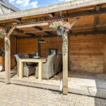 De achtertuin van deze woning is zeer comfortabel aangekleed. In het verlengde van de garage is een brede overkapping geplaatst met stijlvolle houten balken en een vlondervloer. De ruime opzet van de veranda biedt de mogelijkheid om hier niet een, maar zelfs 2 tuin sets te plaatsen. Vanaf de veranda is ook de garage toegankelijk. De tuin is verder bestaat met een groot terras, waarbij de erfafscheidingen van planten een groene sfeer geven.